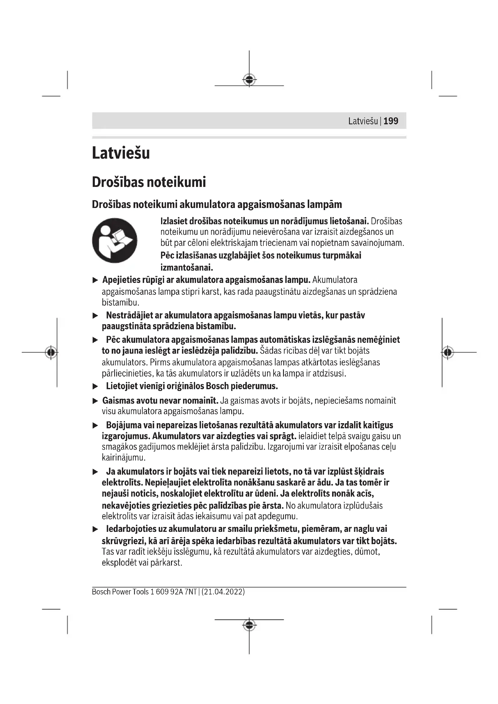 un glabāšanas laikā °C –20...+50 Ieteicamie akumulatori GBA 18V... ProCORE18V... (maks. 8,0 Ah) Ieteicamās uzlādes ierīces GAL 18... GAX 18... GAL 36... A) Samazināta jauda pie temperatūras <0 °C. Apgaismojamo objektu krāsu atdeve var būt izmainīta. Bosch Power Tools 1 609 92A 7NT | (21.04.2022)202 | Latviešu Montāža Akumulatora uzlāde (piederums) u Izmantojiet tikai tehniskajos datos norādītās uzlādes ierīces. Tikai šīs uzlādes ierīces ir piemērotas akumulatora prožektorā izmantoto litija-jonu akumulatora uzlādei. Piezīme: akumulators tiek piegādāts daļēji uzlādētā stāvoklī. Lai izstrādājums spētu darboties ar pilnu jaudu, pirms pirmās lietošanas pilnīgi uzlādējiet akumulatoru, pievienojot to uzlādes ierīcei. Litija-jonu akumulatoru var uzlādēt jebkurā laikā, nebaidoties samazināt tā kalpošanas laiku. Akumulatoram nekaitē arī pārtraukums uzlādes procesā. Elektroniskās elementu aizsardzības "Electronic Cell Protection (ECP)" funkcija aizsargā litija-jonu akumulatoru pret dziļo izlādi. Ja akumulators ir izlādējies, īpaša aizsargshēma automātiski izslēdz apgaismošanas lampu. u Pēc akumulatora apgaismošanas lampas automātiskas izslēgšanās nemēģiniet to no jauna ieslēgt ar ieslēdzēja palīdzību. Šādas rīcības dēļ var tikt bojāts akumulators. Pirms akumulatora apgaismošanas lampas atkārtotas ieslēgšanas pārliecinieties, ka tās akumulators ir uzlādēts un ka lampa ir atdzisusi. Lai izņemtu akumulatoru(1), nospiediet atbrīvošanas taustiņu(2) un izvelciet akumulatoru no lampas. Nedarbojieties ar spēku. Ievērojiet norādījumus par utilizāciju. Akumulatora uzlādes pakāpes indikators Akumulatora uzlādes pakāpes indikatora zaļās LED diodes parāda akumulatora uzlādes pakāpi. Vadoties no drošības apsvērumiem, uzlādes pakāpe ir nolasāma tikai tad, ja lampa ir izslēgta. Lai nolasītu akumulatora uzlādes pakāpi, nospiediet akumulatora uzlādes pakāpes nolasīšanas taustiņu vai . Tas iespējams arī tad, ja akumulators ir izņemts no elektroinstrumenta. Ja pēc akumulatora uzlādes pakāpes nolasīšanas taustiņa nospiešanas neiedegas neviena no uzlādes pakāpes indikatora LED diodēm, tas nozīmē, ka akumulators ir bojāts un to nepieciešams nomainīt. 1 609 92A 7NT | (21.04.2022) Bosch Power ToolsLatviešu | 203 Akumulatora tips GBA 18V... LED diodes Uzlādes pakāpe 3 LED diodes deg pastāvīgi zaļā krāsā 60−100% 2 LED diodes deg pastāvīgi zaļā krāsā 30−60% 1 LED diode deg pastāvīgi zaļā krāsā 5−30% 1 LED diode mirgo zaļā krāsā 0−5% Akumulatora tips ProCORE18V... LED diodes Uzlādes pakāpe 5 LED diode deg pastāvīgi zaļā krāsā 80−100 % 4 LED diode deg pastāvīgi zaļā krāsā 60−80 % 3 LED diodes deg pastāvīgi zaļā krāsā 40−60 % 2 LED diodes deg pastāvīgi zaļā krāsā 20−40 % 1 LED diode deg pastāvīgi zaļā krāsā 5−20 % 1 LED diode mirgo zaļā krāsā 0−5 % Lietošana Uzsākot lietošanu Akumulatora ievietošana Ievietojiet uzlādētu akumulatoru (1) akumulatora stiprinājumā , līdz tas droši fiksējas. Ieslēgšana/izslēgšana Lai ieslēgtu akumulatora lukturi, nospiediet ieslēdzēju/izslēdzēju(4). Lai izslēgtu akumulatora lukturi, vēlreiz nospiediet ieslēdzēju/izslēdzēju(4). Bosch Power Tools 1 609 92A 7NT | (21.04.2022)204 | Latviešu Norādījumi par darbu Āķis piekarināšanai (skatītattēluA) Izmantojot āķi piekarināšanai (5), varat piestiprināt akumulatora apgaismošanas lampas pie kāda objekta. Apgaismojošās galvas noliekšana (skatītattēluB) Ņemot vērā lietojuma nolūku, apgaismojošo galvu(3) var noliekt 6 pozīcijās. Iespējamā lietojuma piemēri: – telpas apgaismošana; – atspīdumu neveidojoša darba telpas apgaismošana; – grīdas apgaismošana. Apkalpošana un apkope Apkalpošana un tīrīšana u Pirms jebkuras darbības ar akumulatora apgaismošanas lampu (piemēram, pirms montāžas, apkalpošanas u.c.), kā arī pirms lampas transportēšanas un novietošanas uzglabāšanai izņemiet no tās akumulatoru. Ieslēdzēja nejauša nospiešana var izraisīt savainojumu. Akumulatora apgaismošanas lampai nav nepieciešama apkalpošana, un tā nesatur daļas, kam būtu vajadzīga apkalpošana vai kas būtu nomaināmas. Lai izvairītos no bojājumiem, tīriet akumulatora apgaismošanas lampas stiklu vienīgi ar sausu, mīkstu audumu. Nelietojiet moduļa apkopei tīrīšanas līdzekļus vai šķīdinātājus. Klientu apkalpošanas dienests un konsultācijas par lietošanu Klientu apkalpošanas dienests atbildēs uz Jūsu jautājumiem par izstrādājumu remontu un apkalpošanu, kā arī par to rezerves daļām. Kopsalikuma attēlus un informāciju par rezerves daļām Jūs varat atrast interneta vietnē: www.bosch-pt.com Bosch konsultantu grupa palīdzēs Jums vislabākajā veidā rast atbildes uz jautājumiem par mūsu izstrādājumiem un to piederumiem. Pieprasot konsultācijas un pasūtot rezerves daļas, noteikti paziņojiet 10zīmju izstrādājuma numuru, kas norādīts uz izstrādājuma marķējuma plāksnītes. Latvijas Republika Robert Bosch SIA Bosch elektroinstrumentu servisa centrs 1 609 92A 7NT | (21.04.2022) Bosch Power ToolsLatviešu | 205 Mūkusalas ielā 97 LV-1004 Rīga Tālr.: 67146262 Telefakss: 67146263 E-pasts: service-pt@lv.bosch.com Papildu klientu apkalpošanas dienesta adreses skatiet šeit: www.bosch-pt.com/serviceaddresses Transportēšana Ieteicamajiem litija jonu akumulatoriem ir piemērojami Bīstamo kravu aprites likuma noteikumi. Lietotājs var transportēt akumulatorus ielu transporta plūsmā bez papildu nosacījumiem. Pārsūtot tos ar trešo personu starpniecību (piemēram, ar gaisa transporta vai citu transporta aģentūru starpniecību), jāievēro īpaši sūtījuma iesaiņošanas un marķēšanas noteikumi. Tāpēc sūtījumu sagatavošanas laikā jāpieaicina bīstamo kravu pārvadāšanas speciālists. Pārsūtiet akumu