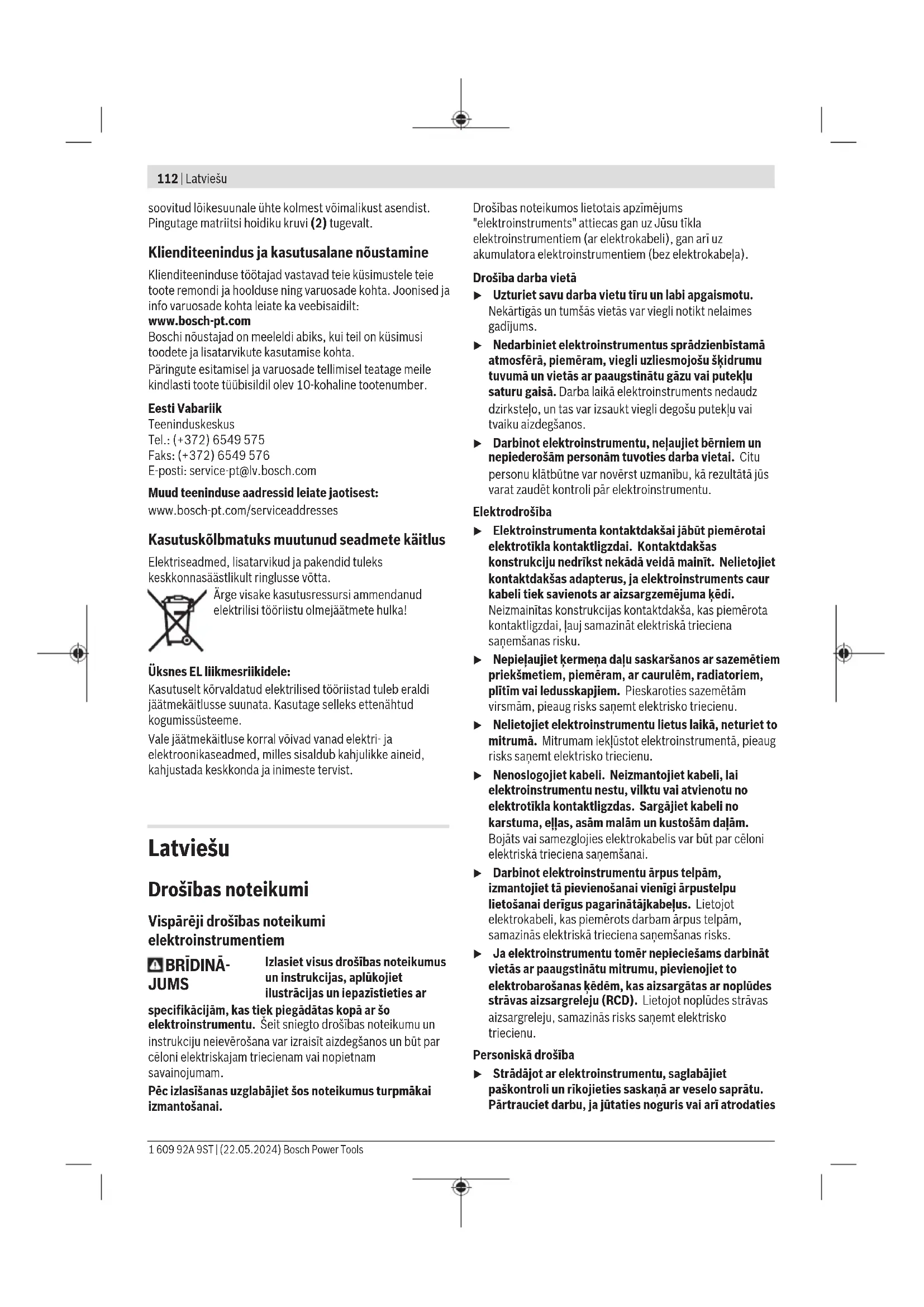 0,7 Alumiinium 200 2,0 Templi õlitamine/jahutamine Templi (6) eluea pikendamiseks peaksite kasutama hea jahutustoimega määrimisvahendit (nt lõikeõli). Kandke määrimisvahendit pleki pealispinnale piki plaanitud lõikejoont. Lõikamine kontuuri või šablooni järgi Sirgeid lõikeid on kergem teha, kui juhtida seadet piki joonlauda. Kontuuride lõikamisel juhtige seadet piki šablooni. Siseväljalõigeteks on vajalik ettepuuritud ava 21mm. Hooldus ja korrashoid Hooldus ja puhastus u Enne mistahes tööde teostamist elektrilise tööriista kallal tõmmake pistik pistikupesast välja. u Seadme laitmatu ja ohutu töö tagamiseks hoidke seade ja selle ventilatsiooniavad puhtad. Kui on vaja vahetada ühendusjuhet, laske seda ohutuskaalutlustel teha Bosch-il või Bosch-i elektriliste tööriistade volitatud klienditeenindusel. Puhastage ja õlitage templit(6) ja matriitsi(7) iga 3 töötunni järel. Kulumise korral vahetage tempel ja matriits õigeaegselt, sest ainult teravad tööriistad tagavad hea lõikejõudluse ja säästavad elektrilist tööriista. Templit(6) ja matriitsi(7) ei tohi järellihvida. Matriitsi vahetamine Keerake rihvelpeakruvi(9) matriitsi hoidikust(5) välja. Eemaldage matriits(7). Puhastage vajaduse korral matriitsi hoidik(5). Asetage uus, hästi õlitatud matriits(7) matriitsi hoidikusse. Seejuures jälgige lameda külje suunda. Keerake rihvelpeakruvi(9) koos pealeasetatud kummirõngaga(8) uuesti oma kohale. Pingutage kruvi sisekuuskantvõtmega kummirõnga takistust ületades (3−4Nm). Templi vahetamine Päästke lahti matriitsi hoidiku kruvi(2) ja tõmmake matriitsi hoidik(5) täielikult korpusest välja. Lükake tempel(6) külgsuunas kinnituskohast välja ja võtke allapoole ära. Asetage uus, hästi õlitatud tempel(6) kinnituskoha soonde ja joondage tsentreeritult. Lükake matriitsi hoidik(5) ettevaatlikult üle templi korpusesse tagasi. Keerake matriitsi hoidik vastavalt Bosch Power Tools 1 609 92A 9ST | (22.05.2024)112 | Latviešu soovitud lõikesuunale ühte kolmest võimalikust asendist. Pingutage matriitsi hoidiku kruvi(2) tugevalt. Klienditeenindus ja kasutusalane nõustamine Klienditeeninduse töötajad vastavad teie küsimustele teie toote remondi ja hoolduse ning varuosade kohta. Joonised ja info varuosade kohta leiate ka veebisaidilt: www.bosch-pt.com Boschi nõustajad on meeleldi abiks, kui teil on küsimusi toodete ja lisatarvikute kasutamise kohta. Päringute esitamisel ja varuosade tellimisel teatage meile kindlasti toote tüübisildil olev 10‑kohaline tootenumber. Eesti Vabariik Teeninduskeskus Tel.: (+372) 6549 575 Faks: (+372) 6549 576 E-posti: service-pt@lv.bosch.com Muud teeninduse aadressid leiate jaotisest: www.bosch-pt.com/serviceaddresses Kasutuskõlbmatuks muutunud seadmete käitlus Elektriseadmed, lisatarvikud ja pakendid tuleks keskkonnasäästlikult ringlusse võtta. Ärge visake kasutusressursi ammendanud elektrilisi tööriistu olmejäätmete hulka! Üksnes ELliikmesriikidele: Kasutuselt kõrvaldatud elektrilised tööriistad tuleb eraldi jäätmekäitlusse suunata. Kasutage selleks ettenähtud kogumissüsteeme. Vale jäätmekäitluse korral võivad vanad elektri- ja elektroonikaseadmed, milles sisaldub kahjulikke aineid, kahjustada keskkonda ja inimeste tervist. Latviešu Drošības noteikumi Vispārēji drošības noteikumi elektroinstrumentiem BRĪDINĀ- JUMS Izlasiet visus drošības noteikumus un instrukcijas, aplūkojiet ilustrācijas un iepazīstieties ar specifikācijām, kas tiek piegādātas kopā ar šo elektroinstrumentu. Šeit sniegto drošības noteikumu un instrukciju neievērošana var izraisīt aizdegšanos un būt par cēloni elektriskajam triecienam vai nopietnam savainojumam. Pēc izlasīšanas uzglabājiet šos noteikumus turpmākai izmantošanai. Drošības noteikumos lietotais apzīmējums "elektroinstruments" attiecas gan uz Jūsu tīkla elektroinstrumentiem (ar elektrokabeli), gan arī uz akumulatora elektroinstrumentiem (bez elektrokabeļa). Drošība darba vietā u Uzturiet savu darba vietu tīru un labi apgaismotu. Nekārtīgās un tumšās vietās var viegli notikt nelaimes gadījums. u Nedarbiniet elektroinstrumentus sprādzienbīstamā atmosfērā, piemēram, viegli uzliesmojošu šķidrumu tuvumā un vietās ar paaugstinātu gāzu vai putekļu saturu gaisā. Darba laikā elektroinstruments nedaudz dzirksteļo, un tas var izsaukt viegli degošu putekļu vai tvaiku aizdegšanos. u Darbinot elektroinstrumentu, neļaujiet bērniem un nepiederošām personām tuvoties darba vietai. Citu personu klātbūtne var novērst uzmanību, kā rezultātā jūs varat zaudēt kontroli pār elektroinstrumentu. Elektrodrošība u Elektroinstrumenta kontaktdakšai jābūt piemērotai elektrotīkla kontaktligzdai. Kontaktdakšas konstrukciju nedrīkst nekādā veidā mainīt. Nelietojiet kontaktdakšas adapterus, ja elektroinstruments caur kabeli tiek savienots ar aizsargzemējuma ķēdi. Neizmainītas konstrukcijas kontaktdakša, kas piemērota kontaktligzdai, ļauj samazināt elektriskā trieciena saņemšanas risku. u Nepieļaujiet ķermeņa daļu saskaršanos ar sazemētiem priekšmetiem, piemēram, ar caurulēm, radiatoriem, plītīm vai ledusskapjiem. Pieskaroties sazemētām virsmām, pieaug risks saņemt elektrisko triecienu. u Nelietojiet elektroinstrumentu lietus laikā, neturiet to mitrumā. Mitrumam iekļūstot elektroinstrumentā, pieaug risks saņemt elektrisko triecienu. u Nenoslogojiet kabeli. Neizmantojiet kabeli, lai elektroinstrumentu nestu, vilktu vai atvienotu no elektrotīkla kontaktligzdas. Sargājiet kabeli no karstuma, eļļas, asām malām un kustošām daļām. Bojāts vai samezglojies elektrokabelis var būt par cēloni elektriskā trieciena saņemšanai. u Darbinot elektroinstrumentu ārpus telpām, izmantojiet tā pievienošanai vienīgi ārpustelpu lietošanai derīgus pagarinātājkabeļus. Lietojot elektrokabeli, kas piemērots darbam ārpus telpām, samazinās elektriskā trieciena sa