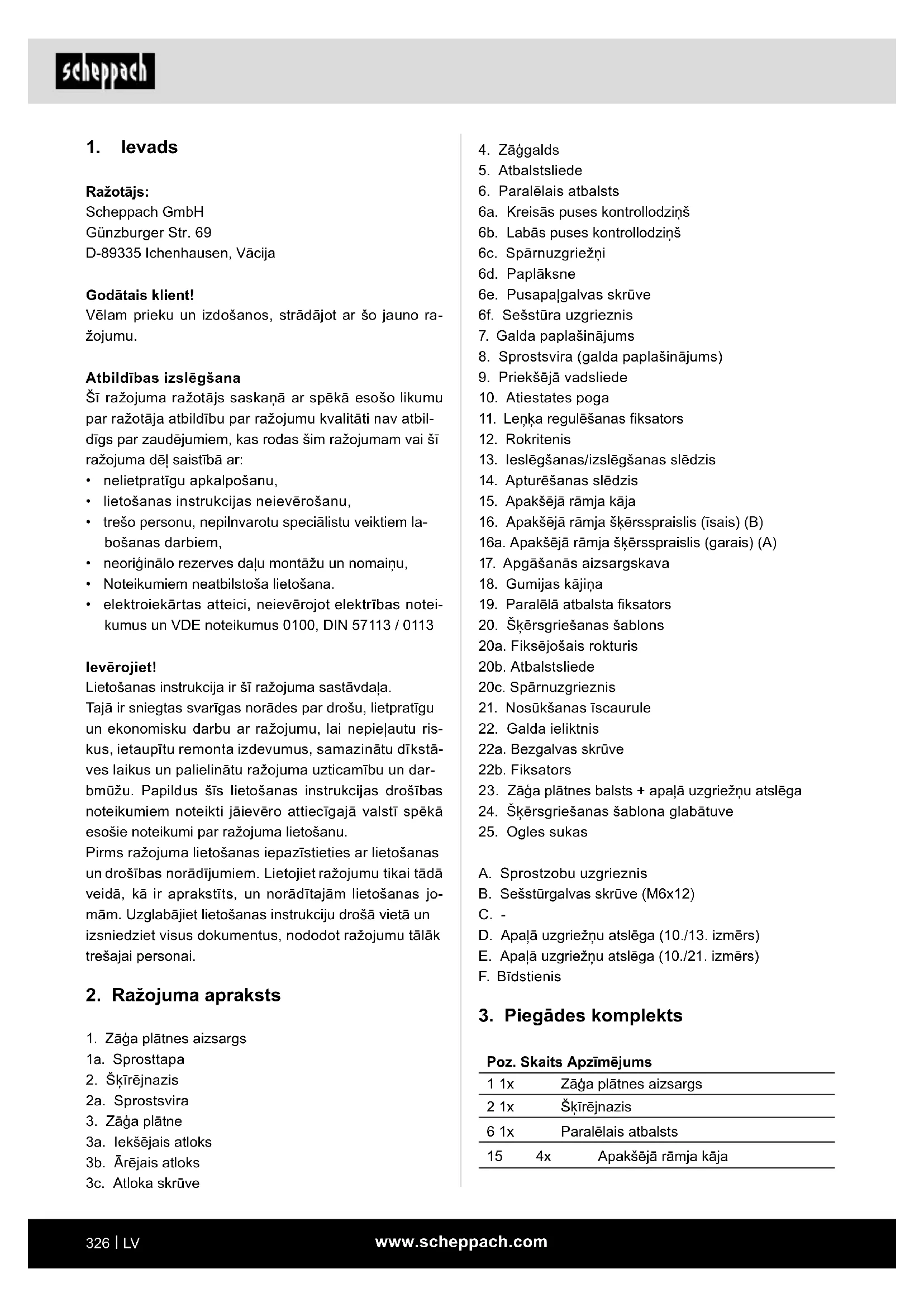 Ražotājs: Scheppach GmbH Günzburger Str. 69 D-89335 Ichenhausen, Vācija Godātais klient! Vēlam prieku un izdošanos, strādājot ar šo jauno ra- žojumu. Atbildības izslēgšana Šī ražojuma ražotājs saskaņā ar spēkā esošo likumu par ražotāja atbildību par ražojumu kvalitāti nav atbil- dīgs par zaudējumiem, kas rodas šim ražojumam vai šī ražojuma dēļ saistībā ar: