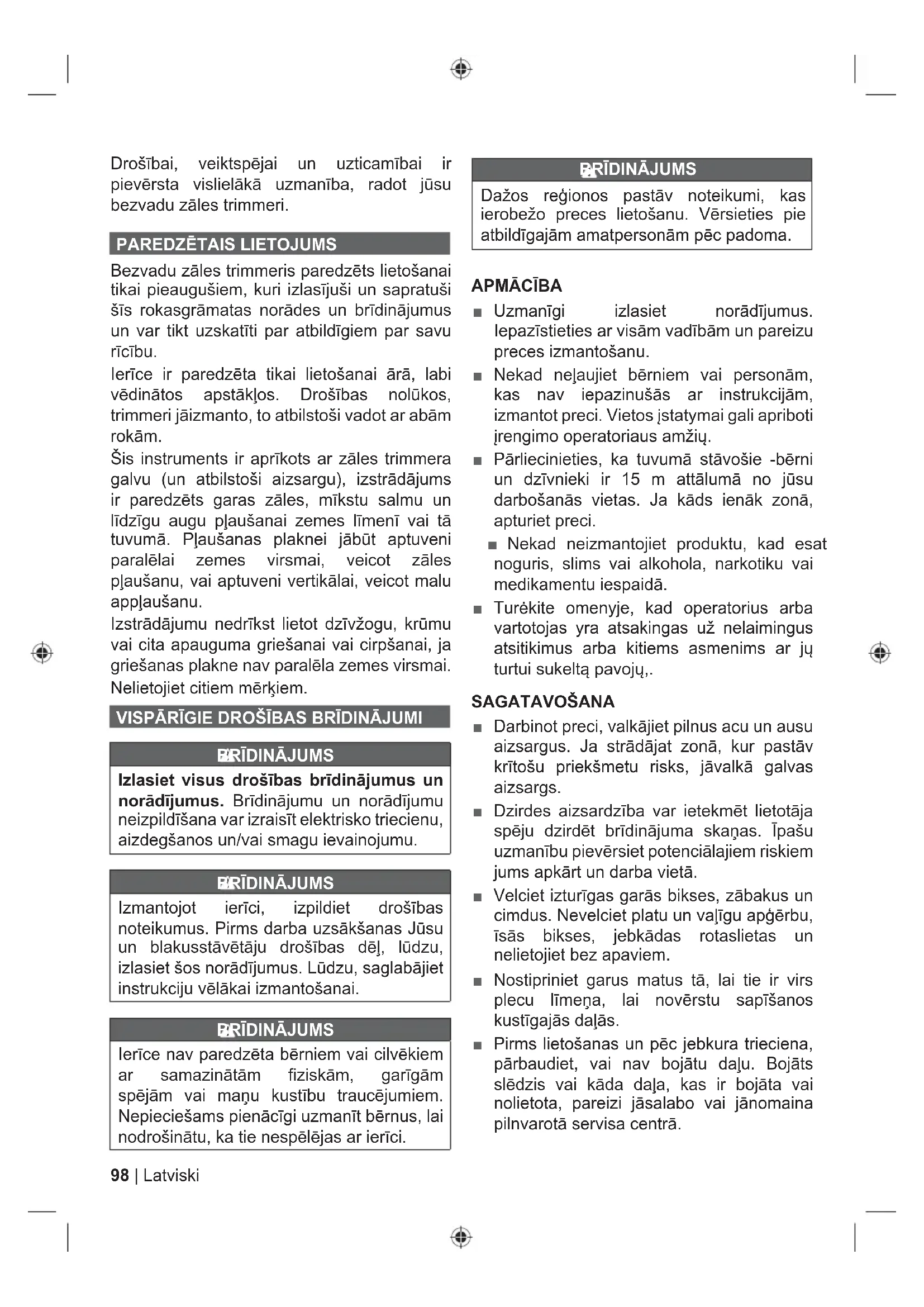 Bezvadu zāles trimmeris paredzēts lietošanai tikai pieaugušiem, kuri izlasījuši un sapratuši šīs rokasgrāmatas norādes un brīdinājumus un var tikt uzskatīti par atbildīgiem par savu rīcību. Ierīce ir paredzēta tikai lietošanai ārā, labi vēdinātos apstākļos. Drošības nolūkos, trimmeri jāizmanto, to atbilstoši vadot ar abām rokām. Šis instruments ir aprīkots ar zāles trimmera galvu (un atbilstoši aizsargu), izstrādājums ir paredzēts garas zāles, mīkstu salmu un līdzīgu augu pļaušanai zemes līmenī vai tā tuvumā. Pļaušanas plaknei jābūt aptuveni paralēlai zemes virsmai, veicot zāles pļaušanu, vai aptuveni vertikālai, veicot malu appļaušanu. Izstrādājumu nedrīkst lietot dzīvžogu, krūmu vai cita apauguma griešanai vai cirpšanai, ja griešanas plakne nav paralēla zemes virsmai. Nelietojiet citiem mērķiem. VISPĀRĪGIE DROŠĪBAS BRĪDINĀJUMI