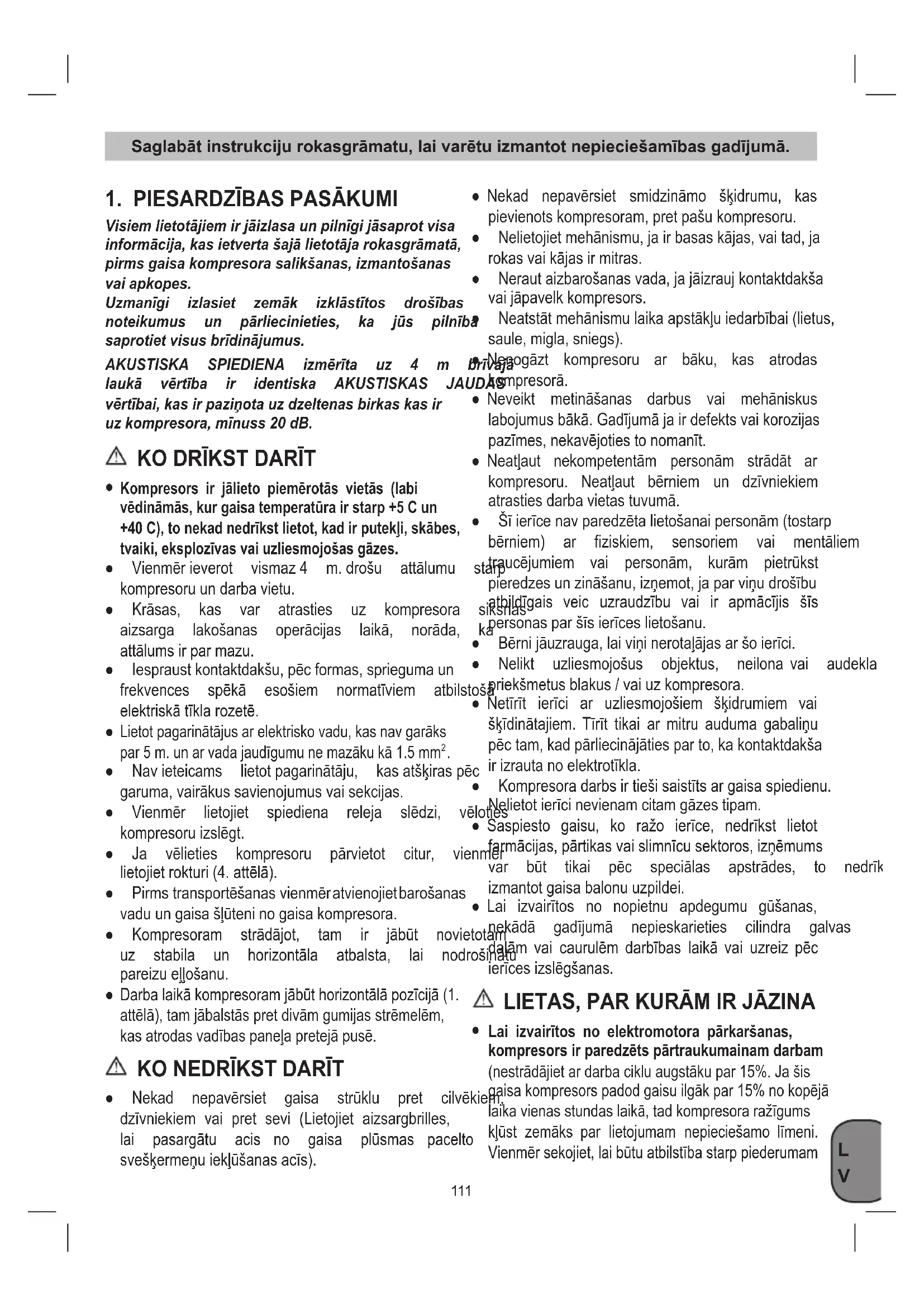 Visiemlietotājiemirjāizlasaunpilnīgijāsaprotvisa informācija,kasietvertašajālietotājarokasgrāmatā, pirmsgaisakompresorasalikšanas,izmantošanas vai apkopes. Uzmanīgi izlasiet zemāk izklāstītos drošības noteikumus un pārliecinieties, ka jūs pilnībā saprotietvisusbrīdinājumus. AKUSTISKA SPIEDIENA izmērīta uz 4 m brīvajā laukā vērtība ir identiska AKUSTISKAS JAUDAS vērtībai,kasirpaziņotauzdzeltenasbirkaskasir uzkompresora,mīnuss20dB.