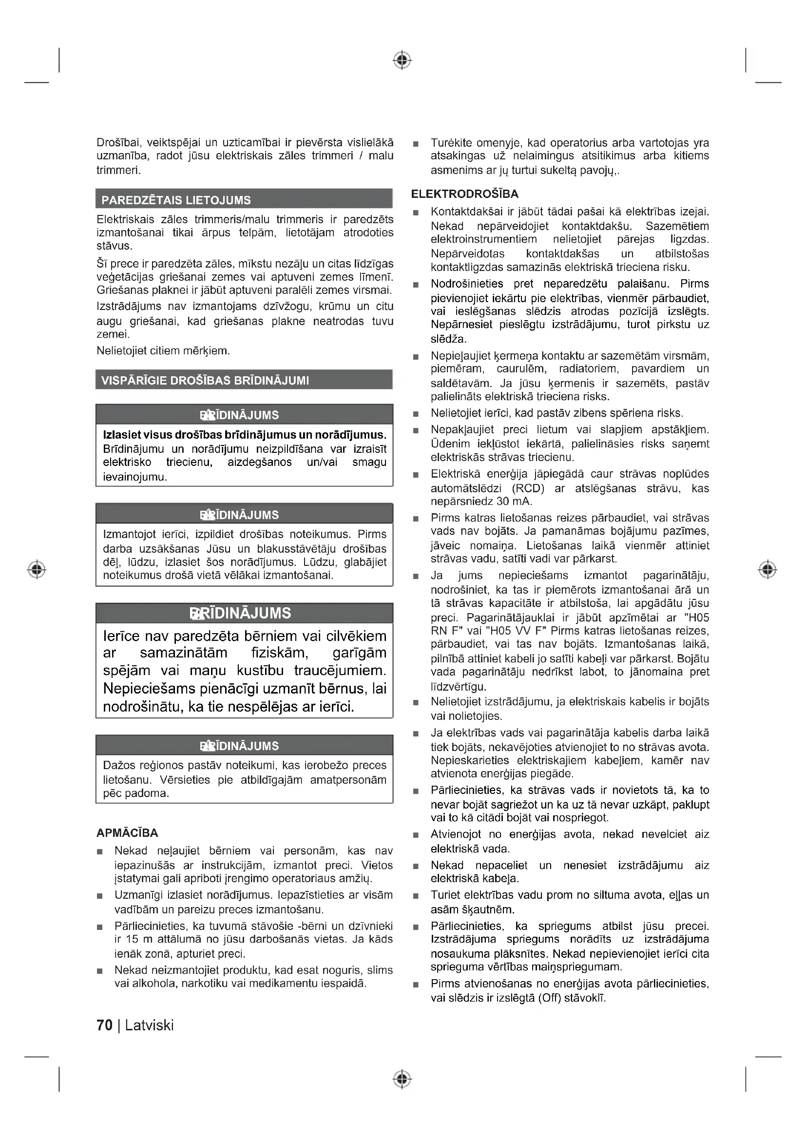 Elektriskais zāles trimmeris/malu trimmeris ir paredzēts izmantošanai tikai ārpus telpām, lietotājam atrodoties stāvus. Šī prece ir paredzēta zāles, mīkstu nezāļu un citas līdzīgas veģetācijas griešanai zemes vai aptuveni zemes līmenī. Griešanas plaknei ir jābūt aptuveni paralēli zemes virsmai. Izstrādājums nav izmantojams dzīvžogu, krūmu un citu augu griešanai, kad griešanas plakne neatrodas tuvu zemei. Nelietojiet citiem mērķiem. VISPĀRĪGIE DROŠĪBAS BRĪDINĀJUMI