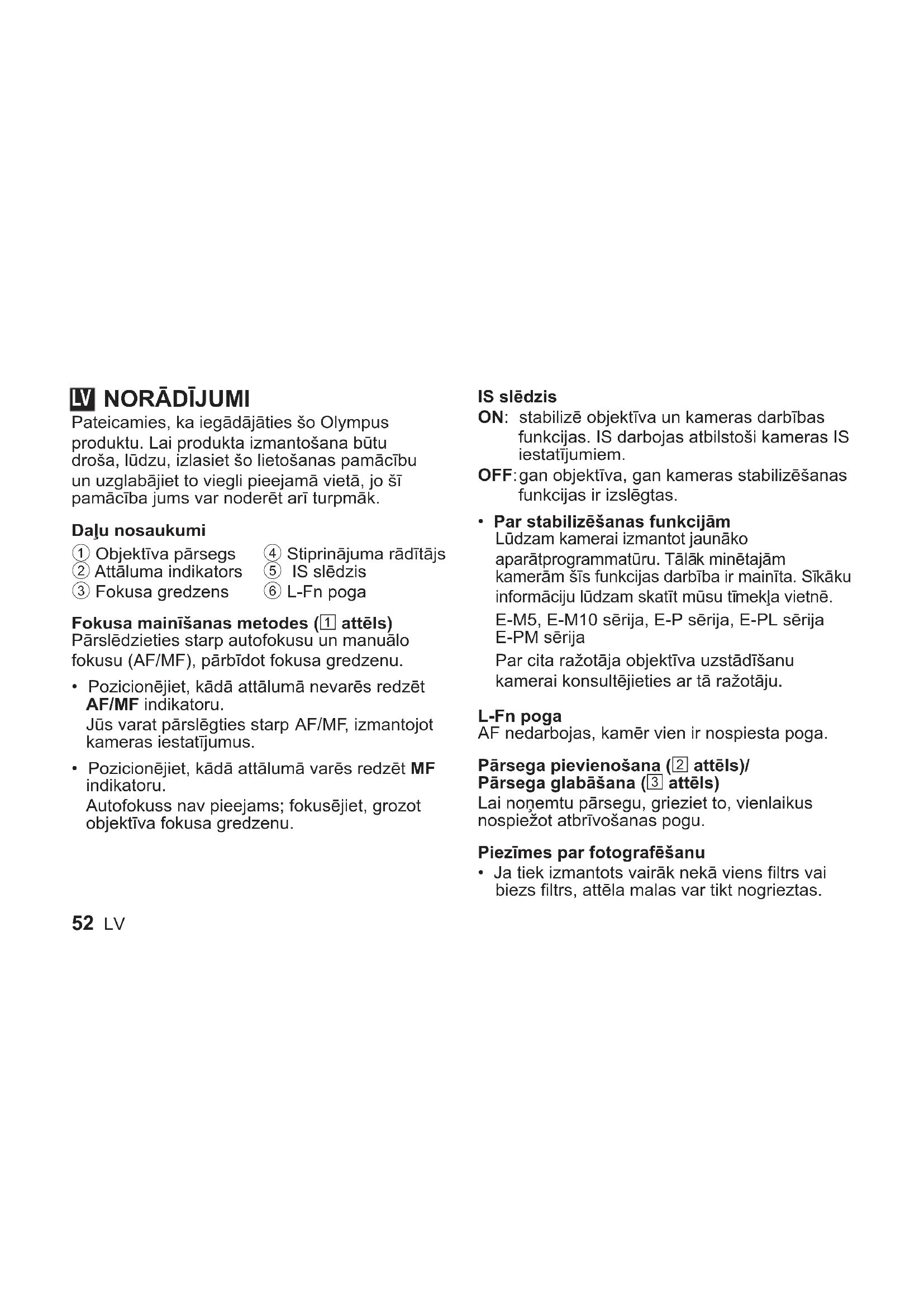 Pateicamies, ka iegādājāties šo Olympus produktu. Lai produkta izmantošana būtu droša, lūdzu, izlasiet šo lietošanas pamācību un uzglabājiet to viegli pieejamā vietā, jo šī pamācība jums var noderēt arī turpmāk. Daļu nosaukumi 1 Objektīva pārsegs 2 Attāluma indikators 3 Fokusa gredzens 4 Stiprinājuma rādītājs 5 IS slēdzis 6 L-Fn poga Fokusa mainīšanas metodes (1 attēls) Pārslēdzieties starp autofokusu un manuālo fokusu (AF/MF), pārbīdot fokusa gredzenu.