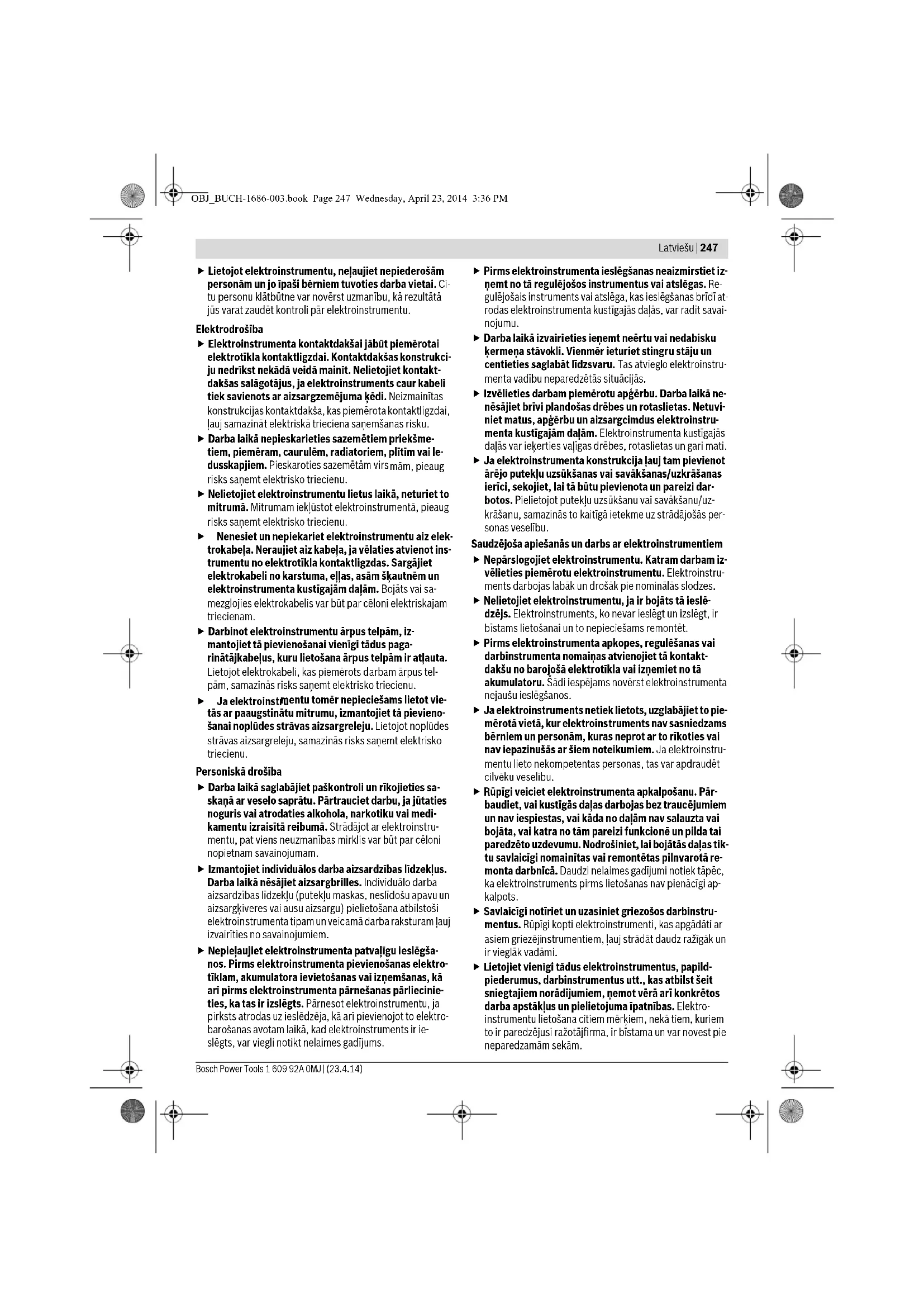 ba laikā elektroinstruments nedaudz dzirksteļo, un tas var izsaukt viegli degošu putekļu vai tvaiku aizdegšanos. BRIDINAJUMS OBJ_BUCH-1686-003.book Page 246 Wednesday, April 23, 2014 3:36 PMLatviešu | 247 Bosch Power Tools 1 609 92A 0MJ | (23.4.14) Lietojot elektroinstrumentu, neļaujiet nepiederošām personām un jo īpaši bērniem tuvoties darba vietai. Ci- tu personu klātbūtne var novērst uzmanību, kā rezultātā jūs varat zaudēt kontroli pār elektroinstrumentu. Elektrodrošība Elektroinstrumenta kontaktdakšai jābūt piemērotai elektrotīkla kontaktligzdai. Kontaktdakšas konstrukci- ju nedrīkst nekādā veidā mainīt. Nelietojiet kontakt- dakšas salāgotājus, ja elektroinstruments caur kabeli tiek savienots ar aizsargzemējuma ķēdi. Neizmainītas konstrukcijas kontaktdakša, kas piemērota kontaktligzdai, ļauj samazināt elektriskā trieciena saņemšanas risku. Darba laikā nepieskarieties sazemētiem priekšme- tiem, piemēram, caurulēm, radiatoriem, plītīm vai le- dusskapjiem. Pieskaroties sazemētām virs mām, pieaug risks saņemt elektrisko triecienu. Nelietojiet elektroinstrumentu lietus laikā, neturiet to mitrumā. Mitrumam iekļūstot elektroinstrumentā, pieaug risks saņemt elektrisko triecienu. Nenesiet un nepiekariet elektroinstrumentu aiz elek- trokabeļa. Neraujiet aiz kabeļa, ja vēlaties atvienot ins- trumentu no elektrotīkla kontaktligzdas. Sargājiet elektrokabeli no karstuma, eļļas, asām šķautnēm un elektroinstrumenta kustīgajām daļām. Bojāts vai sa- mezglojies elektrokabelis var būt par cēloni elektriskajam triecienam. Darbinot elektroinstrumentu ārpus telpām, iz- mantojiet tā pievienošanai vienīgi tādus paga- rinātājkabeļus, kuru lietošana ārpus telpām ir atļauta. Lietojot elektrokabeli, kas piemērots darbam ārpus tel- pām, samazinās risks saņemt elektrisko triecienu. Ja elektroinstru