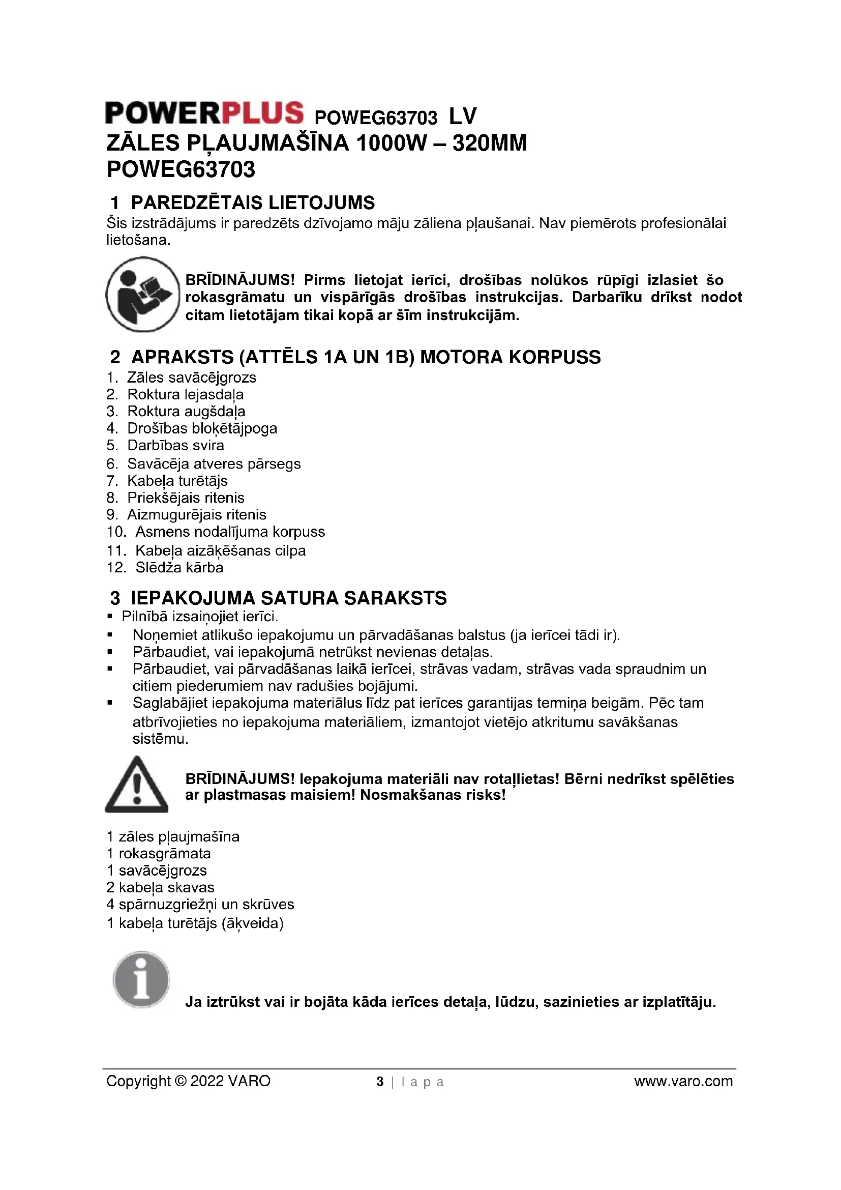 BRĪDINĀJUSM! Nedrīkst ieslēgt ierīci pirms tā ir pilnīgi samontēta! Pirms ierīces ieslēgšanas vienmēr pārbaudiet, vai kabelis nav bojāts. Nedrīkst lietot bojātu elektrības kabeli. Piezīme: bojāts elektrības kabelis rada lielu bīstamību! Cenšoties iedarbināt pļaujmašīnu garā, zālē motors var pārkarst un tikt sabojāts.POWEG63703 LV Copyright © 2022 VARO 10 | l a p a www.varo.com