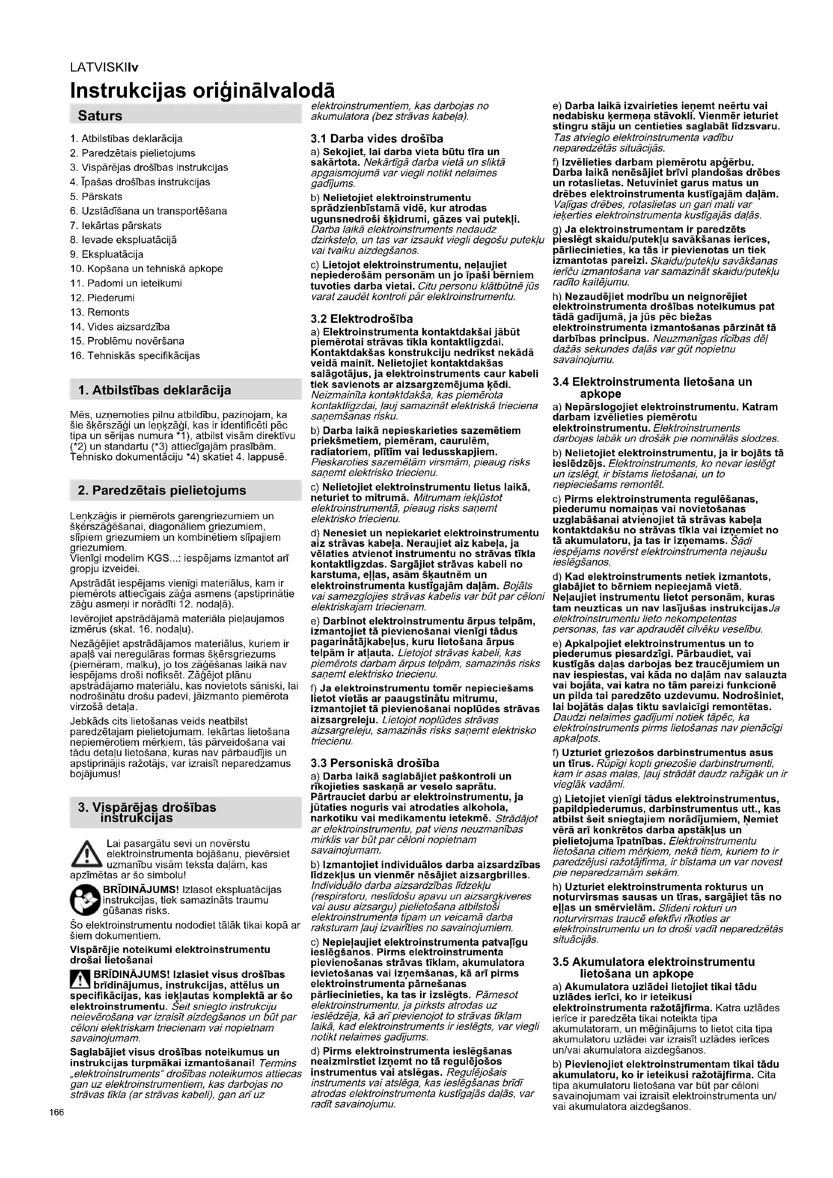 lietošana un apkope a) Akumulatora uzlādei lietojiet tikai tādu uzlādes ierīci, ko ir ieteikusi elektroinstrumenta ražotājfirma. Katra uzlādes ierīce ir paredzēta tikai noteikta tipa akumulatoram, un mēģinājums to lietot cita tipa akumulatoru uzlādei var izraisīt uzlādes ierīces un/vai akumulatora aizdegšanos.b) Pievienojiet elektroinstrumentam tikai tādu akumulatoru, ko ir ieteikusi ražotājfirma. Cita tipa akumulatoru lietošana var būt par cēloni savainojumam vai izraisīt elektroinstrumenta un/vai akumulatora aizdegšanos. Saturs