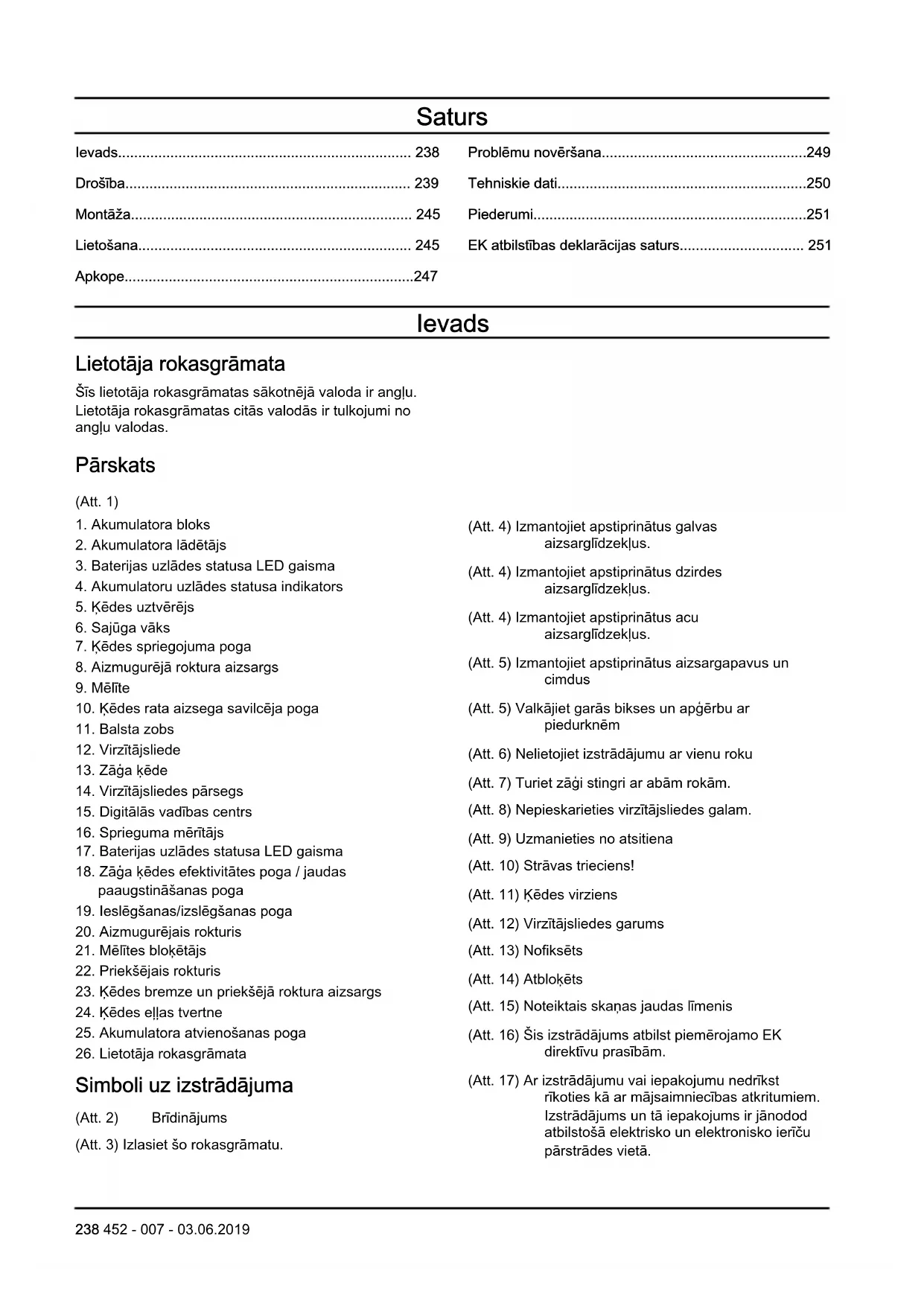 Simboli uz izstrādājuma (Att. 2) Brīdinājums (Att. 3) Izlasiet šo rokasgrāmatu. (Att. 4) Izmantojiet apstiprinātus galvas aizsarglīdzekļus. (Att. 4) Izmantojiet apstiprinātus dzirdes aizsarglīdzekļus. (Att. 4) Izmantojiet apstiprinātus acu aizsarglīdzekļus. (Att. 5) Izmantojiet apstiprinātus aizsargapavus un cimdus (Att. 5) Valkājiet garās bikses un apģērbu ar piedurknēm (Att. 6) Nelietojiet izstrādājumu ar vienu roku (Att. 7) Turiet zāģi stingri ar abām rokām. (Att. 8) Nepieskarieties virzītājsliedes galam. (Att. 9) Uzmanieties no atsitiena (Att. 10) Strāvas trieciens! (Att. 11) Ķēdes virziens (Att. 12) Virzītājsliedes garums (Att. 13) Nofiksēts (Att. 14) Atbloķēts (Att. 15) Noteiktais skaņas jaudas līmenis (Att. 16) Šis izstrādājums atbilst piemērojamo EK direktīvu prasībām. (Att. 17) Ar izstrādājumu vai iepakojumu nedrīkst rīkoties kā ar mājsaimniecības atkritumiem. Izstrādājums un tā iepakojums ir jānodod atbilstošā elektrisko un elektronisko ierīču pārstrādes vietā. 238 452 - 007 - 03.06.2019(Att. 18) Neatstājiet, neglabājiet un nelietojiet lietū vai mitros apstākļos. (Att. 19) Pārstrāde Piezīme: Pārējie uz izstrādājuma norādītie simboli/ uzlīmes attiecas uz citu tirdzniecības nozaru prasībām. Atbildība par izstrādājuma kvalitāti Saskaņā ar likumiem par izstrādājuma kvalitāti mēs neuzņemamies atbildību par bojājumiem, ko radījis mūsu izstrādājums, ja: