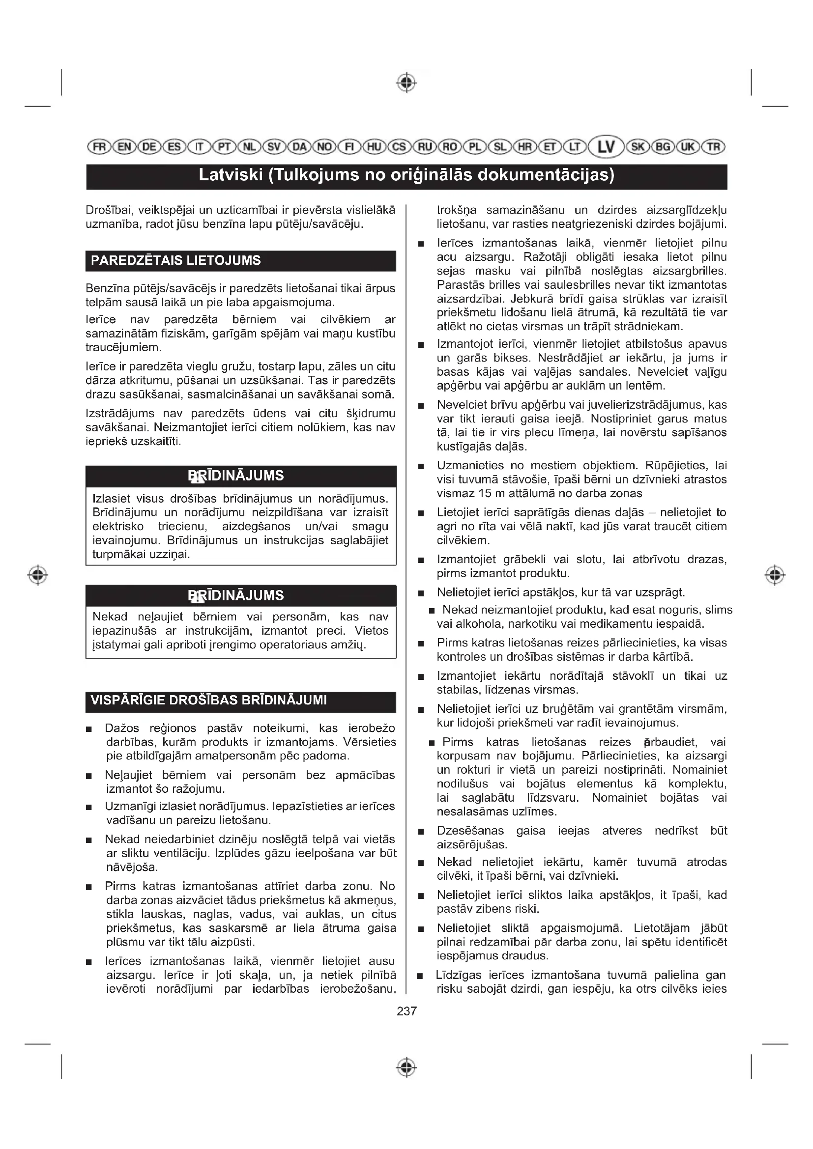 Nekad neļaujiet bērniem vai personām, kas nav iepazinušās ar instrukcijām, izmantot preci. Vietos įstatymai gali apriboti įrengimo operatoriaus amžių. VISPĀRĪGIE DROŠĪBAS BRĪDINĀJUMI ■ Dažos reģionos pastāv noteikumi, kas ierobežo darbības, kurām produkts ir izmantojams. Vērsieties pie atbildīgajām amatpersonām pēc padoma. ■ Neļaujiet bērniem vai personām bez apmācības izmantot šo ražojumu. ■ Uzmanīgi izlasiet norādījumus. Iepazīstieties ar ierīces vadīšanu un pareizu lietošanu. ■ Nekad neiedarbiniet dzinēju noslēgtā telpā vai vietās ar sliktu ventilāciju. Izplūdes gāzu ieelpošana var būt nāvējoša. ■ Pirms katras izmantošanas attīriet darba zonu. No darba zonas aizvāciet tādus priekšmetus kā akmeņus, stikla lauskas, naglas, vadus, vai auklas, un citus priekšmetus, kas saskarsmē ar liela ātruma gaisa plū smu var tikt tālu aizpūsti. ■ Ierīces izmantošanas laikā, vienmēr lietojiet ausu aizsargu. Ierīce ir ļoti skaļa, un, ja netiek pilnībā ievēroti norādījumi par iedarbības ierobežošanu, trokšņa samazināšanu un dzirdes aizsarglīdzekļu lietošanu, var rasties neatgriezeniski dzirdes bojājumi. ■ Ierīces izmantošanas laikā, vienmēr lietojiet pilnu acu aizsargu. Ražotāji obligāti iesaka lietot pilnu sejas masku vai pilnībā noslēgtas aizsargbrilles. Parastās brilles vai saulesbrilles nevar tikt izmantotas aizsardzībai. Jebkurā brīdī gaisa strūklas var izraisīt priekšmetu lidošanu lielā ātrumā, kā rezultātā tie var atlēkt no cietas virsmas un trāp īt strādniekam. ■ Izmantojot ierīci, vienmēr lietojiet atbilstošus apavus un garās bikses. Nestrādājiet ar iekārtu, ja jums ir basas kājas vai vaļējas sandales. Nevelciet vaļīgu apģērbu vai apģērbu ar auklām un lentēm. ■ Nevelciet brīvu apģērbu vai juvelierizstrādājumus, kas var tikt ierauti gaisa ieejā. Nostipriniet garus matus tā, lai tie ir virs plecu līmeņa, lai novērstu sapīšanos kustīgajās daļās. ■ Uzmanieties no mestiem objektiem. Rūpējieties, lai visi tuvumā stāvošie, īpaši bērni un dzīvnieki atrastos vismaz 15 m attālumā no darba zonas ■ Lietojiet ierīci saprātīgā s dienas daļās – nelietojiet to agri no rīta vai vēlā naktī, kad jūs varat traucēt citiem cilvēkiem. ■ Izmantojiet grābekli vai slotu, lai atbrīvotu drazas, pirms izmantot produktu. ■ Nelietojiet ierīci apstākļos, kur tā var uzsprāgt. ■ Nekad neizmantojiet produktu, kad esat noguris, slims vai alkohola, narkotiku vai medikamentu iespaidā. ■ Pirms katras lietošanas reizes pārliecinieties, ka visas kontroles un drošības sistēmas ir darba kārtībā. ■ Izmantojiet iekārtu norādītajā stāvoklī un tikai uz stabilas, līdzenas virsmas. ■ Nelietojiet ierīci uz bruģētām vai grantētām virsmām, kur lidojoši priekšmeti var radīt ievainojumus. ■ Pirms katras lietošanas reizes p ārbaudiet, vai korpusam nav bojājumu. Pārliecinieties, ka aizsargi un rokturi ir vietā un pareizi nostiprināti. Nomainiet nodilušus vai bojātus elementus kā komplektu, lai saglabātu līdzsvaru. Nomainiet bojātas vai nesalasāmas uzlīmes. ■ Dzesēšanas gaisa ieejas atveres nedrīkst būt aizsērējušas. ■ Nekad nelietojiet iekārtu, kamēr tuvumā atrodas cilvēki, it īpaši bērni, vai dzīvnieki. ■ Nelietojiet ierīci sliktos laika apstākļos, it īpaši, kad pastāv zibens riski. ■ Nelietojiet sliktā apgaismojumā. Lietotājam jābūt pilnai redzamībai pār darba zonu, lai spētu identificēt iespējamus draudus. ■ Līdzīgas ierīces izmantošana tuvumā palielina gan risku sabojāt dzirdi, gan iespēju, ka otrs cilvēks ieies238 Latviski (Tulkojums no oriģinālās dokumentācijas) jūsu darba zonā. ■ Slīpumā kājas vienmēr turiet stabilā pozīcijā. Ejiet, nekādā gadījumā neskrieniet. ■ Visu laiku stāviet stingri un stabili. Nepersitempkite. Persitempę galite prarasti pusiausvyrą. ■ Nepieļaujiet roku vai citu ķermeņa daļu, kā arī apģērba iekļūšanu padeves kamerā, izlādes kamerā vai kustīgu detaļu tuvumā. ■ Nekad neizmantojiet ierīci ar bojātiem aizsargiem vai vairogiem vai arī bez drošības ierīcēm, piemēram, gružu savācēja. ■ Nepā rveidojiet ierīci un nelietojiet detaļas un aksesuārus, kurus nav ieteicies ražotājs.