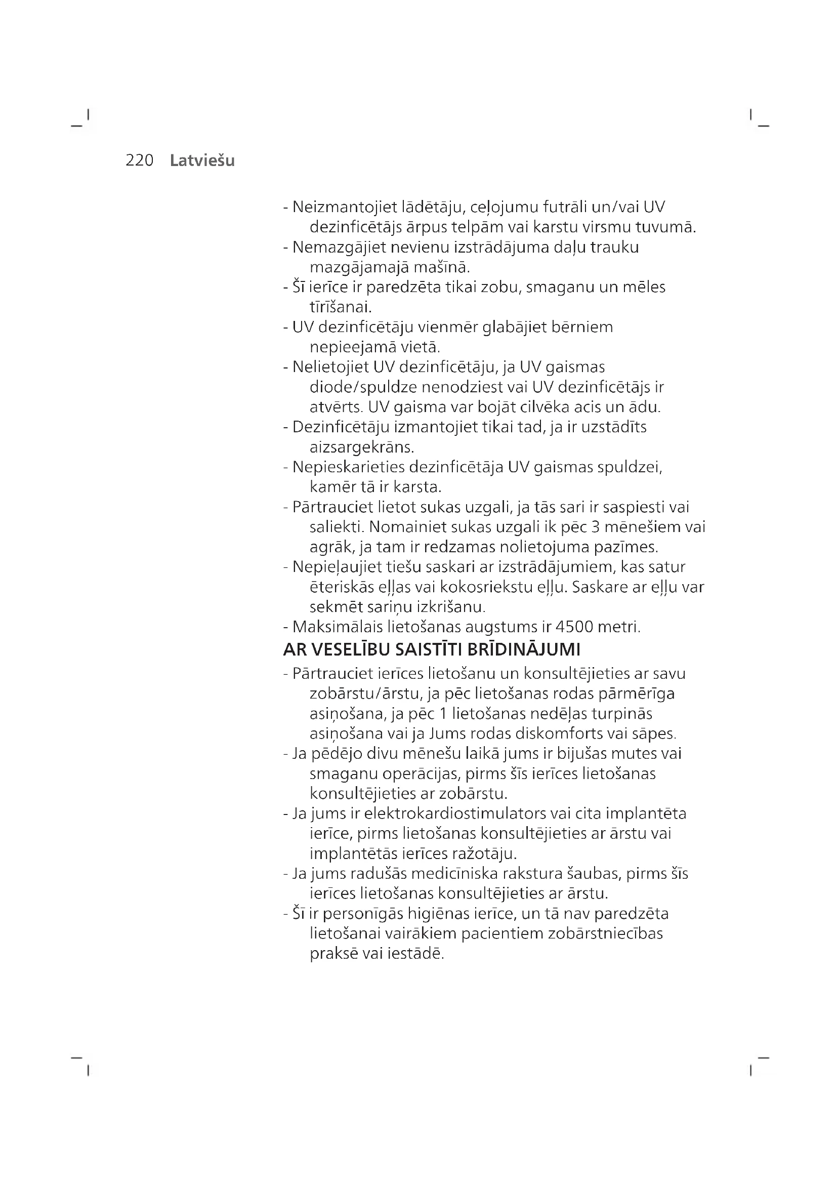 Ja akumulatora indikators un sukas uzgaļa nomaiņas atgādinājuma indikators 2reizes iedegas zaļā krāsā un atskan 3skaņas signāli no zema līdz augstam tonim, funkcija ir aktivizēta. VAI Ja akumulatora indikators un sukas uzgaļa nomaiņas atgādinājuma indikators 1reizi iedegas oranžā krāsā un atskan 3skaņas signāli no augsta līdz zemam tonim, funkcija ir deaktivizēta.231 Latviešu UV dezinficētājs Piezīme. Komplektācijā iekļautie piederumi var atšķirties atkarībā no iegādātā modeļa. UV dezinficētājā varat notīrīt sukas uzgali pēc katras lietošanas reizes. Atvienojiet dezinficētāju no strāvas, pārtrauciet lietošanu un sazinieties ar klientu apkalpošanas centru, ja: - pēc durvju atvēršanas UV gaismas spuldze nenodziest; - dezinficētāja lodziņš ir bojāts vai tā trūkst; - darbības laikā dezinficētājs dūmo vai izplata deguma smaku. Piezīme. UV gaisma var bojāt cilvēka acis un ādu. Ierīce vienmēr jāglabā bērniem nepieejamā vietā.