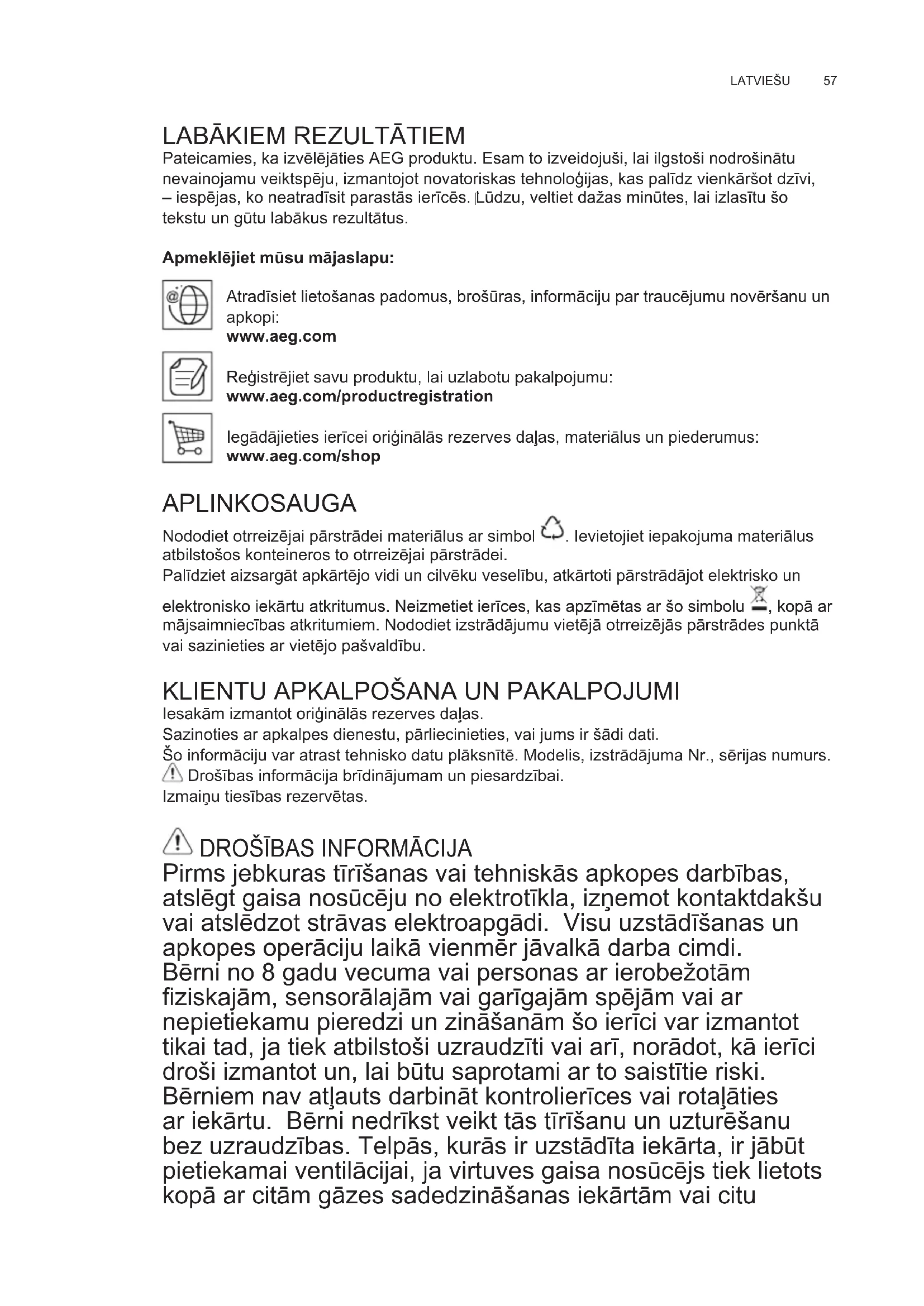 Pateicamies, ka izvēlējāties AEG produktu. Esam to izveidojuši, lai ilgstoši nodrošinātu nevainojamu veiktspēju, izmantojot novatoriskas tehnoloģijas, kas palīdz vienkāršot dzīvi, – iespējas, ko neatradīsit parastās ierīcēs. Lūdzu, veltiet dažas minūtes, lai izlasītu šo tekstu un gūtu labākus rezultātus. Apmeklējiet mūsu mājaslapu: Atradīsiet lietošanas padomus, brošūras, informāciju par traucējumu novēršanu un apkopi: www.aeg.com Reģistrējiet savu produktu, lai uzlabotu pakalpojumu: www.aeg.com/productregistration Iegādājieties ierīcei oriģinālās rezerves daļas, materiālus un piederumus: www.aeg.com/shop APLINKOSAUGA Nododiet otrreizējai pārstrādei materiālus ar simbol . Ievietojiet iepakojuma materiālus atbilstošos konteineros to otrreizējai pārstrādei. Palīdziet aizsargāt apkārtējo vidi un cilvēku veselību, atkārtoti pārstrādājot elektrisko un elektronisko iekārtu atkritumus. Neizmetiet ierīces, kas apzīmētas ar šo simbolu , kopā ar mājsaimniecības atkritumiem. Nododiet izstrādājumu vietējā otrreizējās pārstrādes punktā vai sazinieties ar vietējo pašvaldību.