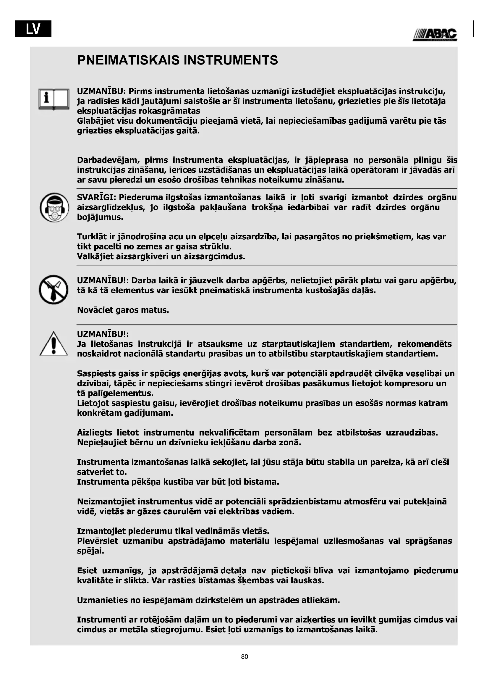 PNEIMATISKAIS INSTRUMENTS UZMANĪBU: Pirms instrumenta lietošanas uzmanīgi izstudējiet ekspluatācijas instrukciju, ja radīsies kādi jautājumi saistošie ar šī instrumenta lietošanu, griezieties pie šīs lietotāja ekspluatācijas rokasgrāmatas Glabājiet visu dokumentāciju pieejamā vietā, lai nepieciešamības gadījumā varētu pie tās griezties ekspluatācijas gaitā. Darbadevējam, pirms instrumenta ekspluatācijas, ir jāpieprasa no personāla pilnīgu šīs instrukcijas zināšanu, ierīces uzstādīšanas un ekspluatācijas laikā operātoram ir jāvadās arī ar savu pieredzi un esošo drošības tehnikas noteikumu zināšanu. SVARĪGI: Piederuma ilgstošas izmantošanas laikā ir ļoti svarīgi izmantot dzirdes orgānu aizsarglīdzekļus, jo ilgstoša pakļaušana trokšņa iedarbībai var radīt dzirdes orgānu bojājumus. Turklāt ir jānodrošina acu un elpceļu aizsardzība, lai pasargātos no priekšmetiem, kas var tikt pacelti no zemes ar gaisa strūklu. Valkājiet aizsargķiveri un aizsargcimdus. UZMANĪBU!: Darba laikā ir jāuzvelk darba apğērbs, nelietojiet pārāk platu vai garu apğērbu, tā kā tā elementus var iesūkt pneimatiskā instrumenta kustošajās daļās. Novāciet garos matus. UZMANĪBU!: Ja lietošanas instrukcijā ir atsauksme uz starptautiskajiem standartiem, rekomendēts noskaidrot nacionālā standartu prasības un to atbilstību starptautiskajiem standartiem. Saspiests gaiss ir spēcīgs enerğijas avots, kurš var potenciāli apdraudēt cilvēka veselībai un dzīvībai, tāpēc ir nepieciešams stingri ievērot drošības pasākumus lietojot kompresoru un tā palīgelementus. Lietojot saspiestu gaisu, ievērojiet drošības noteikumu prasības un esošās normas katram konkrētam gadījumam. Aizliegts lietot instrumentu nekvalicētam personālam bez atbilstošas uzraudzības. Nepieļaujiet bērnu un dzīvnieku iekļūšanu darba zonā. Instrumenta izmantošanas laikā sekojiet, lai jūsu stāja būtu stabila un pareiza, kā arī cieši satveriet to. Instrumenta pēkšņa kustība var būt ļoti bīstama. Neizmantojiet instrumentus vidē ar potenciāli sprādzienbīstamu atmosfēru vai putekļainā vidē, vietās ar gāzes caurulēm vai elektrības vadiem. Izmantojiet piederumu tikai vedināmās vietās. Pievērsiet uzmanību apstrādājamo materiālu iespējamai uzliesmošanas vai sprāgšanas spējai. Esiet uzmanīgs, ja apstrādājamā detaļa nav pietiekoši blīva vai izmantojamo piederumu kvalitāte ir slikta. Var rasties bīstamas šķembas vai lauskas. Uzmanieties no iespējamām dzirkstelēm un apstrādes atliekām. Instrumenti ar rotējošām daļām un to piederumi var aizķerties un ievilkt gumijas cimdus vai cimdus ar metāla stiegrojumu. Esiet ļoti uzmanīgs to izmantošanas laikā.81