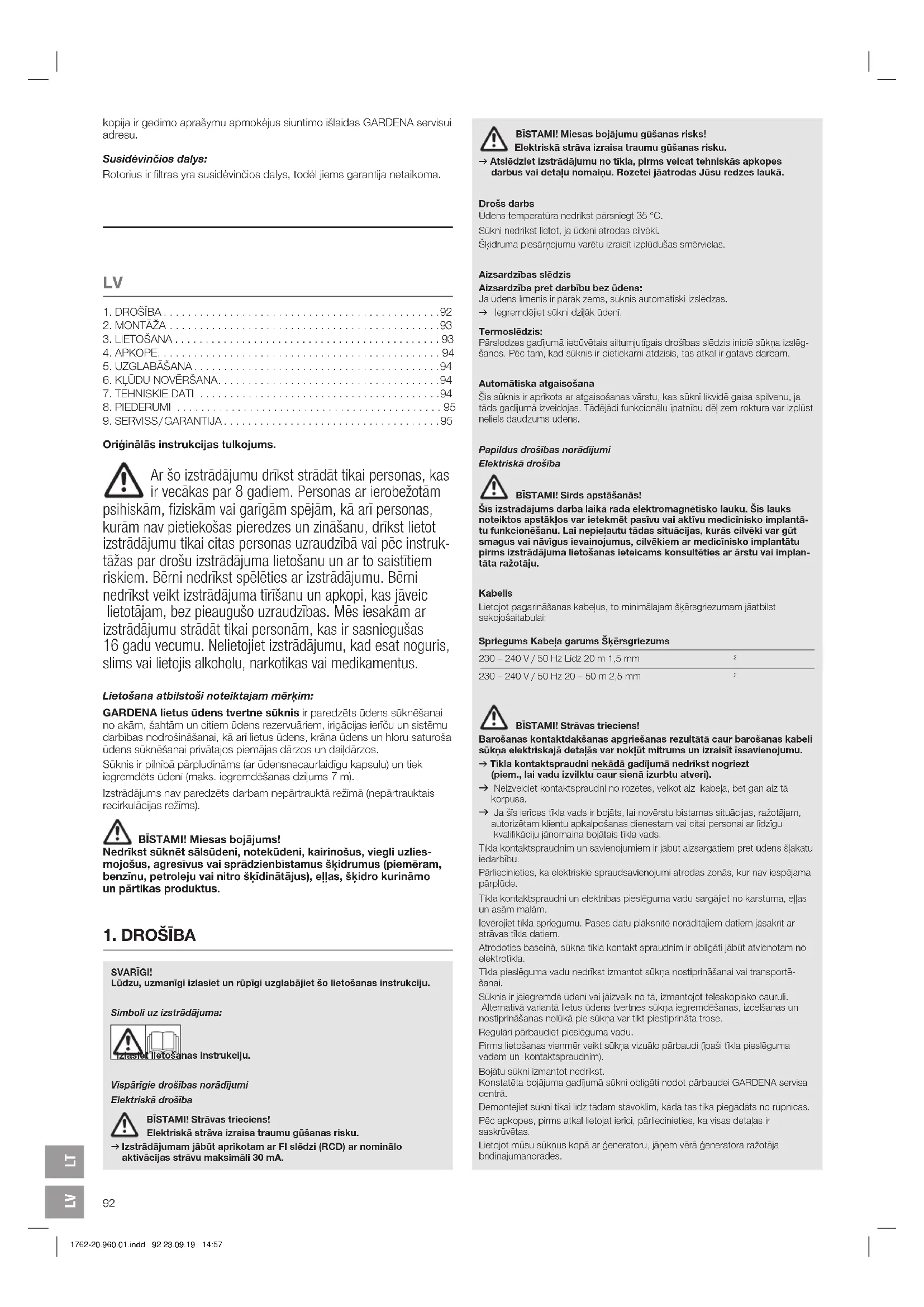 BĪSTAMI! Strāvas trieciens! Barošanas kontaktdakšanas apgriešanas rezultātā caur barošanas kabeli sūkņa elektriskajā detaļās var nokļūt mitrums un izraisīt īssavienojumu. v Tīkla kontaktspraudni nekādā gadījumā nedrīkst nogriezt (piem., lai vadu izvilktu caur sienā izurbtu atveri). v Neizvelciet kontaktspraudni no rozetes, velkot aiz kabeļa, bet gan aiz tā korpusa. v Ja šīs ierīces tīkla vads ir bojāts, lai novērstu bīstamas situācijas, ražotājam, autorizētam klientu apkalpošanas dienestam vai citai personai ar līdzīgu kvalifikāciju jānomaina bojātais tīkla vads. Tīkla kontaktspraudnim un savienojumiem ir jābūt aizsargātiem pret ūdens šļakatu iedarbību. Pārliecinieties, ka elektriskie spraudsavienojumi atrodas zonās, kur nav iespējama pārplūde. Tīkla kontaktspraudni un elektrības pieslēguma vadu sargājiet no karstuma, eļļas un asām malām. Ievērojiet tīkla spriegumu. Pases datu plāksnītē norādītājiem datiem jāsakrīt ar strāvas tīkla datiem. Atrodoties baseinā, sūkņa tīkla kontakt spraudnim ir obligāti jābūt atvienotam no elektrotīkla. Tīkla pieslēguma vadu nedrīkst izmantot sūkņa nostiprināšanai vai transportē- šanai. Sūknis ir jāiegremdē ūdenī vai jāizvelk no tā, izmantojot teleskopisko cauruli. Alternatīvā variantā lietus ūdens tvertnes sūkņa iegremdēšanas, izcelšanas un nostiprināšanas nolūkā pie sūkņa var tikt piestiprināta trose. Regulāri pārbaudiet pieslēguma vadu. Pirms lietošanas vienmēr veikt sūkņa vizuālo pārbaudi (īpaši tīkla pieslēguma vadam un kontaktspraudnim). Bojātu sūkni izmantot nedrīkst. Konstatēta bojājuma gadījumā sūkni obligāti nodot pārbaudei GARDENA servisa centrā. Demontējiet sūkni tikai līdz tādam stāvoklim, kādā tas tika piegādāts no rūpnīcas. Pēc apkopes, pirms atkal lietojat ierīci, pārliecinieties, ka visas detaļas ir saskrūvētas. Lietojot mūsu sūkņus kopā ar ģeneratoru, jāņem vērā ģeneratora ražotāja brīdinājuma norādes. SVARĪGI! Lūdzu, uzmanīgi izlasiet un rūpīgi uzglabājiet šo lietošanas instrukciju. Simboli uz izstrādājuma: Izlasiet lietošanas instrukciju. Vispārīgie drošības norādījumi Elektriskā drošība BĪSTAMI! Strāvas trieciens! Elektriskā strāva izraisa traumu gūšanas risku. v Izstrādājumam jābūt aprīkotam ar FI slēdzi (RCD) ar nominālo aktivācijas strāvu maksimāli 30 mA.