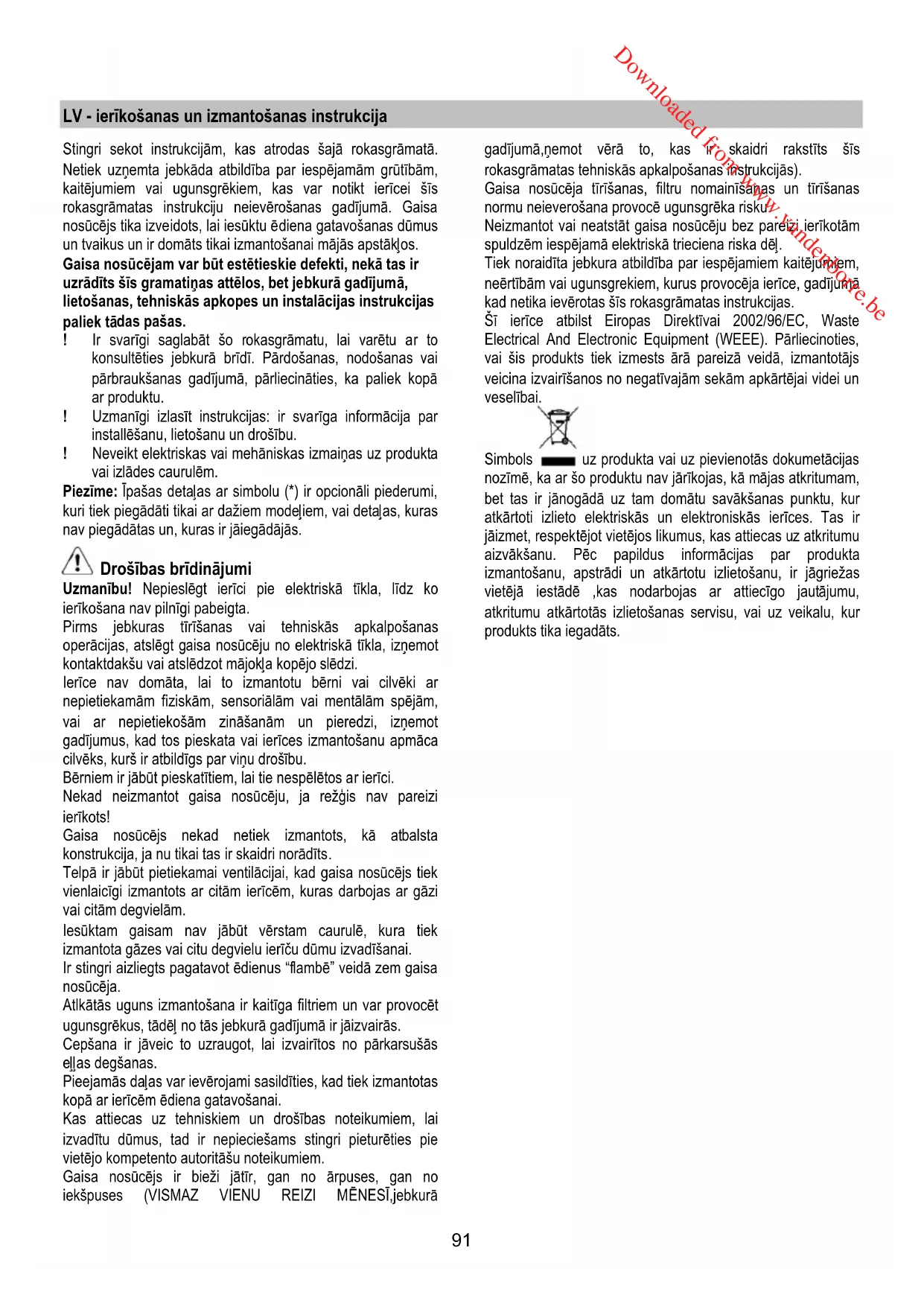 tlikę filtrų priežiūros darbus ir įjungę gaubtą, paspauskite ir laikykite nuspaudę mygtuką, kol išgirsite garso signalą. Mirksintis šviesos diodas 1 (riebalų filtras) arba 2 (anglies filtras) nustos mirksėti. ELEKTROS ATJUNGIMAS Mygtuką laikykite paspaudę 3 sekundes, kol bus atjungta gaubto valdymo elektra. Ši funkcija gali praversti valant gaminį. Norėdami vėl įjungti elektrą, pakartokite veiksmą. Galimų veikimo sutrikimų atveju, prieš kreipdamiesi į specialistą, bent 5 sekundėm išjunkite aparatą iš elektros tinklo ištraukdami kištuką, po to vėl įjunkite. Tuo atveju, jei veikimo sutrikimas neišnyktų, kreipkitės pagalbos į specialistus. Priežiūra Dėmesio! Prieš valydami prietaisą, išjunkite jį iš elektros tinklo. Ištraukite kištuką iš rozetės arba išjunkite pagrindinį namų elektros jungiklį. Valymas Gaubtą reikia nuolat valyti (bent jau taip pat dažnai kaip ir prižiūrint riebalų filtrus), tiek iš vidaus, tiek ir iš išorės. Valymui naudoti šluostę, suvilgytą skystu neutraliu valikliu. Nenaudokite abrazyvinių valymo priemonių. NENAUDOKITE SPIRITO! Dėmesio: netinkamai valant prietaisą bei nesilaikant filtrų keitimo normų gali kilti gaisro pavojus. Todėl rekomenduojama laikytis pateiktų nurodymų. Gamintojas neprisiima jokios atsakomybės už gaisrą bei galimus variklio gedimus, kilusius dėl netinkamos priežiūros arba dėl šių nurodymų nesilaikymo. Nuo riebalų saugantis filtras 19-25 pav. Sulaiko kepamų riebalų daleles. Filtrą valykite kartą per mėnesį (ar kai filtrų perpildymo indikacijos sistema, jei tokia numatyta turimame modelyje, rodo tokią būtinybę). Valykite švelniais valikliais rankiniu būdu ar indaplovėje pagal atitinkamą temperatūrą ir trumpuoju ciklu. Plaunant metalinį nuo riebalų saugantį filtrą indaplovėje, jis gali prarasti spalvą, bet jo filtravimo savybės išliks nepakitusios. Norėdami išmontuoti riebalų filtrą, patraukite spyruoklinę atkabinimo rankeną. Anglies filtras (tik filtravimo režimu) 23 pav. Naikina nemalonius kvapus, atsirandančius maisto gaminimo metu. Anglies filtrą galima plauti kas du mėnesius (arba kai filtrų prisotinimo signalizavimo sistema – jeigu ji numatyta turimame modelyje – rodo, kad reikia) šiltu vandeniu specialiai tam pritaikytais plovikliais arba indaplovėje 65 °C temperatūroje (jei filtrą plaunate indaplovėje, nustatykite visą plovimo ciklą, filtrą plaukite atskirai nuo kitų indų). Susikaupusį vandenį nupilkite nepažeisdami filtro, paskui įdėkite filtrą 10 minučių į iki 100 °C įkaitintą orkaitę, kad galutinai išdžiūtų. Pagalvėlę keiskite kas 3 metus arba anksčiau, jei pastebėjote, kad audeklas pažeistas. Lempų keitimas Gartraukyje įrengta diodų technologijos apšvietimo sistema. Diodai užtikrina optimalų apšvietimą, be to, jų naudojimo laikas iki 10 kartų ilgesnis nei tradicinių lempučių, taigi sutaupoma 90 % elektros energijos. Jei norite juos pakeisti, kreipkitės į techninio aptarnavimo tarnybą. Downloaded from www.vandenborre.be91 LV - ierīkošanas un izmantošanas instrukcija Stingri sekot instrukcijām, kas atrodas šajā rokasgrāmatā. Netiek uzņemta jebkāda atbildība par iespējamām grūtībām, kaitējumiem vai ugunsgrēkiem, kas var notikt ierīcei šīs rokasgrāmatas instrukciju neievērošanas gadījumā. Gaisa nosūcējs tika izveidots, lai iesūktu ēdiena gatavošanas dūmus un tvaikus un ir domāts tikai izmantošanai mājās apstākļos. Gaisa nosūcējam var būt estētieskie defekti, nekā tas ir uzrādīts šīs gramatiņas attēlos, bet jebkurā gadījumā, lietošanas, tehniskās apkopes un instalācijas instrukcijas paliek tā das pašas. ! Ir svarīgi saglabāt šo rokasgrāmatu, lai varētu ar to konsultēties jebkurā brīdī. Pārdošanas, nodošanas vai pārbraukšanas gadījumā, pārliecināties, ka paliek kopā ar produktu. ! Uzmanīgi izlasīt instrukcijas: ir svarīga informācija par installēšanu, lietošanu un drošību. ! Neveikt elektriskas vai mehāniskas izmaiņas uz produkta vai izlādes caurulēm. Piezīme: Īpašas detaļas ar simbolu (*) ir opcionāli piederumi, kuri tiek piegādāti tikai ar dažiem modeļiem, vai detaļas, kuras nav piegādātas un, kuras ir jāiegādājās. Drošības brīdinājumi Uzmanību! Nepieslēgt ierīci pie elektriskā tīkla, līdz ko ierīkošana nav pilnīgi pabeigta. Pirms jebkuras tīrīšanas vai tehniskās apkalpošanas operācijas, atslēgt gaisa nosūcēju no elektriskā tīkla, izņemot kontaktdakšu vai atslēdzot mājokļa kopējo slēdzi. Ierīce nav domāta, lai to izmantotu bērni vai cilvēki ar nepietiekamām fiziskām, sensoriālām vai mentālām spējām, vai ar nepietiekošām zināšanām un pieredzi, izņemot gadījumus, kad tos pieskata vai ierīces izmantošanu apmāca cilvēks, kurš ir atbildīgs par viņu droš ību. Bērniem ir jābūt pieskatītiem, lai tie nespēlētos ar ierīci. Nekad neizmantot gaisa nosūcēju, ja režģis nav pareizi ierīkots! Gaisa nosūcējs nekad netiek izmantots, kā atbalsta konstrukcija, ja nu tikai tas ir skaidri norādīts. Telpā ir jābūt pietiekamai ventilācijai, kad gaisa nosūcējs tiek vienlaicīgi izmantots ar citām ierīcēm, kuras darbojas ar gāzi vai citām degvielām. Iesūktam gaisam nav jābūt vērstam caurulē, kura tiek izmantota gāzes vai citu degvielu ierīču dūmu izvadīšanai. Ir stingri aizliegts pagatavot ēdienus “flambē” veidā zem gaisa nosūcēja. Atlk ātās uguns izmantošana ir kaitīga filtriem un var provocēt ugunsgrēkus, tādēļ no tās jebkurā gadījumā ir jāizvairās. Cepšana ir jāveic to uzraugot, lai izvairītos no pārkarsušās eļļas degšanas. Pieejamās daļas var ievērojami sasildīties, kad tiek izmantotas kopā ar ierīcēm ēdiena gatavošanai. Kas attiecas uz tehniskiem un drošības noteikumiem, lai izvadītu dūmus, tad ir nepieciešams stingri pieturēties pie vietējo