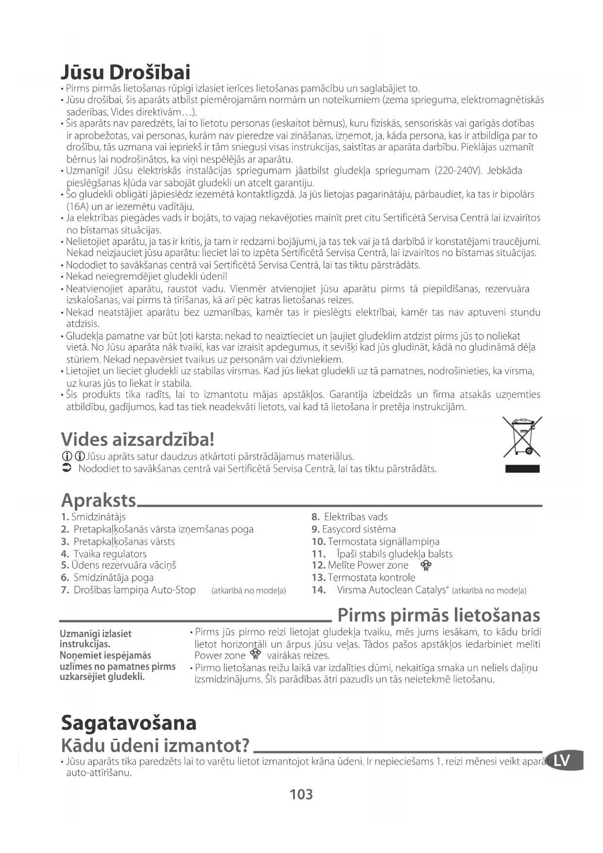 - Šis produkts tika radīts, lai to izmantotu mājas apstākļos. Garantija izbeidzās un firma atsakās uzņemties atbildību, gadījumos, kad tas tiek neadekvāti lietots, vai kad tā lietošana ir pretēja instrukcijām. Vides aizsardzība! Jūsu aprāts satur daudzus atkārtoti pārstrādājamus materiālus. Nododiet to savākšanas centrā vai Sertificētā Servisa Centrā, lai tas tiktu pārstrādāts. Apraksts 1. Smidzinātājs2. Pretapkaļķošanās vārsta izņemšanas poga3. Pretapkaļķošanas vārsts4. Tvaika regulators5. Ūdens rezervuāra vāciņš6. Smidzinātāja poga 7. Drošības lampiņa Auto-Stop(atkarībā no modeļa)8. Elektrības vads9. Easycord sistēma10. Termostata signāllampiņa11. Īpaši stabils gludekļa balsts12. Melīte Power zone 13. Termostata kontrole14. Virsma Autoclean Catalys (atkarībā no modeļa) Pirms pirmās lietošanas