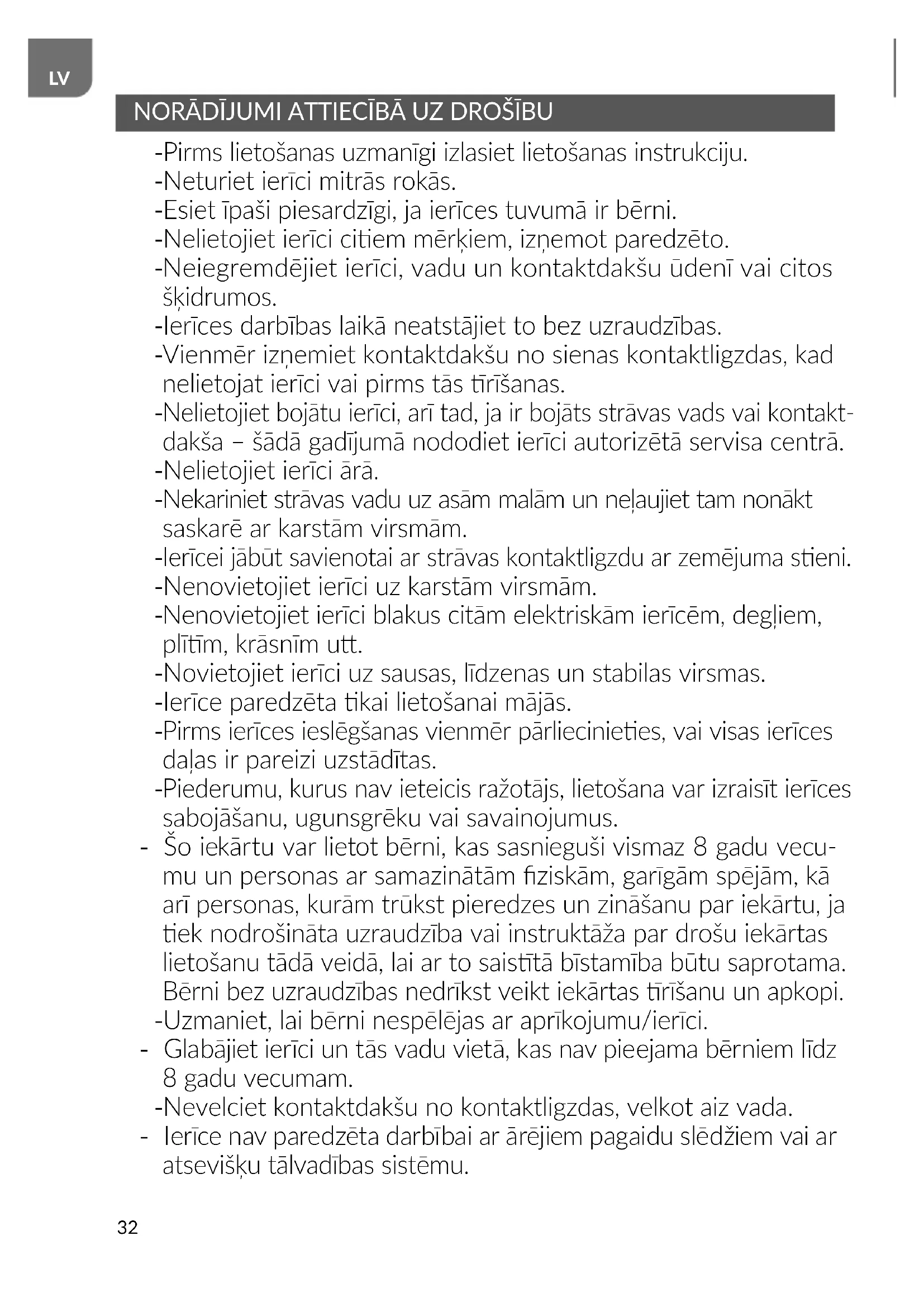 NORĀDĪJUMI ATTIECĪBĀ UZ DROŠĪBU - Pirms lietošanas uzmanīgi izlasiet lietošanas instrukciju. - Neturiet ierīci mitrās rokās. - Esiet īpaši piesardzīgi, ja ierīces tuvumā ir bērni. - Nelietojiet ierīci ciem mērķiem, izņemot paredzēto.
