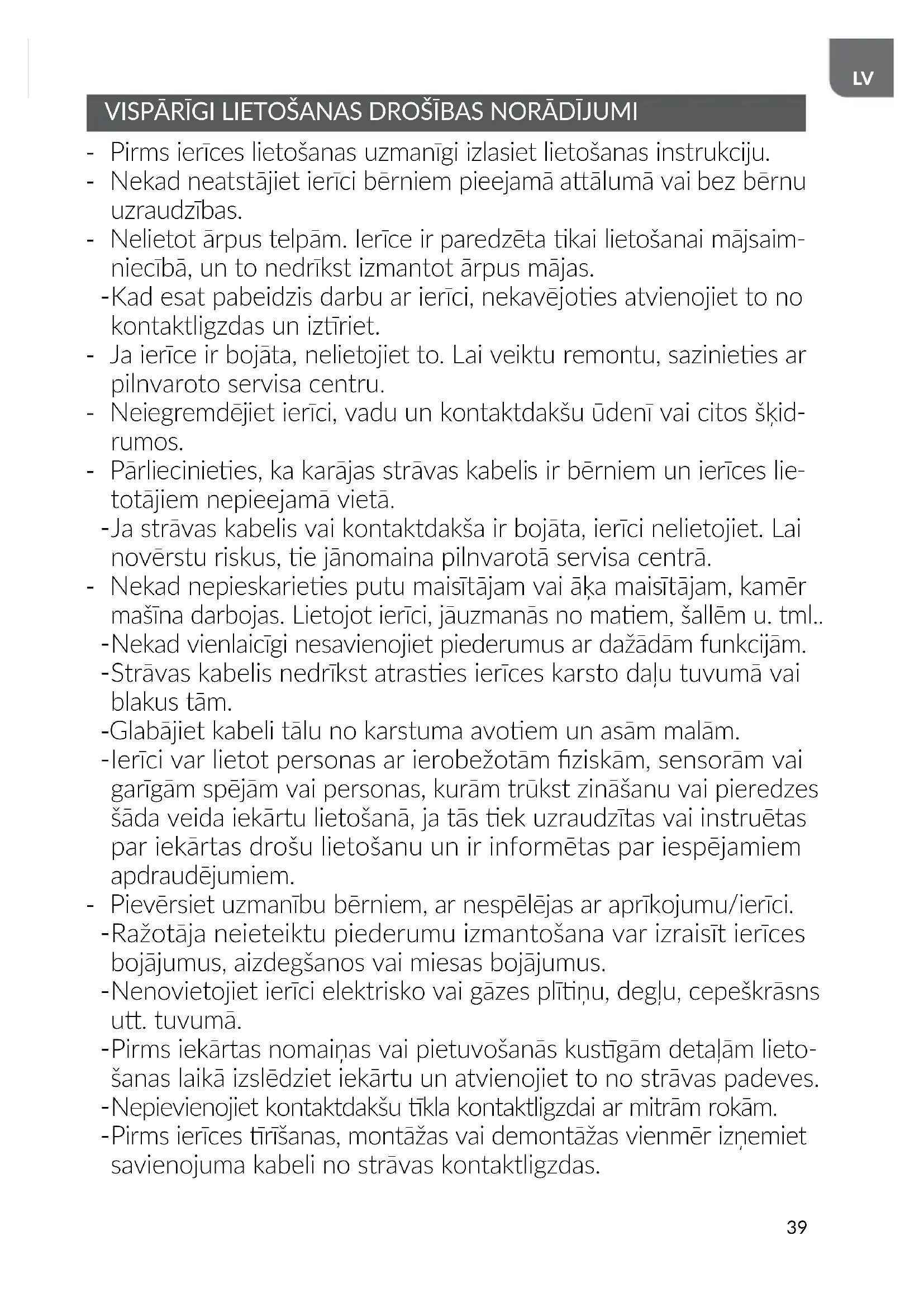 VISPĀRĪGI LIETOŠANAS DROŠĪBAS NORĀDĪJUMI - Pirms ierīces lietošanas uzmanīgi izlasiet lietošanas instrukciju. - Nekad neatstājiet ierīci bērniem pieejamā aālumā vai bez bērnu uzraudzības. - Nelietot ārpus telpām. Ierīce ir paredzēta kai lietošanai mājsaim