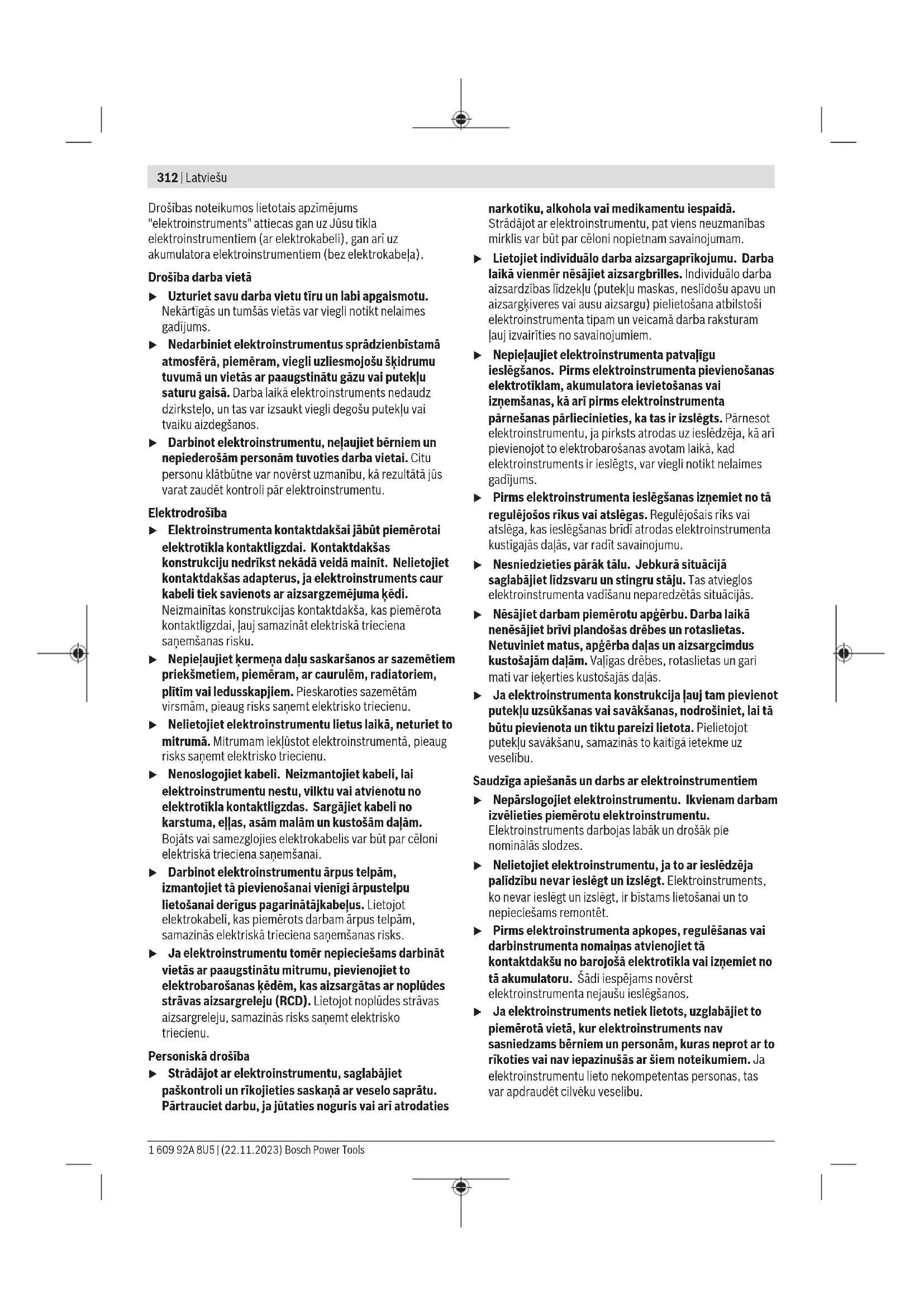 1,5 1,5 1,5 Šajā pamācībā norādītais vibrācijas līmenis un instrumenta radītā trokšņa vērtība ir izmērīta atbilstoši standartā noteiktajai procedūrai un var tikt izmantota elektroinstrumentu savstarpējai salīdzināšanai. To var izmantot arī vibrācijas un trokšņa radītās papildu slodzes iepriekšējai novērtēšanai. Šeit norādītais svārstību līmenis un instrumenta radītā trokšņa vērtība ir attiecināma uz elektroinstrumenta galvenajiem pielietojuma veidiem. Ja elektroinstruments tiek lietots netipiskiem mērķiem, kopā ar netipiskiem darbinstrumentiem vai nav vajadzīgajā veidā apkalpots, tā svārstību līmenis un radītā trokšņa vērtība var atšķirties no šeit norādītajām vērtībām. Tas var ievērojami palielināt svārstību un trokšņa radīto papildu slodzi kopējam darba laika posmam. Lai precīzi izvērtētu svārstību un trokšņa radīto papildu slodzi zināmam darba laika posmam, jāņem vērā arī laiks, kad elektroinstruments ir izslēgts vai arī darbojas, taču faktiski netiek izmantots paredzētā darba veikšanai. Tas var ievērojami samazināt svārstību un trokšņa radīto papildu slodzi kopējam darba laika posmam. Veiciet papildu pasākumus, lai pasargātu strādājošo personu no vibrācijas kaitīgās iedarbības, piemēram, savlaicīgi veiciet elektroinstrumenta un darbinstrumentu apkalpošanu, uzturiet rokas siltas un pareizi plānojiet darbu. Akumulators u Veicot jebkurus darbus ar elektroinstrumentu (piemēram, apkalpošanu, darbinstrumentu nomaiņu utt.), kā arī pirms tā transportēšanas vai uzglabāšanas vienmēr izņemiet no elektroinstrumenta akumulatoru. Ieslēdzēja nejauša nospiešana var izraisīt savainojumu. Bosch pārdod akumulatora elektriskos darbinstrumentus arī bez akumulatora. Tas, vai Jūsu elektriskā darbinstrumenta piegādes komplektācijā ir iekļauts akumulators, ir norādīts uz iesaiņojuma. Akumulatora uzlāde u Izmantojiet vienīgi tehniskajos datos norādītās uzlādes ierīces. Vienīgi šī uzlādes ierīce ir piemērota jūsu elektroinstrumentā izmantojamā litija-jonu akumulatora uzlādei. Norāde: atbilstoši starptautiskajiem kravu pārvadāšanas noteikumiem litija jonu akumulatori tiek piegādāti daļēji uzlādētā stāvoklī. Lai nodrošinātu pilnu akumulatora jaudu, pirms pirmās lietošanas reizes pilnībā uzlādējiet akumulatoru. Akumulatora ielikšana Ievietojiet uzlādēto akumulatoru akumulatora stiprinājumā, līdz tas tiek nofiksēts. Akumulatora izņemšana Lai izņemtu akumulatoru, nospiediet akumulatora atbrīvošanas taustiņu un izvelciet akumulatoru. Nedarbojieties ar spēku. Akumulatoram 2 ir divpakāpju fiksators, kas neļauj tam izkrist, kad nejauši nospiež akumulatora atbrīvošanas pogu. Kamēr akumulators ir ielikts elektroinstrumentā, to notur atspere. Akumulatora uzlādes pakāpes indikators Piezīme: ne visiem akumulatoru tipiem ir uzlādes līmeņa indikators. Akumulatora uzlādes pakāpes indikatora zaļās LEDs diodes parāda akumulatora uzlādes pakāpi. Vadoties no drošības apsvērumiem, uzlādes pakāpe ir nolasāma tikai tad, ja elektroinstruments atrodas miera stāvoklī. Lai nolasītu akumulatora uzlādes pakāpi, nospiediet akumulatora uzlādes pakāpes nolasīšanas taustiņu vai . Tas iespējams arī tad, ja akumulators ir izņemts no elektroinstrumenta. Ja pēc akumulatora uzlādes pakāpes nolasīšanas taustiņa nospiešanas neiedegas neviena no uzlādes pakāpes indikatora LED diodēm, tas nozīmē, ka akumulators ir bojāts un to nepieciešams nomainīt. Akumulatora uzlādes līmenis tiek rādīts arī lietotāja saskarnē (skatīt „Stāvokļa rādījumi“, Lappuse318). Akumulatora tips GBA 18V... LED Uzlādes līmenis Pastāvīgi deg 3zaļas LED diodes 60–100% Pastāvīgi deg 2zaļas LED diodes 30–60% Pastāvīgi deg 1zaļa LED diode 5–30% Mirgo 1zaļa LED diode 0–5% Akumulatora tips ProCORE18V... LED Uzlādes līmenis Pastāvīgi deg 5zaļas LED diodes 80–100% Pastāvīgi deg 4zaļas LED diodes 60–80% Pastāvīgi deg 3zaļas LED diodes 40–60% Pastāvīgi deg 2zaļas LED diodes 20–40% Pastāvīgi deg 1zaļa LED diode 5–20% Mirgo 1zaļa LED diode 0–5% Pareiza apiešanās ar akumulatoru Sargājiet akumulatoru no mitruma un ūdens. 1 609 92A 8U5 | (22.11.2023) Bosch Power ToolsLatviešu | 317 Uzglabājiet akumulatoru pie temperatūras no −20°C līdz 50°C. Neatstājiet akumulatoru karstumā, piemēram, vasaras laikā neatstājiet to automašīnā. Laiku pa laikam iztīriet akumulatora ventilācijas atvērumus ar mīkstu, tīru un sausu otu. Ja manāmi samazinās instrumenta darbības laiks starp akumulatora uzlādēm, tas norāda, ka akumulators ir nolietojies un to nepieciešams nomainīt. Ievērojiet norādījumus par atbrīvošanos no nolietotajiem izstrādājumiem. Montāža u Veicot jebkurus darbus ar elektroinstrumentu (piemēram, apkalpošanu, darbinstrumentu nomaiņu utt.), kā arī pirms tā transportēšanas vai uzglabāšanas vienmēr izņemiet no elektroinstrumenta akumulatoru. Ieslēdzēja nejauša nospiešana var izraisīt savainojumu. Magazīnas uzpildīšana (skatietA1−A4 att.) u Izņemiet akumulatoru pirms elektroinstrumenta regulēšanas, piederumu nomaiņas vai novietošanas. Šis piesardzības pasākums ļaus novērst elektroinstrumenta patvaļīgu palaišanos. Izmantojiet tikai oriģinālosBoschpiederumus. Elektroinstrumenta precīzijas daļas, piemēram, magazīna, stobrs un iedzīšanas kanāls, ir paredzētasBosch skavām, naglām un tapām. Citās firmās ražo cita izmēra elementus no citas kvalitātes tērauda. Norāde: izmantojiet tikai tādus iedzīšanas priekšmetus, kas ir norādīti tabulā “Tehniskie dati”. Neatbilstīgu stiprinājuma elementu izmantošana var radīt elektroinstrumenta bojājumus un personu savainojumus. Magazīnas uzpildīšanas laikā turiet elektroinstrumentu tā, lai stobrs (18) nebūtu vērsts pret jūsu ķermeni vai c