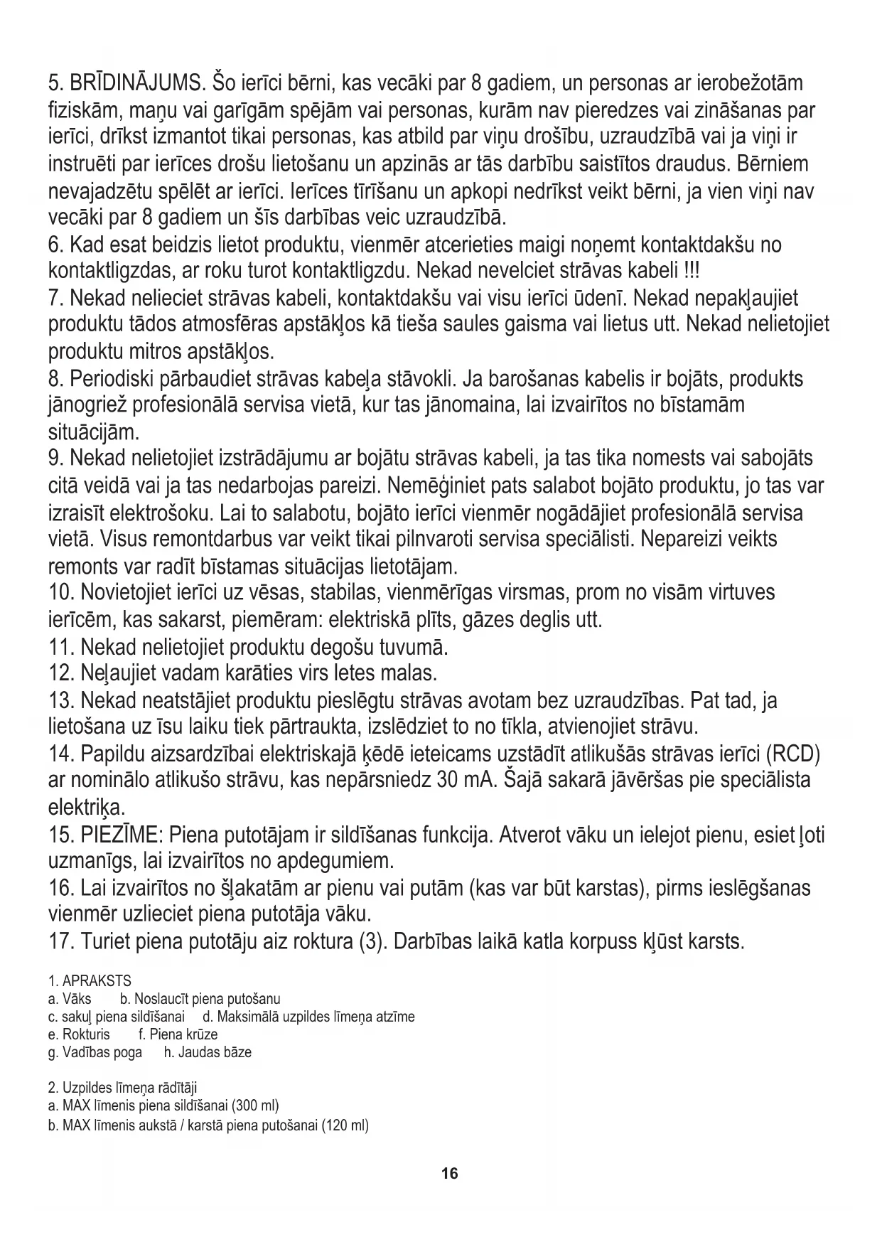 kontaktligzdas, ar roku turot kontaktligzdu. Nekad nevelciet strāvas kabeli !!! c. sakuļ piena sildīšanai d. Maksimālā uzpildes līmeņa atzīme