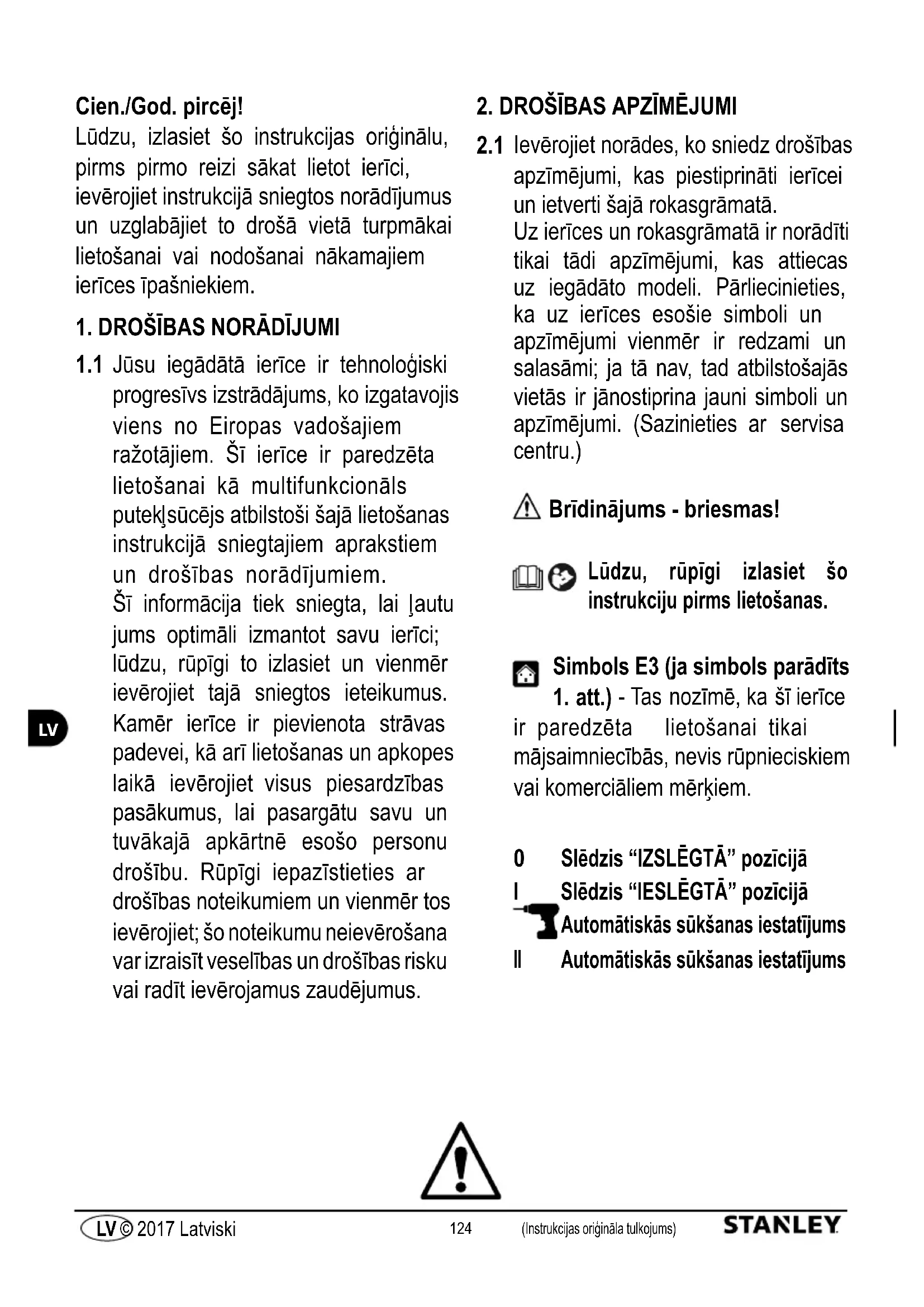 Ievērojiet norādes, ko sniedz drošības apzīmējumi, kas piestiprināti ierīcei un ietverti šajā rokasgrāmatā. Uz ierīces un rokasgrāmatā ir norādīti tikai tādi apzīmējumi, kas attiecas uz iegādāto modeli. Pārliecinieties, ka uz ierīces esošie simboli un apzīmējumi vienmēr ir redzami un salasāmi; ja tā nav, tad atbilstošajās vietās ir jānostiprina jauni simboli un apzīmējumi. (Sazinieties ar servisa centru.) Brīdinājums - briesmas! Lūdzu, rūpīgi izlasiet šo instrukciju pirms lietošanas. Simbols E3 (ja simbols parādīts