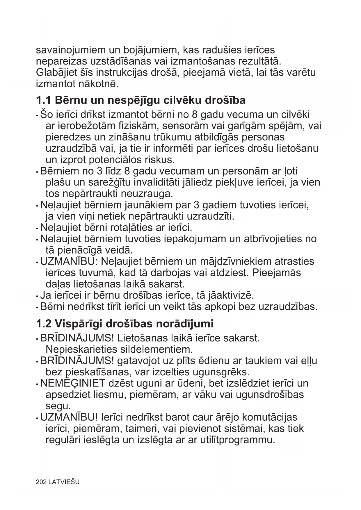 - Šo ierīci drīkst izmantot bērni no 8 gadu vecuma un cilvēki ar ierobežotām fiziskām, sensorām vai garīgām spējām, vai pieredzes un zināšanu trūkumu atbildīgās personas uzraudzībā vai, ja tie ir informēti par ierīces drošu lietošanu un izprot potenciālos riskus.