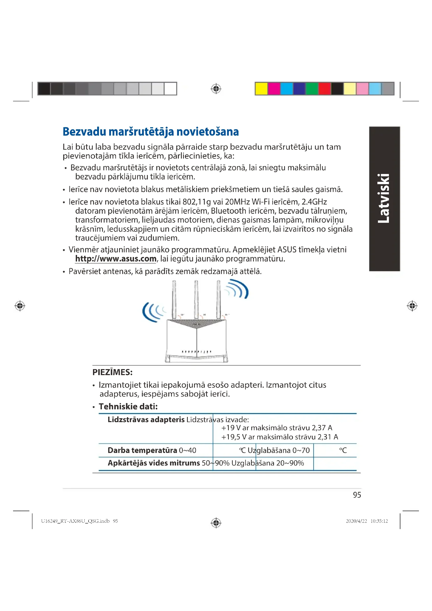 - Naudotojo vadovą galite rasti internete, adresu https://www.asus.com/support U16249_RT-AX86U_QSG.indb 93U16249_RT-AX86U_QSG.indb 93 2020/4/22 10:35:112020/4/22 10:35:1194 Latviski Īss apraksts Īss apraksts Iepakojuma saturs Iepakojuma saturs RT-AX86U Maiņstrāvas adapteris Tīkla kabelis (RJ-45) Padomi ātrai darba uzsākšanai WPS LED Strāvas (DC-IN) osta LAN 1~4 LED Strāvas poga WAN (Interneta) LED Atiestatīšanas poga 2,5G LED USB 3.2 Gen 1 ostām 2,4GHz LED 2,5G osta 5GHz LED WAN (Internet) osta Barošanas LED LAN 1~4 ostām WPS LED ieslēgšanas/izs- lēgšanas poga WPS poga U16249_RT-AX86U_QSG.indb 94U16249_RT-AX86U_QSG.indb 94 2020/4/22 10:35:122020/4/22 10:35:1295 Latviski Bezvadu maršrutētāja novietošana Bezvadu maršrutētāja novietošana Lai būtu laba bezvadu signāla pārraide starp bezvadu maršrutētāju un tam pievienotajām tīkla ierīcēm, pārliecinieties, ka: