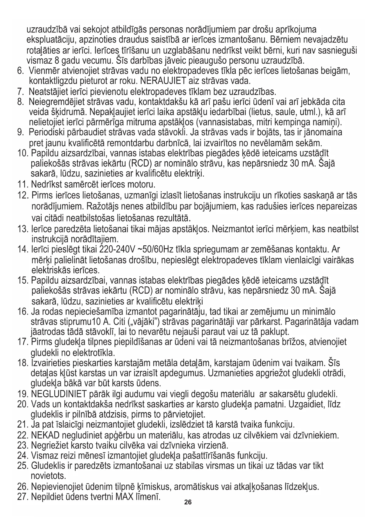 14. Ierīci pieslēgt tikai 220-240V ~50/60Hz tīkla spriegumam ar zemēšanas kontaktu. Ar
