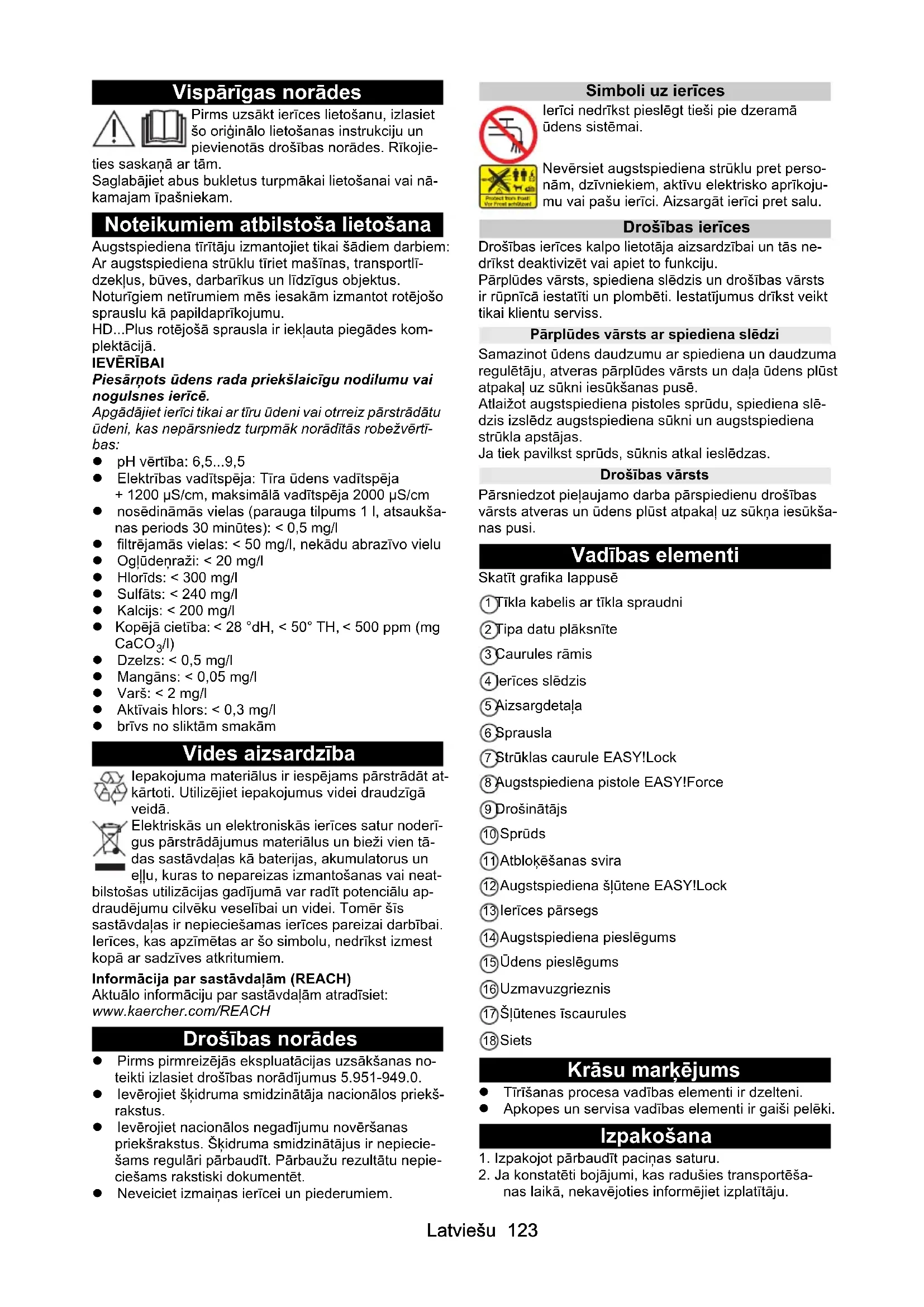 /l) Dzelzs: < 0,5 mg/l Mangāns: < 0,05 mg/l Varš: < 2 mg/l Aktīvais hlors: < 0,3 mg/l brīvs no sliktām smakām Vides aizsardzība Iepakojuma materiālus ir iespējams pārstrādāt at- kārtoti. Utilizējiet iepakojumus videi draudzīgā veidā. Elektriskās un elektroniskās ierīces satur noderī- gus pārstrādājumus materiālus un bieži vien tā- das sastāvdaļas kā baterijas, akumulatorus un eļļu, kuras to nepareizas izmantošanas vai neat- bilstošas utilizācijas gadījumā var radīt potenciālu ap- draudējumu cilvēku veselībai un videi. Tomēr šīs sastāvdaļas ir nepieciešamas ierīces pareizai darbībai. Ierīces, kas apzīmētas ar šo simbolu, nedrīkst izmest kopā ar sadzīves atkritumiem. Informācija par sastāvdaļām (REACH) Aktuālo informāciju par sastāvdaļām atradīsiet: www.kaercher.com/REACH Drošības norādes Pirms pirmreizējās ekspluatācijas uzsākšanas no- teikti izlasiet drošības norādījumus 5.951-949.0. Ievērojiet šķidruma smidzinātāja nacionālos priekš- rakstus. Ievērojiet nacionālos negadījumu novēršanas priekšrakstus. Šķidruma smidzinātājus ir nepiecie- šams regulāri pārbaudīt. Pārbaužu rezultātu nepie- ciešams rakstiski dokumentēt. Neveiciet izmaiņas ierīcei un piederumiem. Simboli uz ierīces Ierīci nedrīkst pieslēgt tieši pie dzeramā ūdens sistēmai. Nevērsiet augstspiediena strūklu pret perso- nām, dzīvniekiem, aktīvu elektrisko aprīkoju- mu vai pašu ierīci. Aizsargāt ierīci pret salu. Drošības ierīces Drošības ierīces kalpo lietotāja aizsardzībai un tās ne- drīkst deaktivizēt vai apiet to funkciju. Pārplūdes vārsts, spiediena slēdzis un drošības vārsts ir rūpnīcā iestatīti un plombēti. Iestatījumus drīkst veikt tikai klientu serviss. Pārplūdes vārsts ar spiediena slēdzi Samazinot ūdens daudzumu ar spiediena un daudzuma regulētāju, atveras pārplūdes vārsts un daļa ūdens plūst atpakaļ uz sūkni iesūkšanas pusē. Atlaižot augstspiediena pistoles sprūdu, spiediena slē- dzis izslēdz augstspiediena sūkni un augstspiediena strūkla apstājas. Ja tiek pavilkst sprūds, sūknis atkal ieslēdzas. Drošības vārsts Pārsniedzot pieļaujamo darba pārspiedienu drošības vārsts atveras un ūdens plūst atpakaļ uz sūkņa iesūkša- nas pusi. Vadības elementi Skatīt grafika lappusē 1 Tīkla kabelis ar tīkla spraudni 2 Tipa datu plāksnīte 3 Caurules rāmis 4 Ierīces slēdzis 5 Aizsargdetaļa 6 Sprausla 7 Strūklas caurule EASY!Lock 8 Augstspiediena pistole EASY!Force 9 Drošinātājs 10 Sprūds 11 Atbloķēšanas svira 12 Augstspiediena šļūtene EASY!Lock 13 Ierīces pārsegs 14 Augstspiediena pieslēgums 15 Ūdens pieslēgums 16 Uzmavuzgrieznis 17 Šļūtenes īscaurules 18 Siets Krāsu marķējums Tīrīšanas procesa vadības elementi ir dzelteni. Apkopes un servisa vadības elementi ir gaiši pelēki. Izpakošana