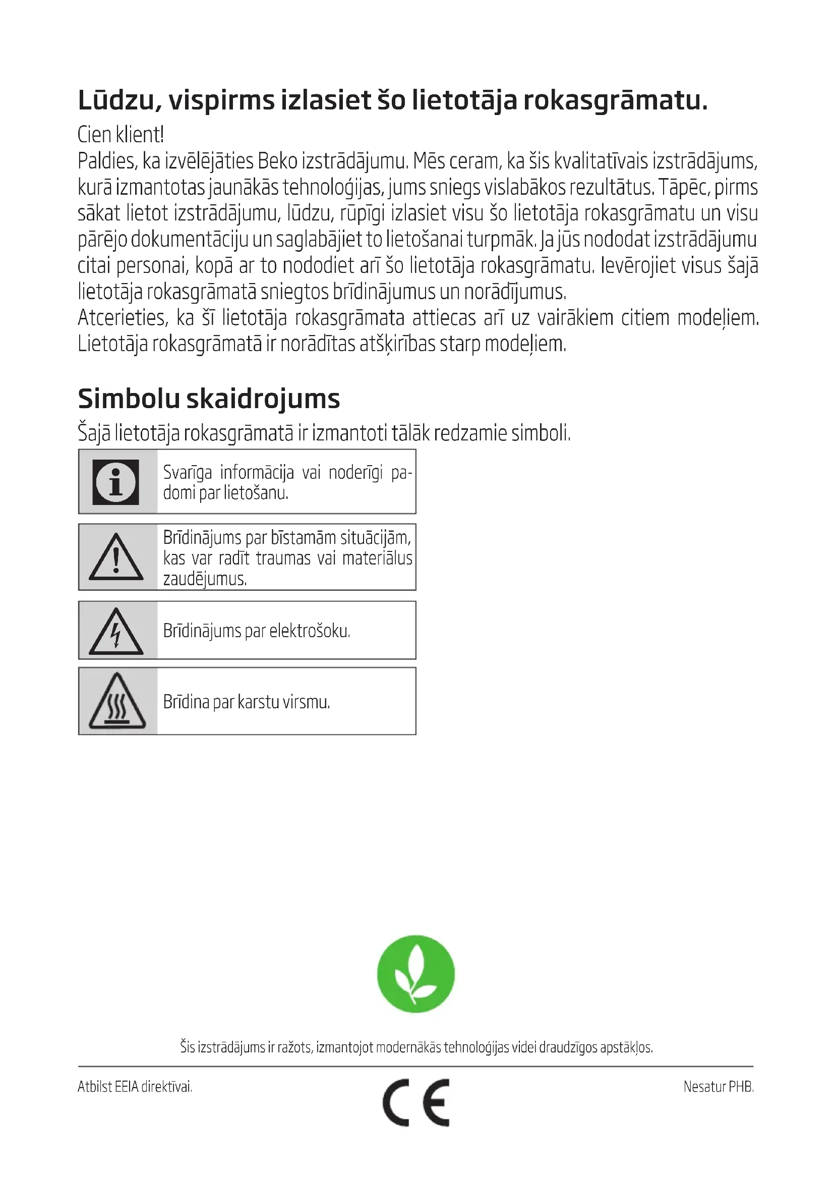 - Išsaugokite originalią prietaiso pakuotę. Prie- taisą transportuokite jo originalioje pakuotėje ir laikykitės ant originalios pakuotės esančių trans-portavimo ženklų. • Nedėkite jokių daiktų ant garų rinktuvo. • Išorinį paviršių saugokite nuo smūgių. • Prietaisą supakuokite taip, kad transportavimo metu jo nepažeistumėte.Atbilst EEIA direktīvai.Šis izstrādājums ir ražots, izmantojot modernākās tehnoloģijas videi draudzīgos apstākļos. Lūdzu, vispirms izlasiet šo lietotāja rokasgrāmatu. Cien klient! Paldies, ka izvēlējāties Beko izstrādājumu. Mēs ceram, ka šis kvalitatīvais izstrādājums, kurā izmantotas jaunākās tehnoloģijas, jums sniegs vislabākos rezultātus. Tāpēc, pirms sākat lietot izstrādājumu, lūdzu, rūpīgi izlasiet visu šo lietotāja rokasgrāmatu un visu pārējo dokumentāciju un saglabājiet to lietošanai turpmāk. Ja jūs nododat izstrādājumu citai personai, kopā ar to nododiet arī šo lietotāja rokasgrāmatu. Ievērojiet visus šajā lietotāja rokasgrāmatā sniegtos brīdinājumus un norādījumus. Atcerieties, ka šī lietotāja rokasgrāmata attiecas arī uz vairākiem citiem modeļiem. Lietotāja rokasgrāmatā ir norādītas atšķirības starp modeļiem. Simbolu skaidrojums Šajā lietotāja rokasgrāmatā ir izmantoti tālāk redzamie simboli.