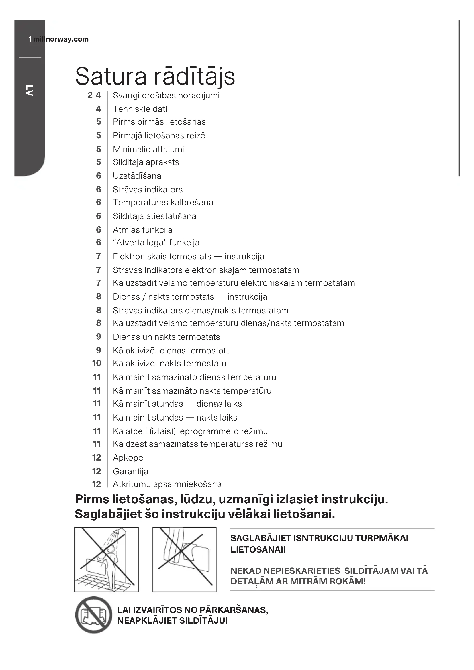 Svarīgi drošības norādījumi Tehniskie dati Pirms pirmās lietošanas Pirmajā lietošanas reizē Minimālie attālumi Silditaja apraksts Uzstādīšana Strāvas indikators Temperatūras kalbrēšana Sildītāja atiestatīšana Atmiđas funkcija “Atvērta loga” funkcija Elektroniskais termostats — instrukcija Strāvas indikators elektroniskajam termostatam Kā uzstādīt vēlamo temperatūru elektroniskajam termostatam Dienas / nakts termostats — instrukcija Strāvas indikators dienas/nakts termostatam Kā uzstādīt vēlamo temperatūru dienas/nakts termostatam Dienas un nakts termostats Kā aktivizēt dienas termostatu Kā aktivizēt nakts termostatu Kā mainīt samazināto dienas temperatūru Kā mainīt samazināto nakts temperatūru Kā mainīt stundas — dienas laiks Kā mainīt stundas — nakts laiks Kā atcelt (izlaist) ieprogrammēto režīmu Kā dzēst samazinātās temperatūras režīmu Apkope Garantija Atkritumu apsaimniekošana Pirms lietošanas, lūdzu, uzmanīgi izlasiet instrukciju. Saglabājiet šo instrukciju vēlākai lietošanai.