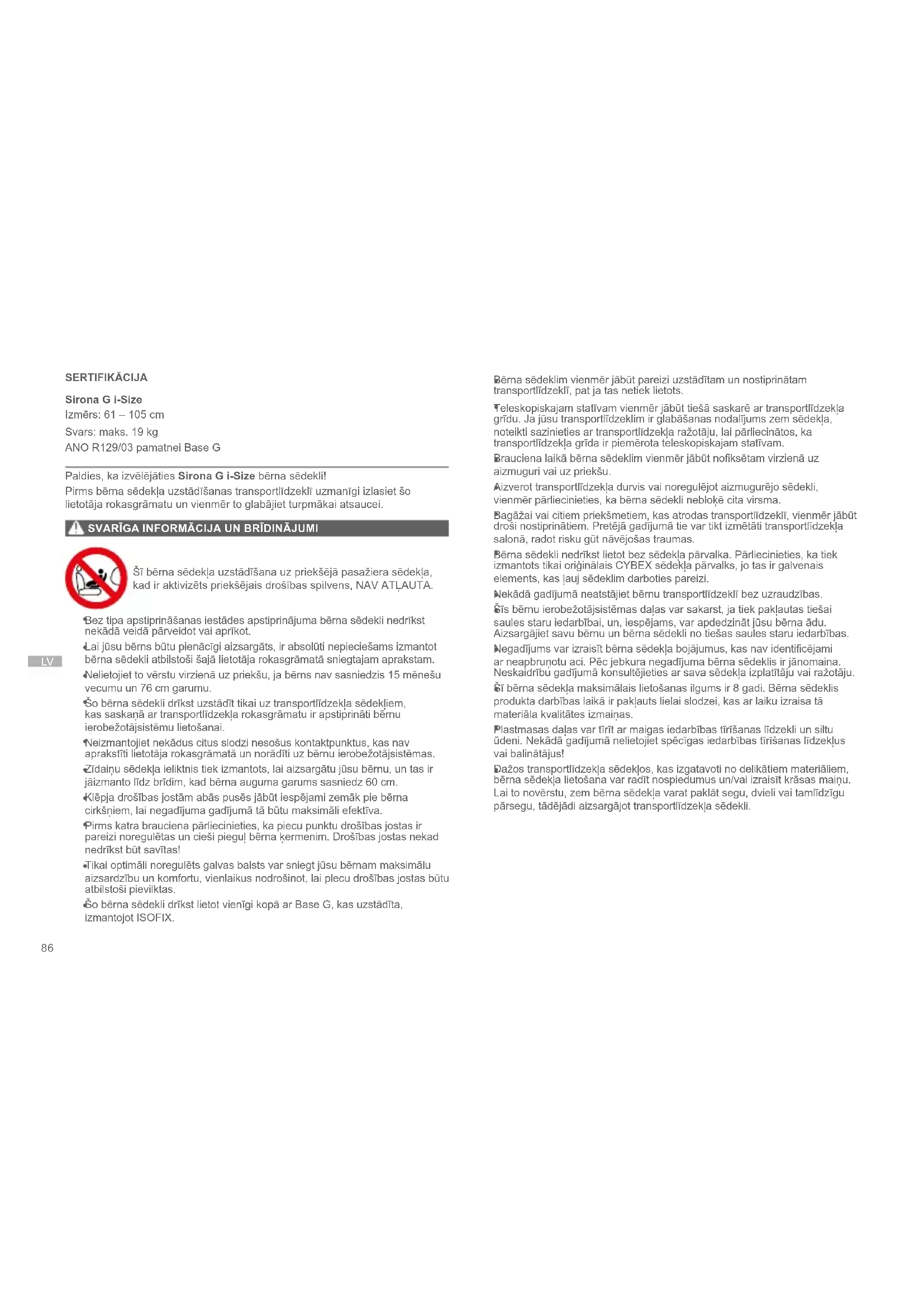 SERTIFIKĀCIJA Sirona G i-Size Izmērs: 61 – 105 cm Svars: maks. 19 kg ANO R129/03 pamatnei Base G Paldies, ka izvēlējāties Sirona G i-Size bērna sēdekli! Pirms bērna sēdekļa uzstādīšanas transportlīdzeklī uzmanīgi izlasiet šo lietotāja rokasgrāmatu un vienmēr to glabājiet turpmākai atsaucei. SVARĪGA INFORMĀCIJA UN BRĪDINĀJUMI Šī bērna sēdekļa uzstādīšana uz priekšējā pasažiera sēdekļa, kad ir aktivizēts priekšējais drošības spilvens, NAV ATĻAUTA.