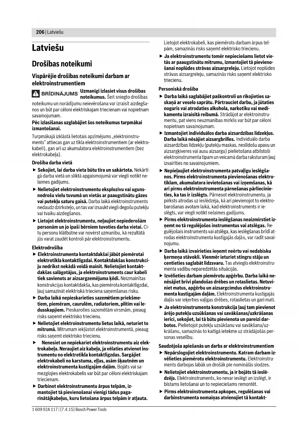 OBJ_BUCH-1808-002.book Page 210 Tuesday, April 7, 2015 4:33 PMLatviešu | 211 Bosch Power Tools 1 609 92A 117 | (7.4.15) Putekļu un skaidu uzsūkšana Dažu materiālu, piemēram, svinu saturošu krāsu, dažu koksnes šķirņu, minerālu un metālu putekļi var būt kaitīgi veselībai. Pieskaršanās šādiem putekļiem vai to ieelpoša- na var izraisīt alerģiskas reakcijas vai elpošanas ceļu sa- slimšanu elektroinstrumenta lietotājam vai darba vietai tu- vumā esošajām personām. Atsevišķu materiālu putekļi, piemēram, putekļi, kas rodas, zāģējot ozola vai dižskābarža koksni, var izraisīt vēzi, īpaši tad, ja koksne iepriekš ir tikusi ķīmiski apstrādāta (ar hro- mātu vai koksnes aizsardzības līdzekļiem). Azbestu saturo- šus materiālus drīkst apstrādāt vienīgi personas ar īpašā