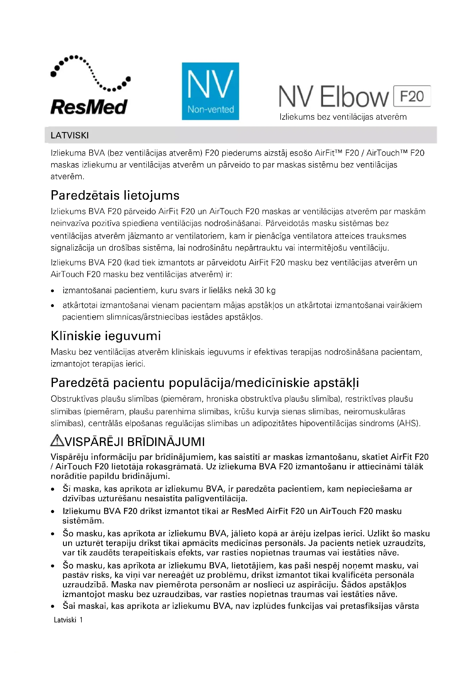 - Izliekumu BVA F20 drīkst izmantot tikai ar ResMed AirFit F20 un AirTouch F20 masku sistēmām.