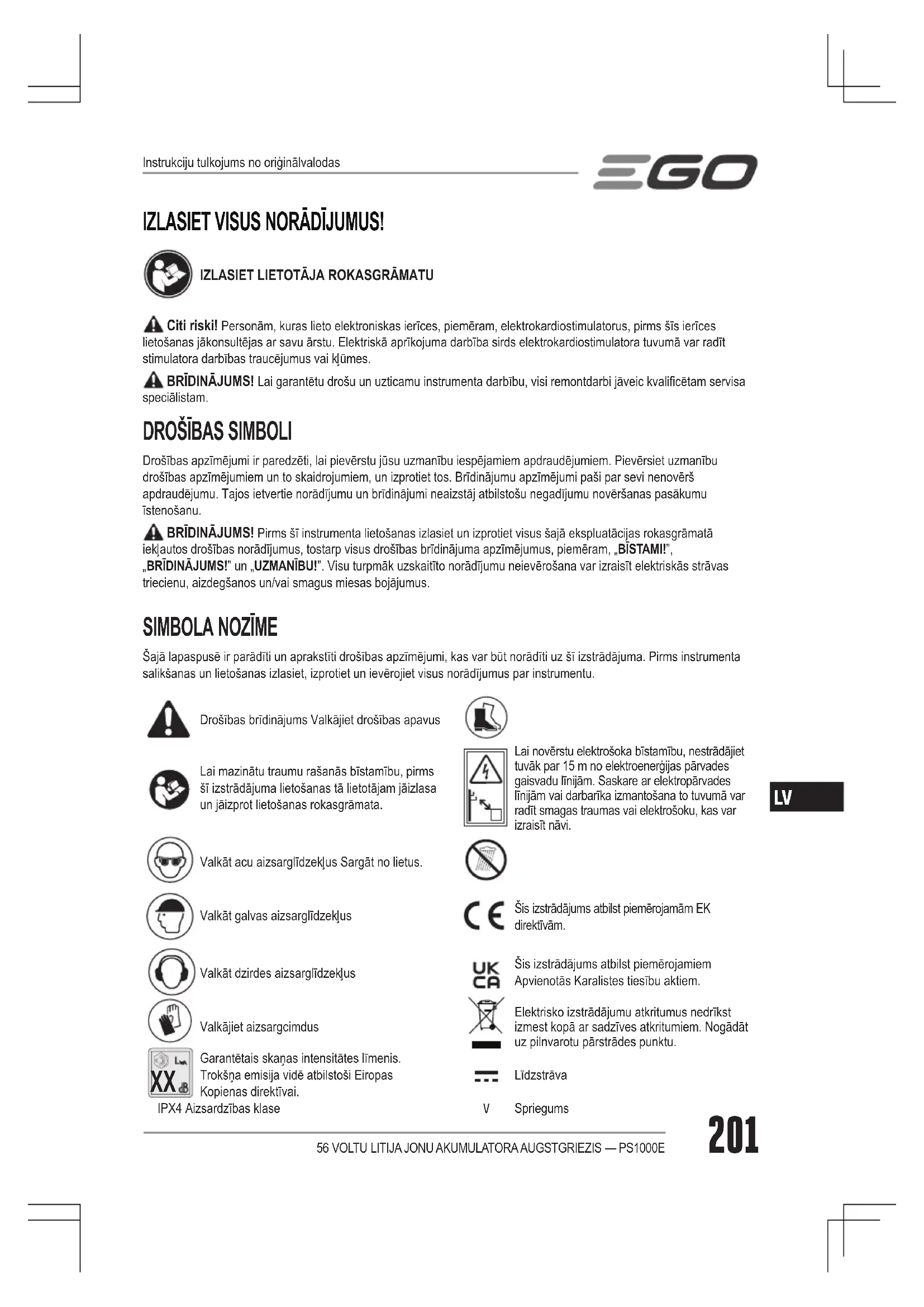 Garantētais skaņas intensitātes līmenis. Trokšņa emisija vidē atbilstoši Eiropas Kopienas direktīvai.LīdzstrāvaIPX4 Aizsardzības klase SpriegumsInstrukciju tulkojums no oriģinālvalodas56 VOLTU LITIJA JONU AKUMULATORA AUGSTGRIEZIS — PS1000E202