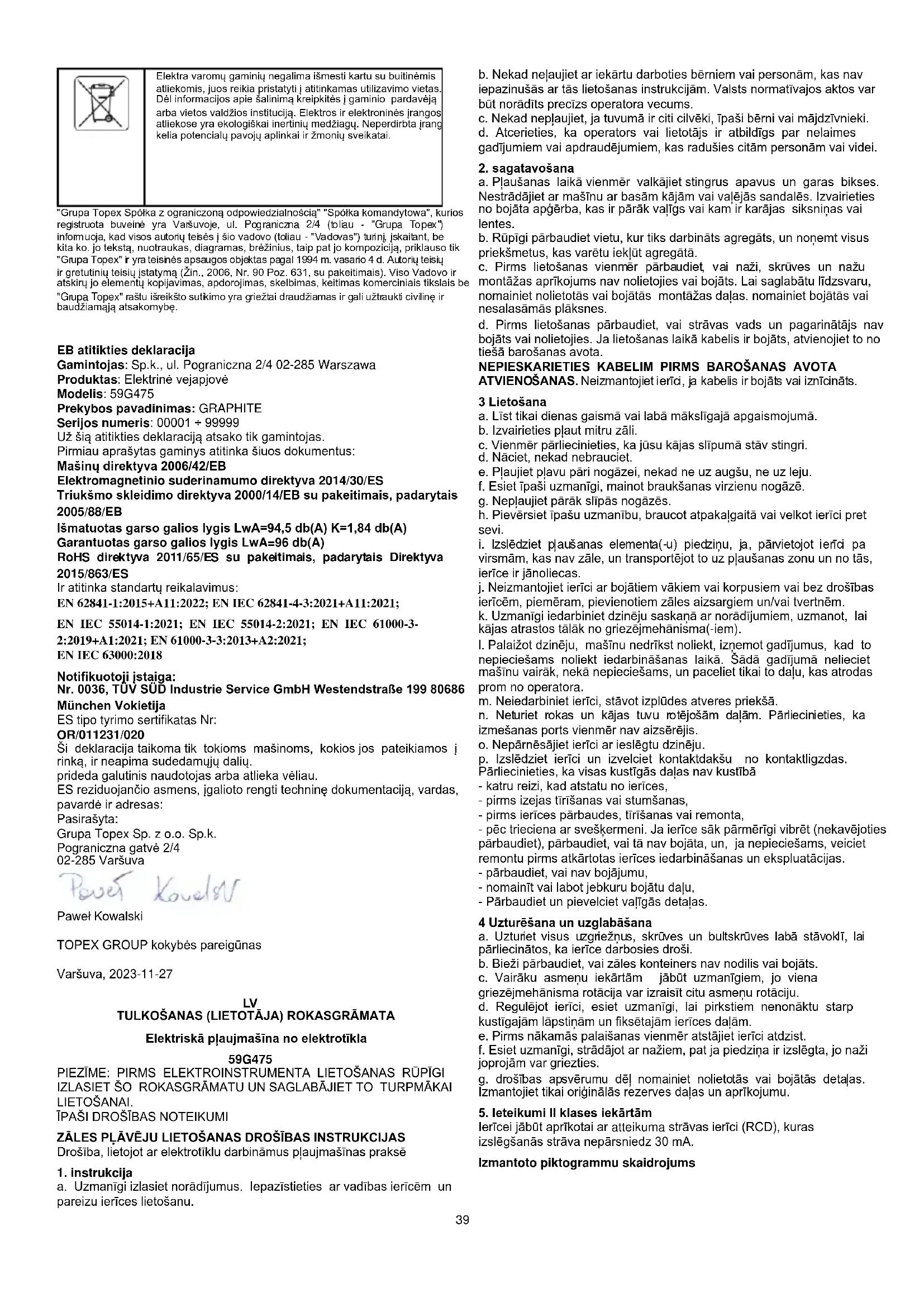 EK atbilstības deklarācija Ražotājs: z o.o. Sp.k., ul. Pograniczna 2/4 02-285 Warszawa Izstrādājums: Elektriskā pļaujmašīna Modelis: 59G475 Tirdzniecības nosaukums: GRAPHITE Sērijas numurs: 00001 ÷ 99999 Šī atbilstības deklarācija ir izdota uz ražotāja atbildību. Iepriekš aprakstītais izstrādājums atbilst šādiem dokumentiem: Mašīnu direktīva 2006/42/EK Elektromagnētiskās saderības direktīva 2014/30/ES Trokšņa emisijas direktīva 2000/14/EK, kurā grozījumi izdarīti ar 2005/88/EK Izmērītais skaņas jaudas līmenis LwA=94,5 db(A) K=1,84 db(A) Garantētais skaņas jaudas līmenis LwA=96 db(A) RoHS Direktīva 2011/65/ES, kurā grozījumi izdarīti ar Direktīvu 2015/863/ES Un atbilst standartu prasībām: EN 62841-1:2015+A11:2022; EN IEC 62841-4-3:2021+A11:2021; EN IEC 55014-1:2021; EN IEC 55014-2:2021; EN IEC 61000-3- 2:2019+A1:2021; EN 61000-3-3:2013+A2:2021; EN IEC 63000:2018 Paziņotā iestāde: Nr. 0036, TÜV SÜD Industrie Service GmbH Westendstraße 199 80686 München Vācija ES tipa pārbaudes sertifikāts Nr: OR/011231/020 Šī deklarācija attiecas tikai uz tirgū laistajām mašīnām, un tā neattiecas uz sastāvdaļām. pievieno galalietotājs vai veic vēlāk. Tās ES rezidējošās personas vārds, uzvārds un adrese, kura ir pilnvarota sagatavot tehnisko dokumentāciju: Parakstīts uzņēmuma vārdā: Grupa Topex Sp. z o.o. Sp.k. Pograniczna iela 2/4 02-285 Varšava Paweł Kowalski TOPEX GROUP kvalitātes speciālists Varšava, 2023-11-27