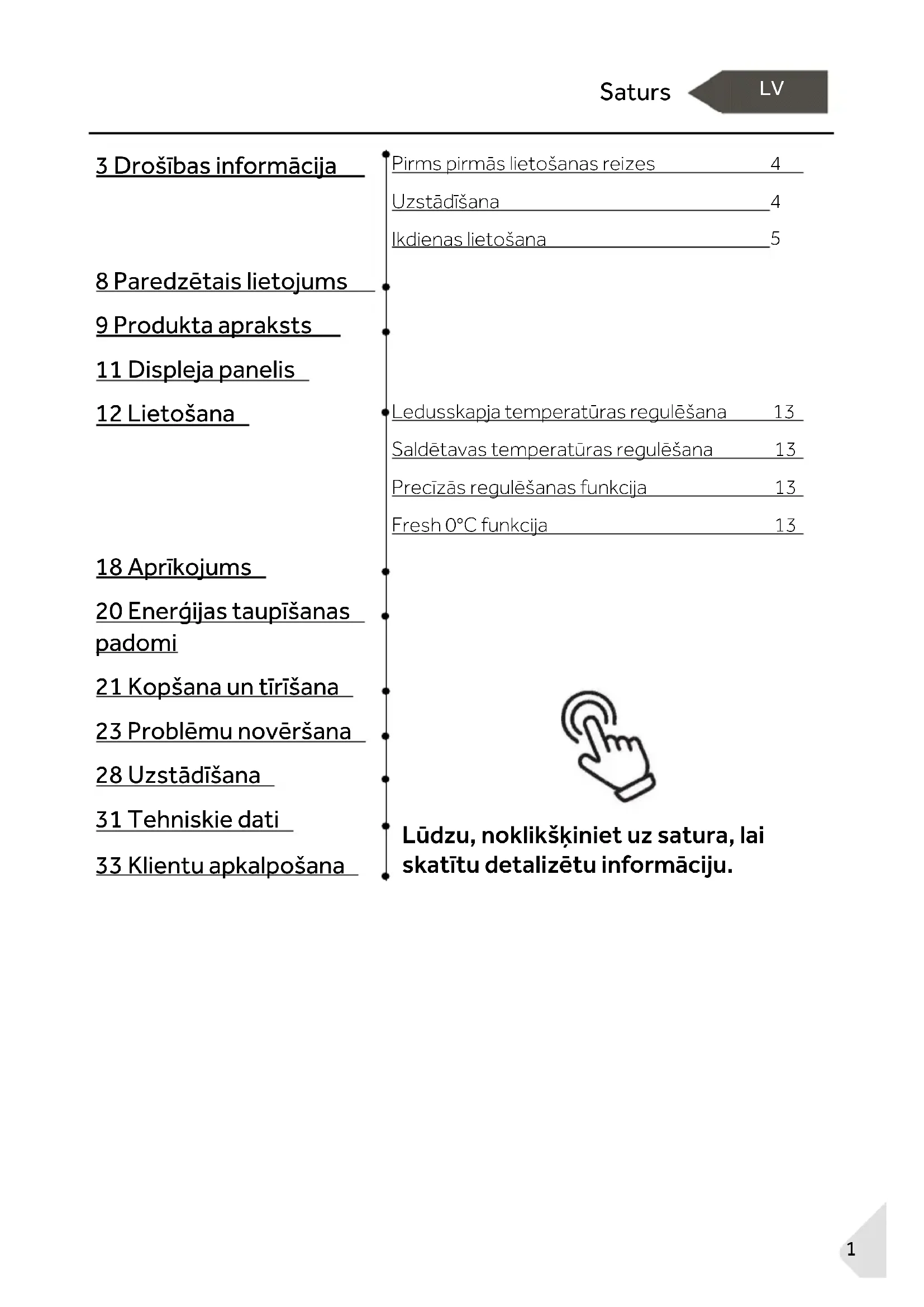18 Aprīkojums Lūdzu, noklikšķiniet uz satura, lai skatītu detalizētu informāciju. 20 Enerģijas taupīšanas padomi 21 Kopšana un tīrīšana 23 Problēmu novēršana 28 Uzstādīšana 31 Tehniskie dati 33 Klientu apkalpošanaPaldies!