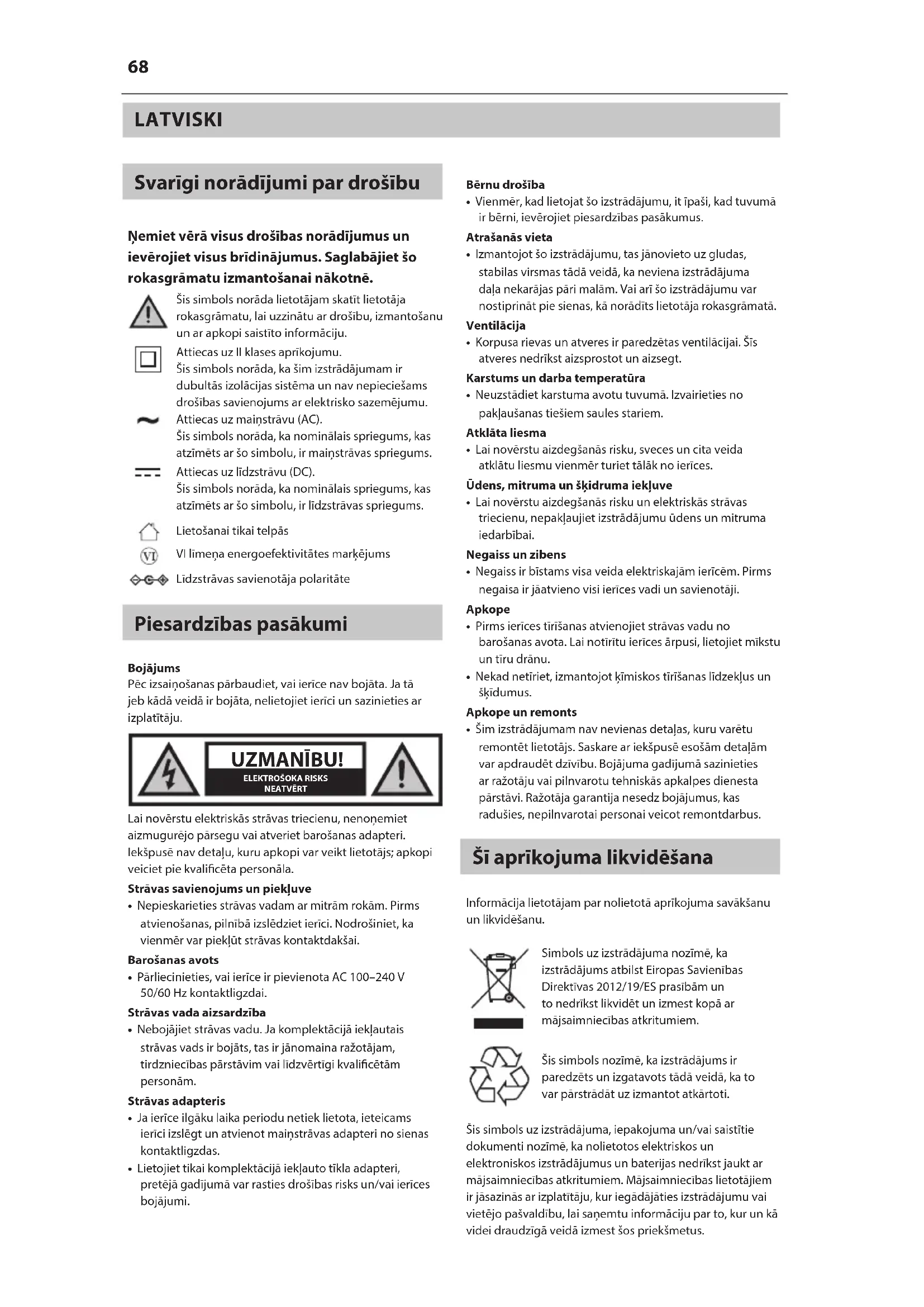 Šis simbols norāda lietotājam skatīt lietotāja rokasgrāmatu, lai uzzinātu ar drošību, izmantošanu un ar apkopi saistīto informāciju.Attiecas uz IIklases aprīkojumu.Šis simbols norāda, ka šim izstrādājumam ir dubultās izolācijas sistēma un nav nepieciešams drošības savienojums ar elektrisko sazemējumu.Attiecas uz maiņstrāvu (AC).Šis simbols norāda, ka nominālais spriegums, kas atzīmēts ar šo simbolu, ir maiņstrāvas spriegums.Attiecas uz līdzstrāvu (DC). Šis simbols norāda, ka nominālais spriegums, kas atzīmēts ar šo simbolu, ir līdzstrāvas spriegums.Lietošanai tikai telpāsVI līmeņa energoefektivitātes marķējumsLīdzstrāvas savienotāja polaritāte Piesardzības pasākumi BojājumsPēc izsaiņošanas pārbaudiet, vai ierīce nav bojāta. Ja tā jeb kādā veidā ir bojāta, nelietojiet ierīci un sazinieties ar izplatītāju. UZMANĪBU! ELEKTROŠOKA RISKSNEATVĒRTLai novērstu elektriskās strāvas triecienu, nenoņemiet aizmugurējo pārsegu vai atveriet barošanas adapteri. Iekšpusē nav detaļu, kuru apkopi var veikt lietotājs; apkopi veiciet pie kvalicēta personāla.Strāvas savienojums un piekļuve• Nepieskarieties strāvas vadam ar mitrām rokām. Pirms atvienošanas, pilnībā izslēdziet ierīci. Nodrošiniet, ka vienmēr var piekļūt strāvas kontaktdakšai.Barošanas avots• Pārliecinieties, vai ierīce ir pievienota AC 100–240V 50/60Hz kontaktligzdai.Strāvas vada aizsardzība• Nebojājiet strāvas vadu. Ja komplektācijā iekļautais strāvas vads ir bojāts, tas ir jānomaina ražotājam, tirdzniecības pārstāvim vai līdzvērtīgi kvalicētām personām.Strāvas adapteris• Ja ierīce ilgāku laika periodu netiek lietota, ieteicams ierīci izslēgt un atvienot maiņstrāvas adapteri no sienas kontaktligzdas.• Lietojiet tikai komplektācijā iekļauto tīkla adapteri, pretējā gadījumā var rasties drošības risks un/vai ierīces bojājumi.Bērnu drošība• Vienmēr, kad lietojat šo izstrādājumu, it īpaši, kad tuvumā ir bērni, ievērojiet piesardzības pasākumus.Atrašanās vieta• Izmantojot šo izstrādājumu, tas jānovieto uz gludas, stabilas virsmas tādā veidā, ka neviena izstrādājuma daļa nekarājas pāri malām. Vai arī šo izstrādājumu var nostiprināt pie sienas, kā norādīts lietotāja rokasgrāmatā.Ventilācija• Korpusa rievas un atveres ir paredzētas ventilācijai. Šīs atveres nedrīkst aizsprostot un aizsegt.Karstums un darba temperatūra• Neuzstādiet karstuma avotu tuvumā. Izvairieties no pakļaušanas tiešiem saules stariem.Atklāta liesma• Lai novērstu aizdegšanās risku, sveces un cita veida atklātu liesmu vienmēr turiet tālāk no ierīces.Ūdens, mitruma un šķidruma iekļuve• Lai novērstu aizdegšanās risku un elektriskās strāvas triecienu, nepakļaujiet izstrādājumu ūdens un mitruma iedarbībai.Negaiss un zibens• Negaiss ir bīstams visa veida elektriskajām ierīcēm. Pirms negaisa ir jāatvieno visi ierīces vadi un savienotāji.Apkope• Pirms ierīces tīrīšanas atvienojiet strāvas vadu no barošanas avota. Lai notīrītu ierīces ārpusi, lietojiet mīkstu un tīru drānu.• Nekad netīriet, izmantojot ķīmiskos tīrīšanas līdzekļus un šķīdumus.Apkope un remonts• Šim izstrādājumam nav nevienas detaļas, kuru varētu remontēt lietotājs. Saskare ar iekšpusē esošām detaļām var apdraudēt dzīvību. Bojājuma gadījumā sazinieties ar ražotāju vai pilnvarotu tehniskās apkalpes dienesta pārstāvi. Ražotāja garantija nesedz bojājumus, kas radušies, nepilnvarotai personai veicot remontdarbus. Šī aprīkojuma likvidēšana Informācija lietotājam par nolietotā aprīkojuma savākšanu un likvidēšanu.Simbols uz izstrādājuma nozīmē, ka izstrādājums atbilst Eiropas Savienības Direktīvas 2012/19/ES prasībām un to nedrīkst likvidēt un izmest kopā ar mājsaimniecības atkritumiem.Šis simbols nozīmē, ka izstrādājums ir paredzēts un izgatavots tādā veidā, ka to var pārstrādāt uz izmantot atkārtoti.Šis simbols uz izstrādājuma, iepakojuma un/vai saistītie dokumenti nozīmē, ka nolietotos elektriskos un elektroniskos izstrādājumus un baterijas nedrīkst jaukt ar mājsaimniecības atkritumiem. Mājsaimniecības lietotājiem ir jāsazinās ar izplatītāju, kur iegādājāties izstrādājumu vai vietējo pašvaldību, lai saņemtu informāciju par to, kur un kā videi draudzīgā veidā izmest šos priekšmetus.LV CE un UKCA paziņojums