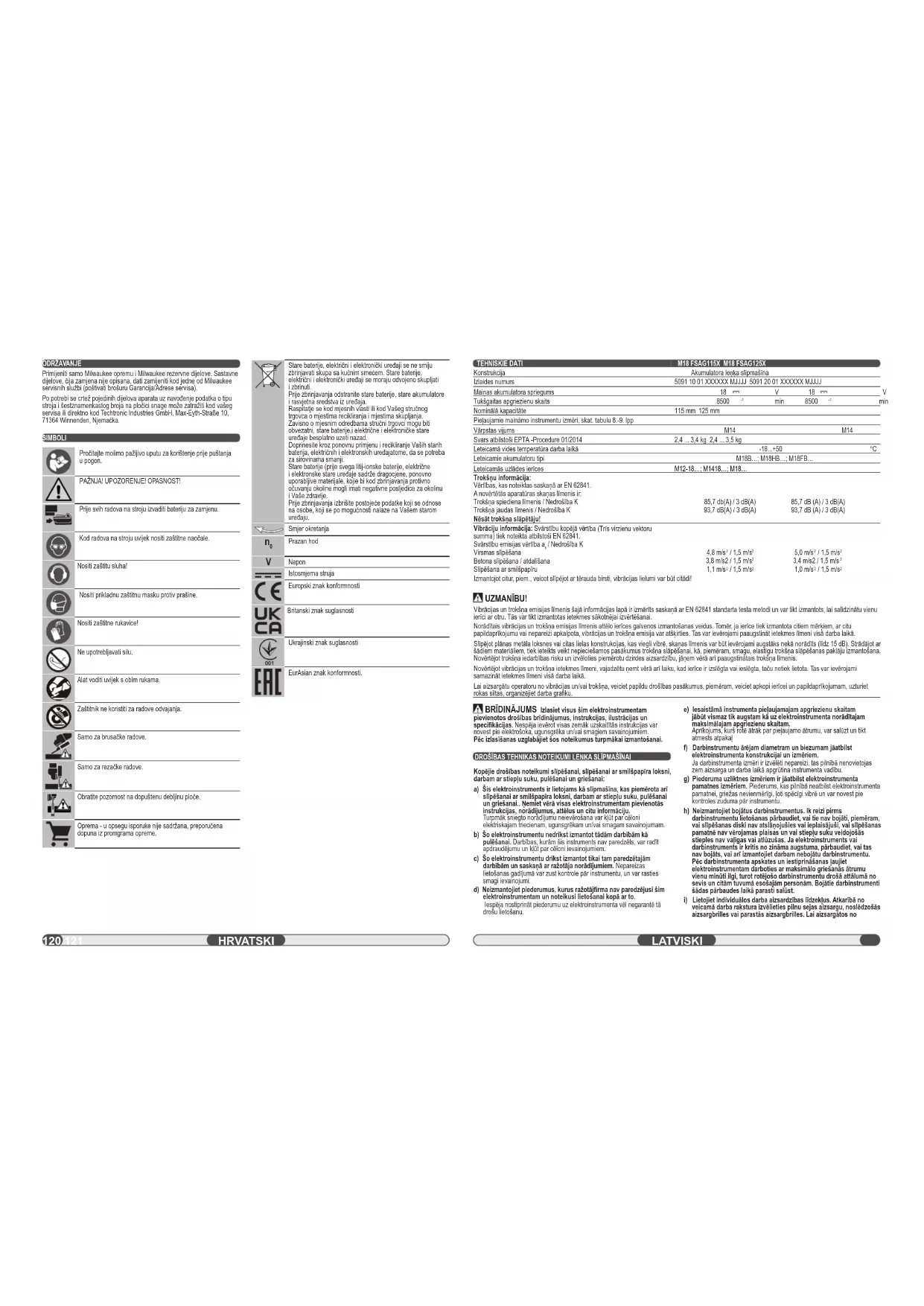 Uzglabājiet maināmos instrumentus aizsargātus no putekļiem sausās, bez sala telpās nemainīgā temperatūrā. Pirms elektroinstrumenta uzglabāšanas vai transportēšanas noņemiet maināmas daļas, lai izvairītos no bojājumiem. Neizmantojiet bojātus instrumentus. Glabāšanas un transportēšanas laikā pasargājiet elektroinstrumentus no tiešiem saules stariem. APKOPE Izmantojiet tikai fi rmu Milwaukee piederumus un fi rmas Milwaukee rezerves daļas. Lieciet nomainīt detaļas, kuru nomaiņa nav aprakstīta, kādā no fi rmu Milwaukee klientu apkalpošanas servisiem. (Skat. brošūru "Garantija/klientu apkalpošanas serviss".) Pēc pieprasījuma, Jūsu Klientu apkalpošanas centrā vai pie Technotronic Industries GmbH, Max-Eyth-Straße 10, 71364 Winnenden, Vācijā, ir iespējams saņemt iekārtas montāžas rasējumu, iepriekš norādot iekārtas modeli un sērijas numuru, kas atrodas uz datu plāksnītes un sastāv no sešiem simboliem. SIMBOLI Pirms sākat lietot instrumentu, lūdzu, izlasiet lietošanas instrukciju. UZMANĪBU! BRĪDINĀJUMS! BĪSTAMI! Pirms mašīnai veikt jebkāda veida apkopes darbus, ir jāizņem ārā akumulātors. Strādājot ar mašīnu, vienmēr jānēsā aizsargbrilles. Nēsāt trokšņa slāpētāju! Jānēsā piemērota maska, kas pasargā no putekļiem. Jāvalkā aizsargcimdi! Nepielietot spēku Vienmēr vadiet instrumentu ar abām rokām. Neizmantojiet aizsargpārsegu griešanas darbiem. Tikai slīpēšanai Tikai atdalīšanai Ievērojiet pieļaujamo diska biezumu. Piederumi - standartaprīkojumā neietvertās, bet ieteicamās papildus komplektācijas detaļas no piederumu programmas. Neutilizējiet bateriju atkritumus, elektrisko un elektronisko iekārtu atkritumus kā nešķirotus sadzīves atkritumus. Bateriju atkritumi un elektrisko un elektronisko iekārtu atkritumi ir jāsavāc atsevišķi. Bateriju atkritumi, akumulatoru atkritumi un gaismas avotu atkritumi ir jānoņem no iekārtas. Sazinieties ar vietējo iestādi vai mazumtirgotāju, lai iegūtu padomus par otrreizējo pārstrādi un savākšanas punktu. Atkarībā no vietējiem noteikumiem, mazumtirgotājiem var būt pienākums bez maksas pieņemt atpakaļ bateriju atkritumus un elektrisko un elektronisko iekārtu atkritumus. Jūsu ieguldījums bateriju atkritumu un elektrisko un elektronisko iekārtu atkritumu atkārtotā izmantošanā un otrreizējā pārstrādē palīdz samazināt pieprasījumu pēc izejvielām. Bateriju atkritumos, īpaši tajos, kas satur litiju, un elektrisko un elektronisko iekārtu atkritumos ir vērtīgi, otrreiz pārstrādājami materiāli, kas var negatīvi ietekmēt vidi un cilvēku veselību, ja tie netiek utilizēti videi draudzīgā veidā. No iekārtu atkritumiem izdzēsiet personāla datus, ja tādi ir. Rotācijas virziena