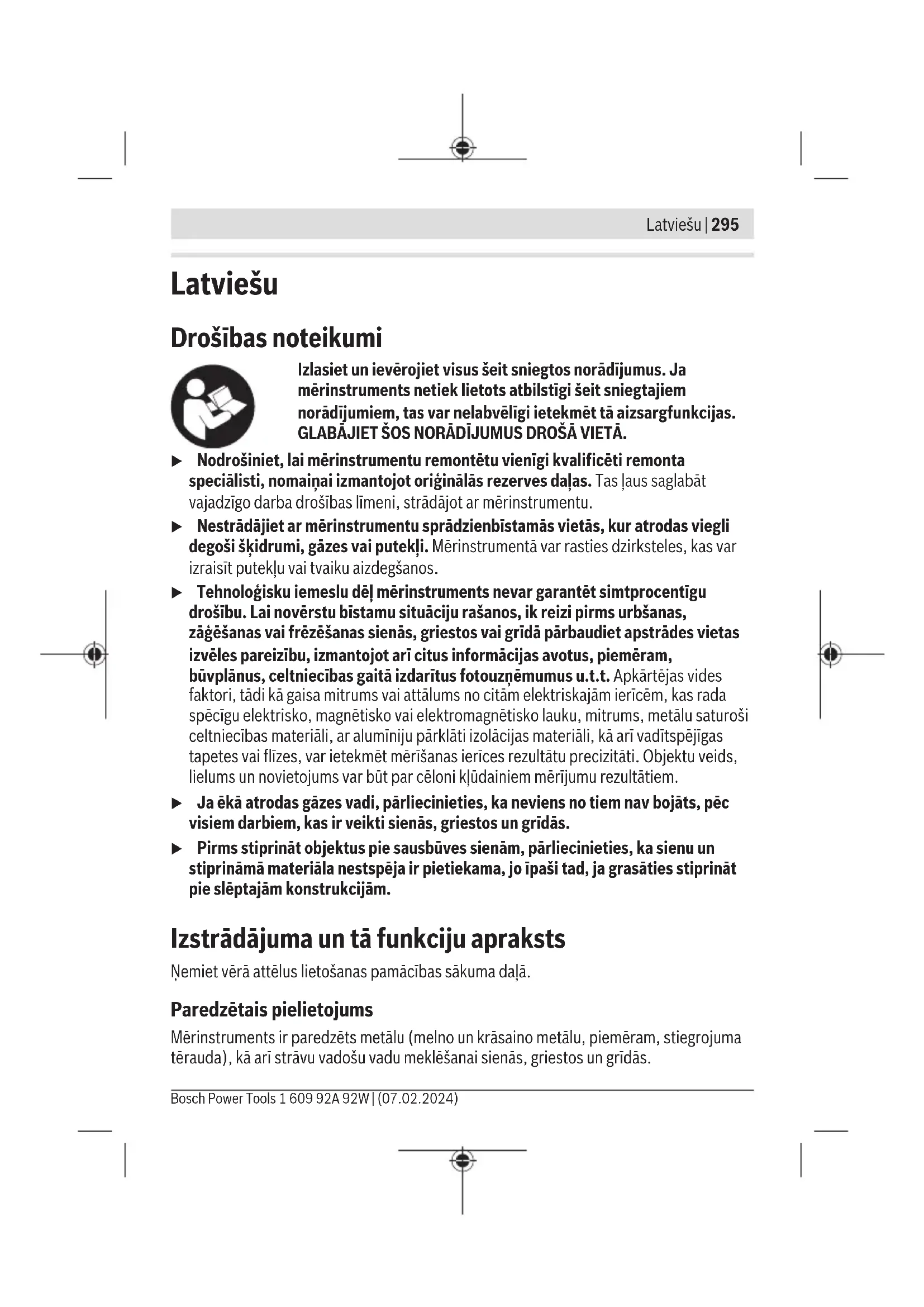 Elektrobarošana – Baterijas (sārma–mangāna) 2×1,5V LR6(AA) – Akumulatori (NiMH) 2×1,2V HR6(AA) – Litija-jonu akumulators (piederums) 3,7V Aptuvenais darbības laiks – ar baterijām (sārma-mangāna) 9st. – ar akumulatoriem (NiMH) 9st. – ar litija-jonu akumulatoru (piederums) 7st. Svars – ar baterijām (sārma-mangāna)/akumulatoriem (NiMH) 0,28 kg – ar litija-jonu akumulatoru (piederums) 0,26kg Izmērs(garums×platums×augstums) 186× 86× 33mm Aizsardzības klase IP54 Litija-jonu akumulators (piederums) BA 3.7V 1.0Ah A Izstrādājuma numurs 1607A350N8 1607A3517H A) Atkarībā no materiāla un objekta lieluma, kā arī pamatnes materiāla un stāvokļa B) ar vara caurulēm ar 15mm diametru C) ar stiegrojuma tēraudu ar 12mm diametru D) ja vadi nav strāvu vadoši, uztveršanas dziļums ir mazs E) Parasti ir vērojams tikai elektronenevadošs piesārņojums, taču dažkārt ir sagaidāma kondensācijas izraisītas pagaidu elektrovadāmības parādīšanās. Mērinstrumenta viennozīmīgai identifikācijai kalpo sērijas numurs(14), kas atrodams uz tā marķējuma plāksnītes. u Pie nelabvēlīgām seguma materiāla īpašībām mērījumu rezultāti to precizitātes un objektu uzmeklēšanas dziļuma ziņā var būt manāmi sliktāki. Bosch Power Tools 1 609 92A 92W | (07.02.2024)298 | Latviešu Mērinstrumenta elektrobarošana Mērinstrumentu var darbināt vai nu ar tirdzniecībā pieejamām baterijām, tirdzniecībā pieejamiem NiMH lādējamām baterijām vai arBosch litija-jonu akumulatoru, kas pieejams kā piederums. Izlasiet un ievērojiet lietošanas instrukciju, kas attiecas uz litija- jonu akumulatoru. Norāde: nekad neuzglabājiet mērinstrumentu bez bateriju nodalījuma vāciņa(12) vai litija-jonu akumulatora, jo īpaši putekļainā vai mitrā vidē. Akumulatoru ievietošana/mainīšana Mērinstrumenta darbināšanai ieteicams izmantot sārma-mangāna baterijas vai NiMH akumulatorus. Lai atvērtu bateriju nodalījuma vāciņu(12), uzspiediet uz fiksatora(13). Noņemiet bateriju nodalījuma vāciņu. Ievietojiet nodalījumā baterijas vai akumulatorus. Ievērojiet pareizu bateriju pievienošanas polaritāti, kas attēlota bateriju nodalījumā. Uzlieciet bateriju nodalījuma vāciņu(12) un ļaujiet tam nofiksēties. Vienmēr vienlaicīgi nomainiet visas baterijas vai akumulatorus. Izmantojiet tikai vienādas ietilpības baterijas vai akumulatorus, kas pagatavoti vienā ražotājfirmā. u Ja mērinstruments ilgāku laiku netiek lietots, izņemiet no tā baterijas vai akumulatorus. Ilgstošanas uzglabāšanas laikā baterijas vai akumulatori mērinstrumentā var korodēt vai izlādēties. Lietošana u Sargājiet mērinstrumentu no mitruma un saules staru tiešas iedarbības. u Nepakļaujiet instrumentu ļoti augstas vai ļoti zemas temperatūras iedarbībai un straujām temperatūras izmaiņām. Lielu temperatūras svārstību gadījumā pirms mērinstrumenta lietošanas nogaidiet, līdz tā temperatūra izlīdzinās ar apkārtējās vides temperatūru. Ekstremālu temperatūras vērtību vai strauju temperatūras izmaiņu iedarbība uz mērinstrumentu var nelabvēlīgi ietekmēt tā precizitāti. u Nepakļaujiet mērinstrumentu stipriem triecieniem, neļaujiet tam krist. Ja mērinstruments ir ticis pakļauts stiprai ārējo faktoru iedarbībai vai tam ir novērojami funkciju traucējumi, mērinstruments jānogādā pārbaudei Bosch pilnvarotā klientu apkalpošanas servisa centrā. u Turiet mērinstrumentu tikai aiz tam paredzētajām satveršanas virsmām (8), lai neietekmētu mērījumu. 1 609 92A 92W | (07.02.2024) Bosch Power ToolsLatviešu | 299 u Nenosedziet zem mērinstrumenta izvietoto sensora lauku(11), tam pārlīmējot uzlīmes vai etiķetes. Mērījumu rezultātus īpaši nelabvēlīgi ietekmē metāla etiķetes. Mērījuma laikā nedrīkst lietot cimdus un ir jābūt nodrošinātam pietiekamam zemējumam. Nepietiekama zemējuma gadījumā var tikt traucēta strāvu vadošo kabeļu atpazīšana. Neveiciet mērījumus pie iekārtām kas izstaro spēcīgu elektrisko, magnētisko vai elektromagnētisko lauku, kā piemēram, mobilie tālruņi, klēpjdatori vai planšetdatori. Izslēdziet visas iekārtas, kuru starojums var ietekmēt mērījumu vai deaktivējiet to funkcijas. Uzsākot lietošanu Ieslēgšana un izslēgšana u Pirms mērinstrumenta ieslēgšanas pārliecinieties, ka tā sensora lauks(11) nav mitrs. Ja izrādās, ka tā ir, apslaukiet mērinstrumentu ar auduma gabaliņu, līdz tas kļūst sauss. u Ja mērinstruments ir ticis pakļauts stiprām temperatūras izmaiņām, pirms ieslēgšanas nogaidiet, līdz temperatūra izlīdzinās. Lai ieslēgtu mērinstrumentu, nospiediet ieslēgšanas/izslēgšanas pogu(7). Lai izslēgtu mērinstrumentu, atkārtoti nospiediet iesl./izsl. taustiņu(7). Ja aptuveni5minūtes netiek nospiests neviens no mērinstrumenta taustiņiem un netiek konstatēti priekšmeti, mērinstruments automātiski izslēdzas. Skaņas signāla ieslēgšana un izslēgšana Ar skaņas signāla taustiņu(6) var ieslēgt un izslēgt skaņas signālu. Funkcionēšana (attēlsA) Mērinstruments ļauj līdz maksimālajam uzmeklēšanas dziļumam pārbaudīt pamatni zem tā sensora lauka(11) mērīšanas virzienāA. Katrā mērīšanas reizē automātiski tiek meklēti metāla priekšmeti (piem., vara caurules vai stiegrojuma tērauds) un spriegumu vadoši vadi (50–60Hz). Mērīšana (skatīt attēluB) Novietojiet mērinstrumentu uz virsmas, kuru vēlaties izmeklēt. Gaismas gredzens(2) iedegas, lai norādītu gatavību uzsākt mērīšanu. Vienmērīgi turiet mērinstrumentu aiz satveršanas virsmas(8). Nemainiet mērīšanas laikā mērinstrumenta satvērumu un nepieskarieties sensora darbības zonai(11). Bosch Power Tools 1 609 92A 92W | (07.02.2024)300 | Latviešu Nedaudz uzspiežot, pārvietojiet mērinstrumentu vienmēr taisnā līnijā B virzienā pāri pamatnei tā, lai to nepaceltu un nemainītu piespiešanas spēku. M
