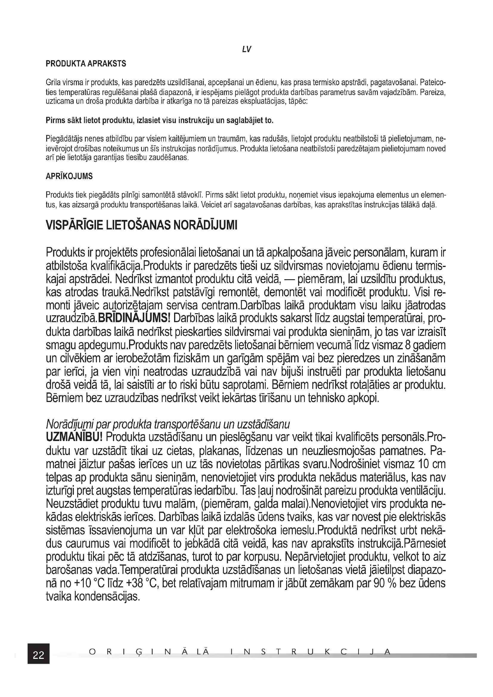 PRODUKTA APRAKSTS Grila virsma ir produkts, kas paredzēts uzsildīšanai, apcepšanai un ēdienu, kas prasa termisko apstrādi, pagatavošanai. Pateico- ties temperatūras regulēšanai plašā diapazonā, ir iespējams pielāgot produkta darbības parametrus savām vajadzībām. Pareiza, uzticama un droša produkta darbība ir atkarīga no tā pareizas ekspluatācijas, tāpēc: Pirms sākt lietot produktu, izlasiet visu instrukciju un saglabājiet to. Piegādātājs nenes atbildību par visiem kaitējumiem un traumām, kas radušās, lietojot produktu neatbilstoši tā pielietojumam, ne- ievērojot drošības noteikumus un šīs instrukcijas norādījumus. Produkta lietošana neatbilstoši paredzētajam pielietojumam noved arī pie lietotāja garantijas tiesību zaudēšanas. APRĪKOJUMS Produkts tiek piegādāts pilnīgi samontēt ā stāvoklī. Pirms sākt lietot produktu, noņemiet visus iepakojuma elementus un elemen- tus, kas aizsargā produktu transportēšanas laikā. Veiciet arī sagatavošanas darbības, kas aprakstītas instrukcijas tālākā daļā. VISPĀRĪGIE LIETOŠANAS NORĀDĪJUMI Produkts ir projektēts profesionālai lietošanai un tā apkalpošana jāveic personālam, kuram ir atbilstoša kvalifi kācija.Produkts ir paredzēts tieši uz sildvirsmas novietojamu ēdienu termis- kajai apstrādei. Nedrīkst izmantot produktu citā veidā, — piemēram, lai uzsildītu produktus, kas atrodas traukā.Nedrīkst patstāvīgi remontēt, demontēt vai modifi cēt produktu. Visi re- monti jāveic autorizētajam servisa centram.Darbības laikā produktam visu laiku jāatrodas uzraudzībā.BRĪDINĀJUMS! Darbības laikā produkts sakarst līdz augstai temperatūrai, pro- dukta darbības laikā nedrīkst pieskarties sildvirsmai vai produkta sieniņām, jo tas var izraisīt smagu apdegumu.Produkts nav paredzēts lietošanai bērniem vecumā līdz vismaz 8 gadiem un cilvēkiem ar ierobežotām fi ziskām un garīgām spējām vai bez pieredzes un zināšanām par ierīci, ja vien viņi neatrodas uzraudzībā vai nav bijuši instruēti par produkta lietošanu drošā veidā tā, lai saistīti ar to riski būtu saprotami. Bērniem nedrīkst rotaļāties ar produktu. Bērniem bez uzraudzības nedrīkst veikt iekārtas tīrīšanu un tehnisko apkopi. Norādījumi par produkta transportēšanu un uzstādīšanu UZMANĪBU! Produkta uzstādīšanu un pieslēgšanu var veikt tikai kvalifi cēts personāls.Pro- duktu var uzstādīt tikai uz cietas, plakanas, līdzenas un neuzliesmojošas pamatnes. Pa- matnei jāiztur pašas ierīces un uz tās novietotas pārtikas svaru.Nodrošiniet vismaz 10 cm telpas ap produkta sānu sieniņām, nenovietojiet virs produkta nekādus materiālus, kas nav izturīgi pret augstas temperatūras iedarbību. Tas ļauj nodrošināt pareizu produkta ventilāciju. Neuzstādiet produktu tuvu malām, (piemēram, galda malai).Nenovietojiet virs produkta ne- kādas elektriskās ierīces. Darbības laikā izdalās ūdens tvaiks, kas var novest pie elektriskās sistēmas īssavienojuma un var kļūt par elektrošoka iemeslu.Produktā nedrīkst urbt nekā- dus caurumus vai modifi cēt to jebkādā citā veidā, kas nav aprakstīts instrukcijā.Pārnesiet produktu tikai pēc tā atdzīšanas, turot to par korpusu. Nepārvietojiet produktu, velkot to aiz barošanas vada.Temperatūrai produkta uzstādīšanas un lietošanas vietā jāietilpst diapazo- nā no +10 °C līdz +38 °C, bet relatīvajam mitrumam ir jābūt zemākam par 90 % bez ūdens tvaika kondensācijas.23
