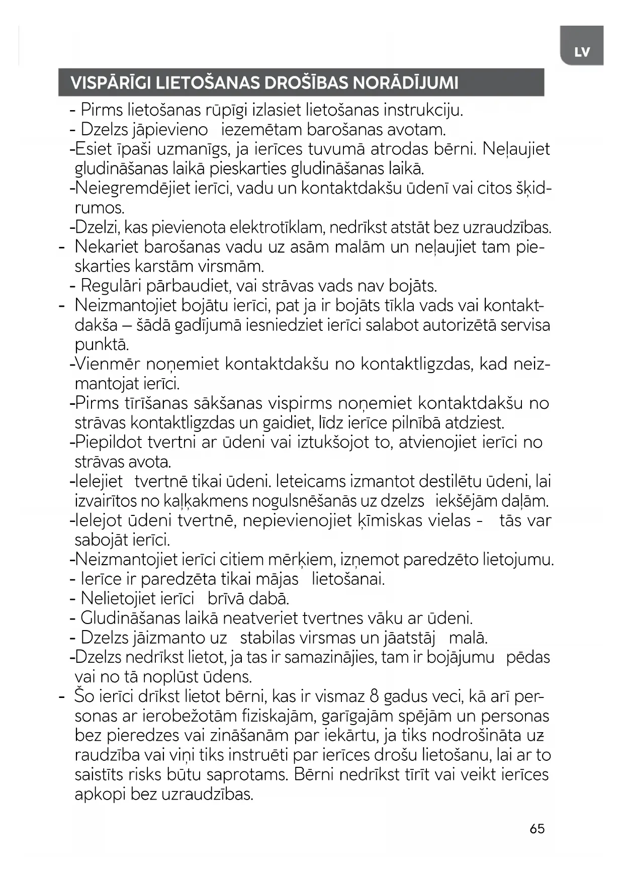 Glabājiet ierīci un tās vadu bērniem līdz 8 gadu vecumam nepie- ejamā vietā. - Bērni nedrīkst spēlēties ar ierīci. - Kad gludināšana ir pabeigta, izlejiet atlikušo ūdeni tvertnē.