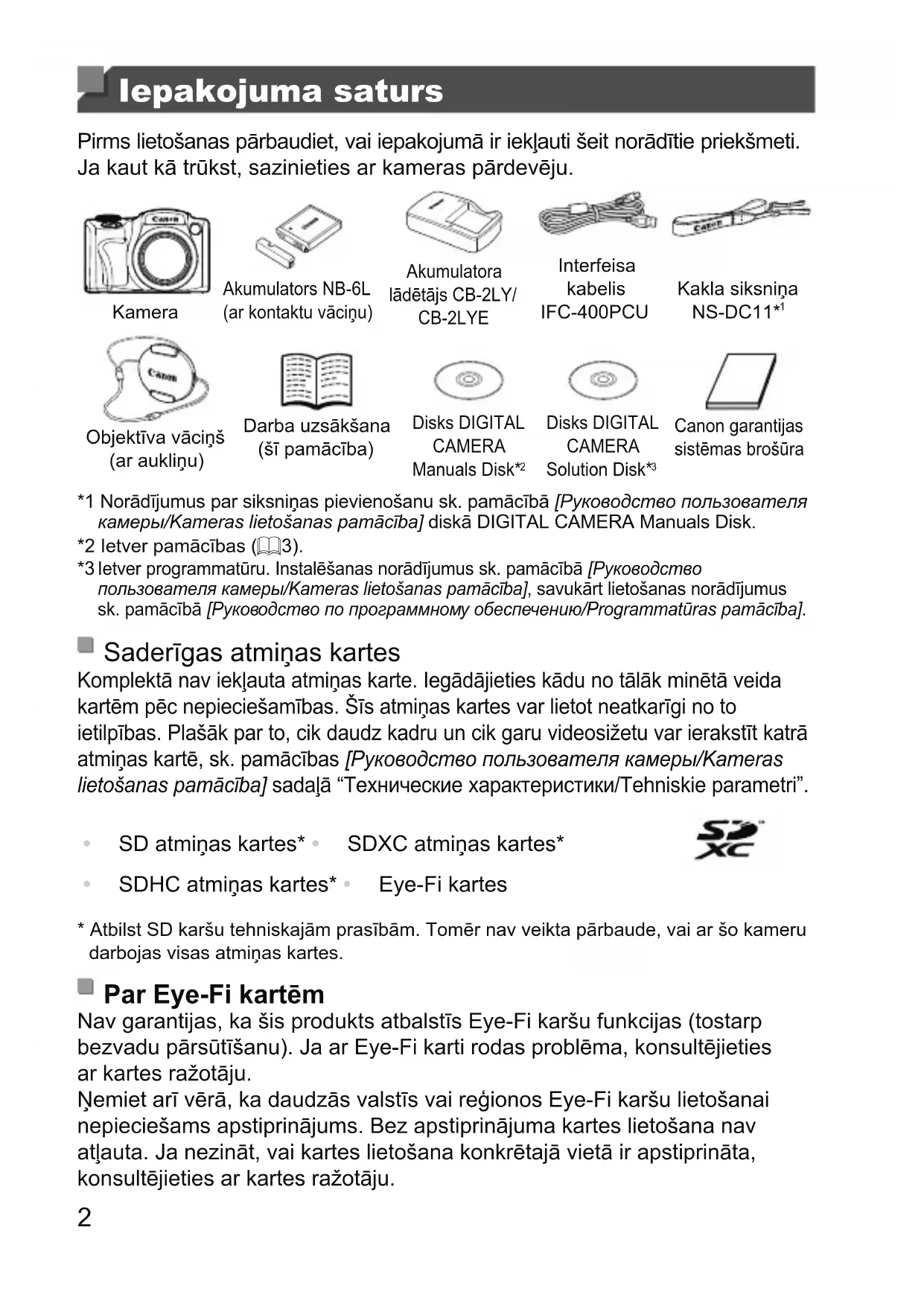 Canon garantijas sistēmas brošūra *1 Norādījumus par siksniņas pievienošanu sk. pamācībā [Руководство пользователя камеры/Kameras lietošanas pamācība] diskā DIGITAL CAMERA Manuals Disk. *2 Ietver pamācības (=3).