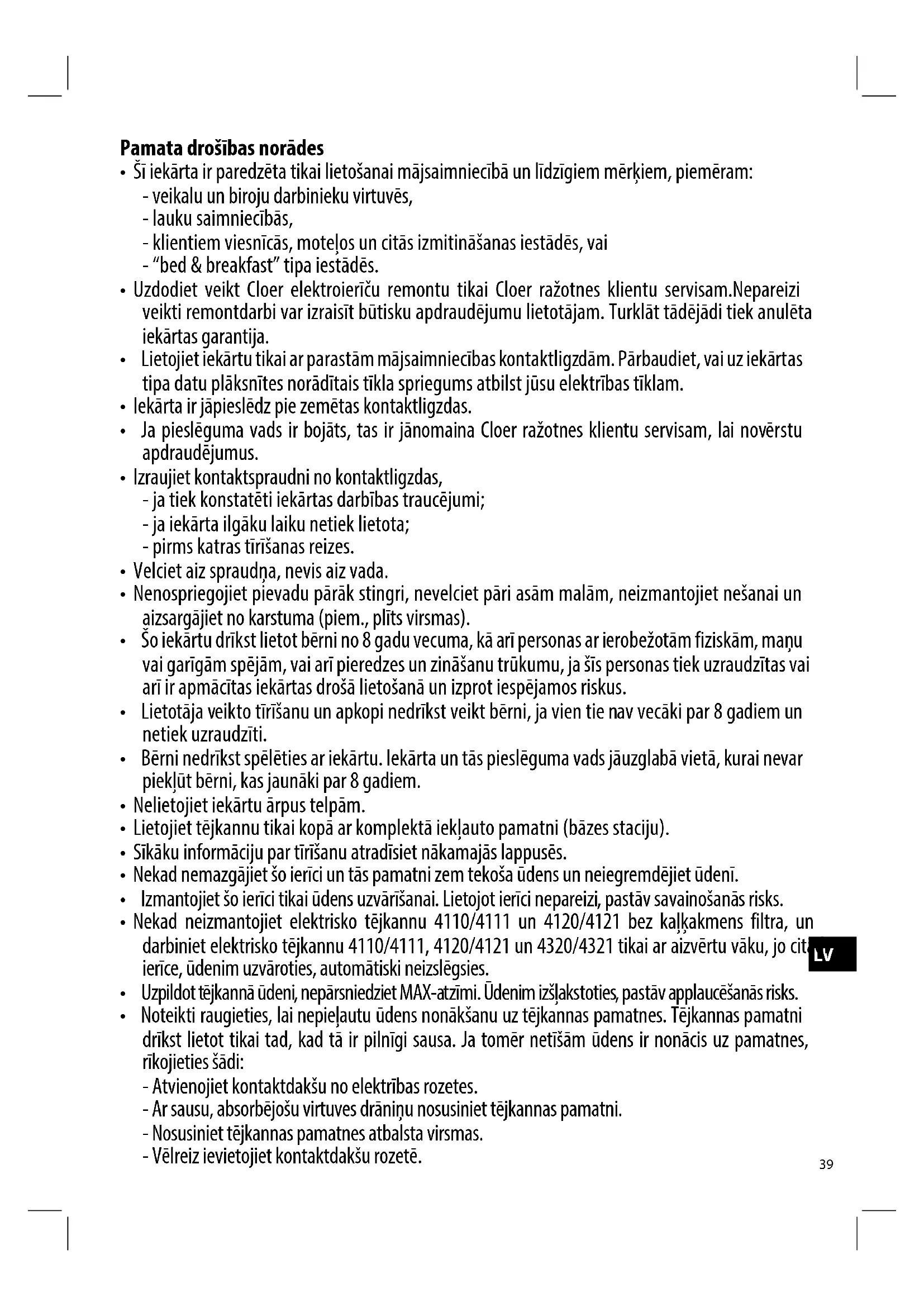 Cloer elektriskās iekārtas atbilst spēkā esošajām EK direktīvām un drošības normatīviem. Ja jūsu Cloer iekārtai tiek konstatēts defekts vai ari tā nepareizi darbojas, vērsieties pie mūsu izplatitāja vai ari Cloer klientu apkalpošanas dienestā. Registrētiem pastāvīgajiem klientiem turklāt ir pieejami ari mūsu klientu apkalpošanas dienesta pakalpojumi.