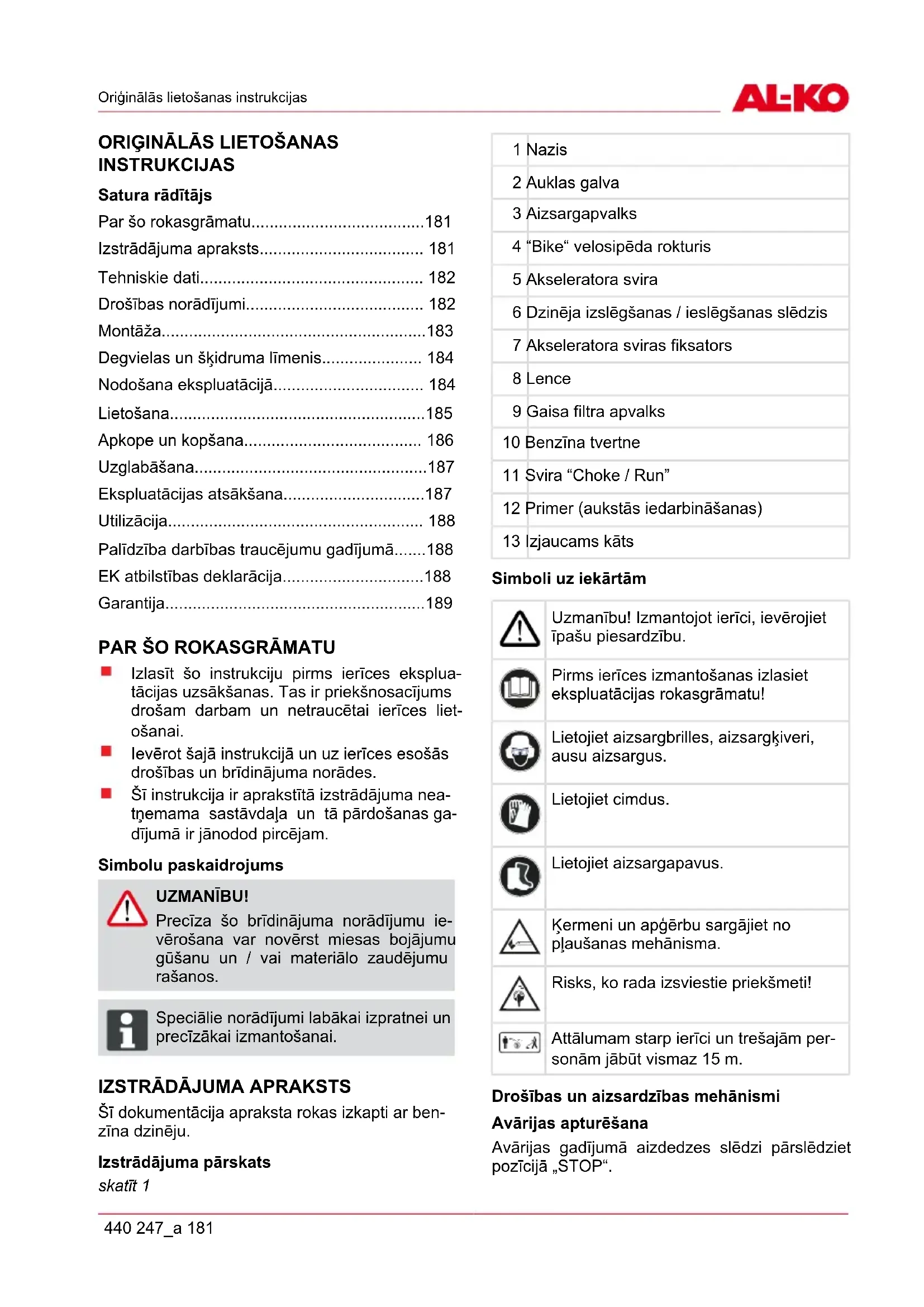 Ar šo mēs apliecinām, ka šis izstrādājums tādā izpildījumā, kādā tas ir nodots tirdzniecībā, atbilst sas- kaņoto ES-direktīvu, ES drošības standartu un ar izstrādājuma specifiku saistīto standartu prasībām. Izstrādājums Ražotājs Pilnvarotais pārstāvis Benzīns sajūtu Modelis BC 4535 II AL-KO Geräte GmbH Ichenhauser Str. 14 D-89359 Kötz Anton Eberle Ichenhauser Str. 14 D-89359 Kötz Sērijas numurs ES direktīvas Saskaņotās tiesību normas G 230 2305 Kötz, 01.06.2012 2006/42/EG 2004/108/EG 2000/14/EG (13) 2002/88/EG ISO 11806:2009-01 ISO 14982:1998-09 Antonio De Filippo Managing Director Skaņas jaudas līmenis izmērītais: 109 dB(A) garantētais: 113 dB(A) Atbilstības novērtējums 2000 /14/EG pielikums VGarantija 440 247_a 189 GARANTIJA Visas iekārtas materiāla vai ražošanas kļūdas likumā noteiktajā noilguma periodā attiecībā uz prasībām par defektiem mēs novēršam atbilstoši mūsu izvēlei- salabojot vai nomainot pret citu. Noilgums tiek noteikts saskaņā ar tās valsts tiesībām, kurā iekārta iegādāta. Mūsu garantija ir spēkā tikai: ievērojot šo lietošanas instrukciju lietpratīgas darbošanās gadījumā izmantojot oriģinālās rezerves daļas Garantija nav spēkā: pašrocīgi veiktu remonta mēģinājumu gadījumā pašrocīgi veiktu tehnisko izmaiņu gadījumā noteikumiem neatbilstošas lietošanas gadījumā Garantija sevī neietver: Krāsas bojājumus, kuri ir saistāmi ar normālu nolietošanos Dilstošās detaļas, kuras rezerves daļu sarakstā ir apzīmētas ar rāmi [xxx xxx(x)] Iekšdedzes motorus (šeit spēkā ir attiecīgā motora ražotāja garantijas noteikumi) Garantija stājas spēkā ar pirkumu, ko veic pirmais gala lietotājs. Noteicošais ir datums uz pirkuma doku- menta. Lūdzu, vērsieties ar šo paskaidrojumu un oriģinālo pirkuma dokumentu pie Jūsu pārdevēja vai tuvākajā autorizētajā klientu apkalpošanas vietā. Ar šo paskaidrojumu likumā noteiktās pircēja defektu prasības pret pārdevēju netiek skartas.ro Instructiuni de folosire originale 190 BC 4535 II-S