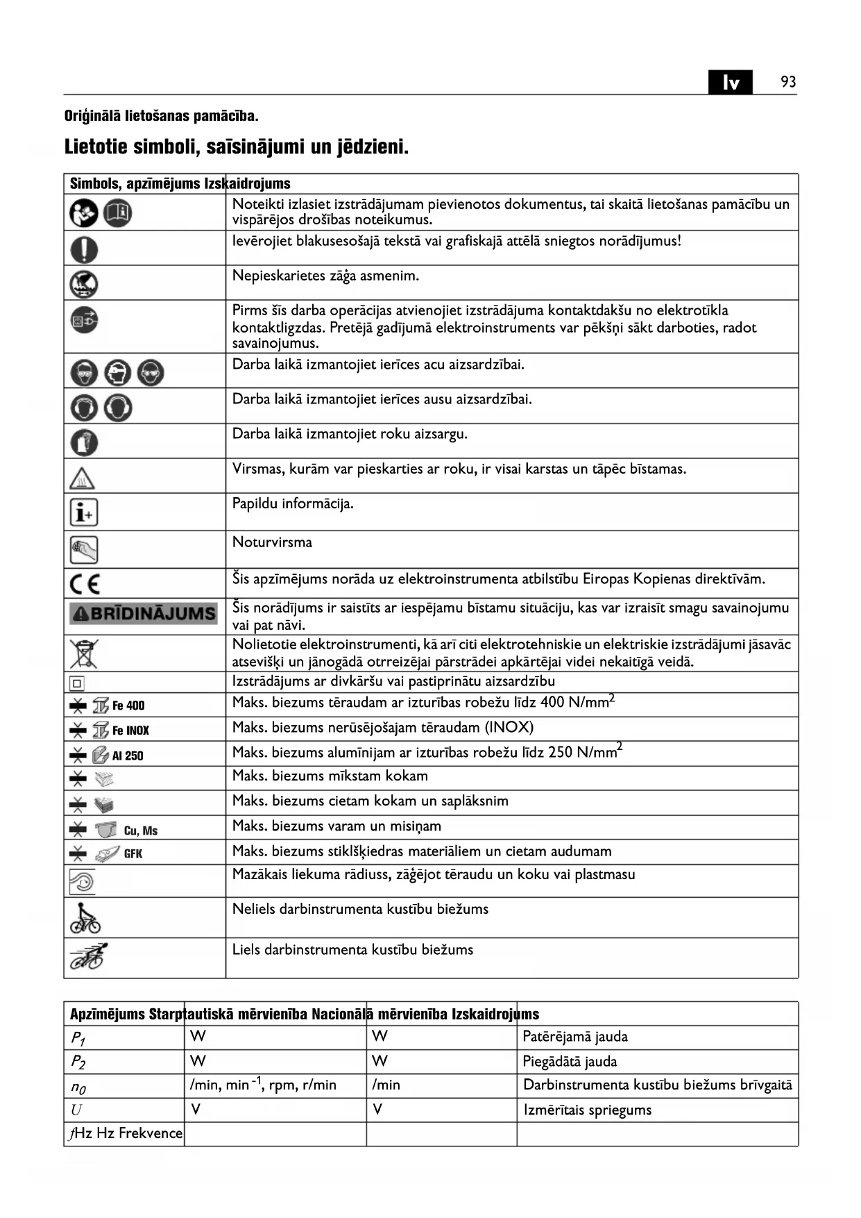 | CE | Śs apzimējums norāda uz elektroinstrumenta atbilstūbu Eiropas Kopienes direktīvām. |