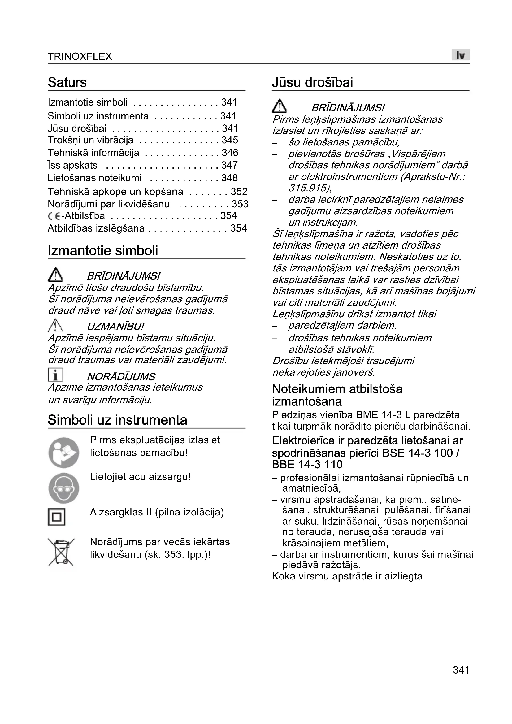 Apzīmē izmantošanas ieteikumus un svarīgu informāciju. Simboli uz instrumenta Pirms ekspluatācijas izlasiet lietošanas pamācību! Lietojiet acu aizsargu! Aizsargklas II (pilna izolācija) Norādījums par vecās iekārtas likvidēšanu (sk. 353. lpp.)! Jūsu drošībai BRĪDINĀJUMS! Pirms leņķslīpmašīnas izmantošanas izlasiet un rīkojieties saskaņā ar: