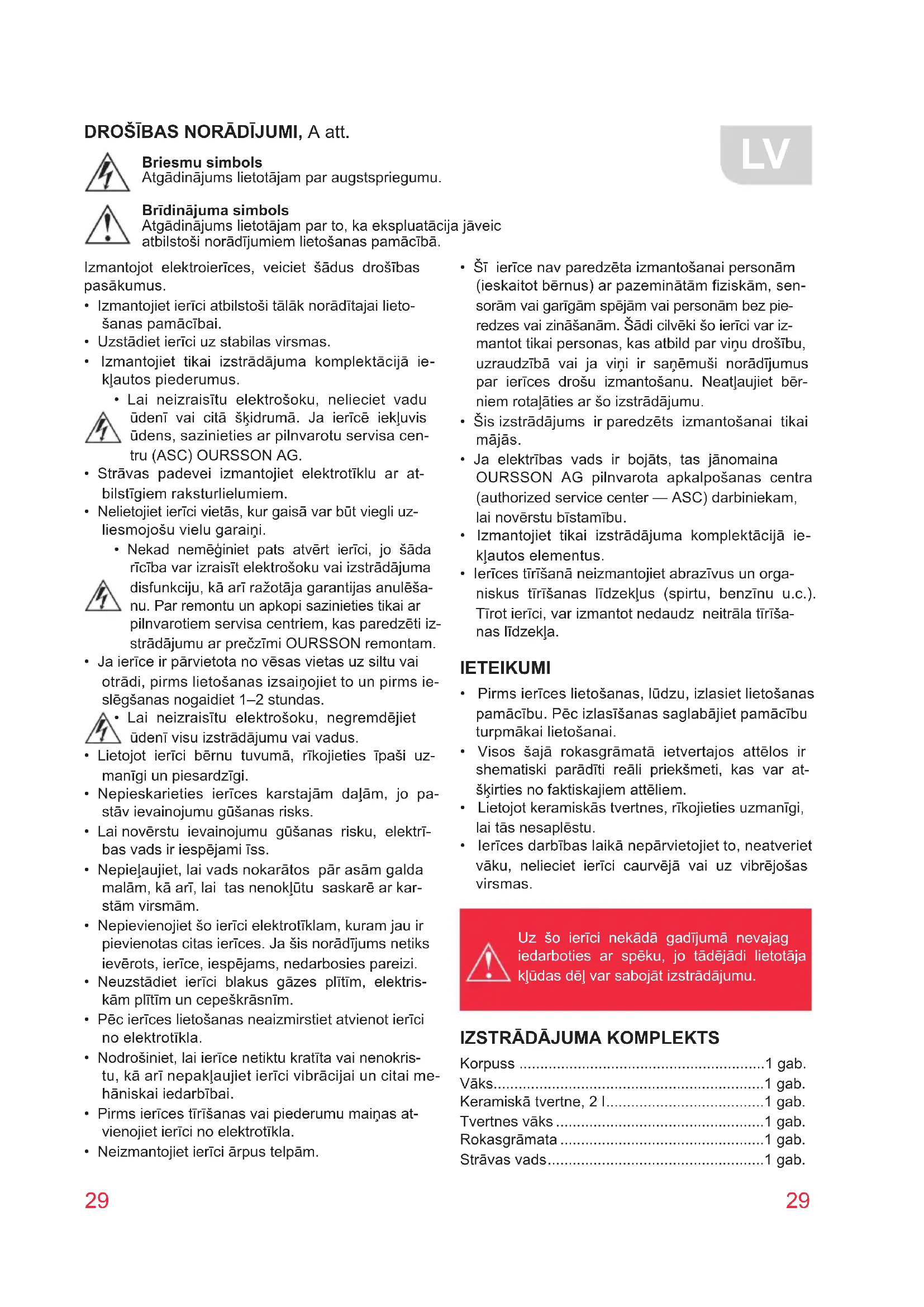 - Ja elektrības vads ir bojāts, tas jānomaina OURSSON AG pilnvarota apkalpošanas centra (authorized service center — ASC) darbiniekam, lai novērstu bīstamību.
