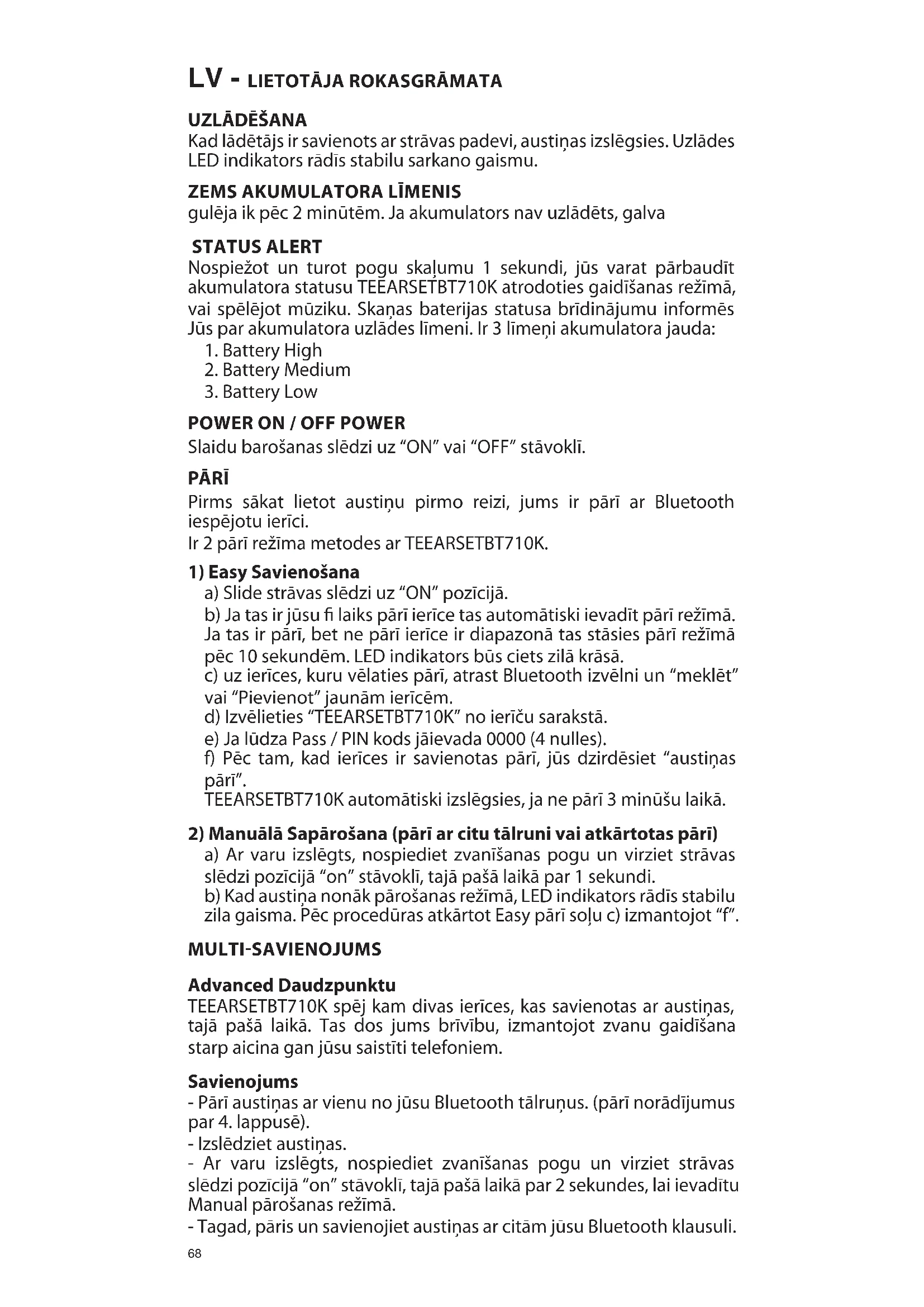 gulēja ik pēc 2 minūtēm. Ja akumulators nav uzlādēts, galva STATUS ALERT Nospiežot un turot pogu skaļumu 1 sekundi, jūs varat pārbaudīt akumulatora statusu TEEARSETBT710K atrodoties gaidīšanas režīmā, vai spēlējot mūziku. Skaņas baterijas statusa brīdinājumu informēs Jūs par akumulatora uzlādes līmeni. Ir 3 līmeņi akumulatora jauda: