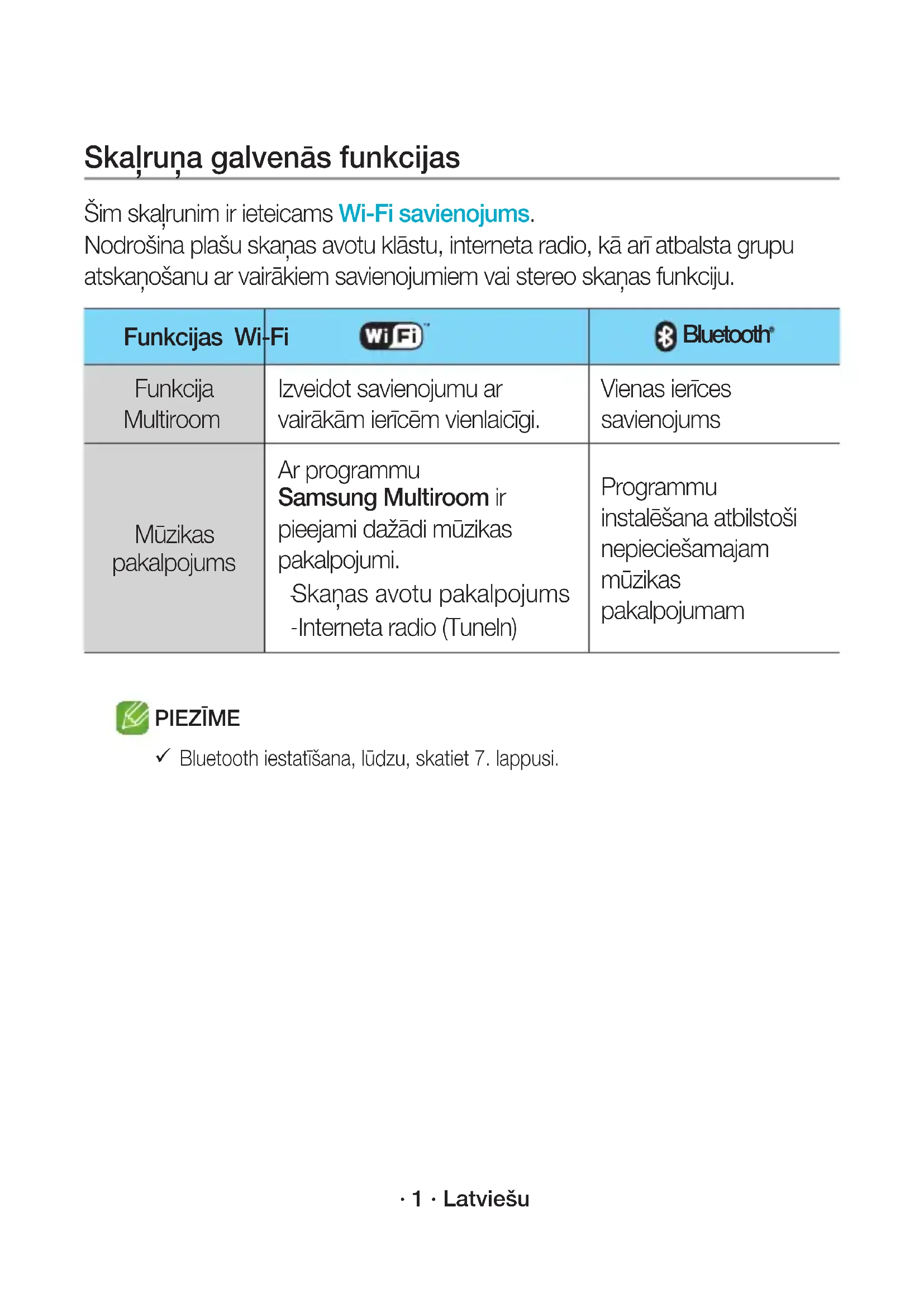 Se non si riesce a stabilire una connessione, si veda “Lista di controllo prima della connessione” a pag. 9 e 10. WAM3501-EN_15p-ITA-QSG_0901.indd 15 2016-09-01 4:56:13· 1 · Latviešu Skaļruņa galvenās funkcijas Šim skaļrunim ir ieteicams Wi-Fi savienojums. Nodrošina plašu skaņas avotu klāstu, interneta radio, kā arī atbalsta grupu atskaņošanu ar vairākiem savienojumiem vai stereo skaņas funkciju. Funkcijas Wi-Fi Bluetooth Funkcija Multiroom Izveidot savienojumu ar vairākām ierīcēm vienlaicīgi. Vienas ierīces savienojums Mūzikas pakalpojums Ar programmu Samsung Multiroom ir pieejami dažādi mūzikas pakalpojumi.