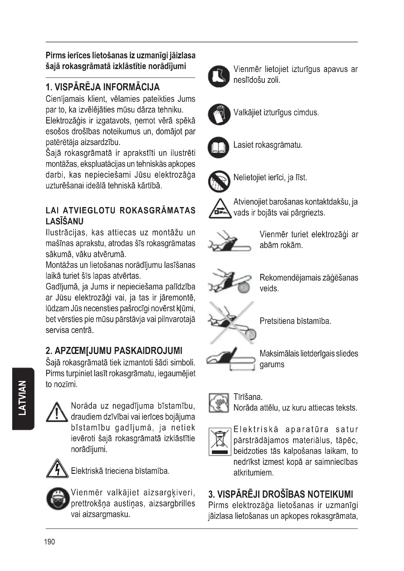 Pirms elektrozāģa lietošanas ir uzmanīgi jāizlasa lietošanas un apkopes rokasgrāmata,191 LATVIAN kā arī jāiepazīstas ar visiem vadības orgāniem, kas nepieciešami ierīces pareizai lietošanai. Turklāt, ir jāglabā šo rokasgrāmatu, lai pie tās varētu vērsties arī nākotnē. Neļaujiet lietot elektrozāģi bērniem un personām, kas nav pilnīgi iepazinušās ar šo instrukciju. Elektrisko ierīču lietošanas laikā vienmēr ir jāievēro drošības pamatnoteikumi, lai samazinātu ugunsgrēka, elektriskā trieciena un traumu gūšanas risku. Aizsargājiet sevi no elektriskajiem triecieniem un izvairieties no nonākšanas saskarē ar iezemētām vai ar korpusu savienotām virsmām. Novietojiet ierīci uzglabāšanas vietā, kamēr tā netiek lietota. Kad ierīce netiek izmantota, tā ir novieto sausā un slēgtā bērniem nepieejamā vietā virs zemes līmeņa. Nepakļaujiet ierīci pārmērīgai slodzei. Darbinot ierīci ar piemērotu ātrumu ļaus labāk un drošāk paveikt darbu. # Netīra darba vide vai darbgalds var kļūt par negadījumu avotu. # Nepakļaujiet ierīci mitruma iedarbībai. Nelietojiet ierīci piegāzētā vai ugunsnedrošā vidē. # Lietojiet elektrozāģi tikai tad, kad esat labā formā. Nelietojiet elektrozāģi, ja esat saguris, slikti jūtaties vai atrodaties medikamentu ietekmē. # Iedarbināšanas laikā un darbības laikā turiet elektrozāģi drošā attālumā no sava ķermeņa un apģērba daļām. # Neiedarbiniet elektrozāģi, ja tas ir apgriezts otrādi. # Pārliecinieties, ka iedarbināšanas laikā ķēdei nekas nepieskaras. # Iegaumējiet, ka pēc izslēgšanas elektrozāģis vēl kādu brīdi darbojas. # Uzmaniet materiālu, ko var izsviest griezējierīce. # Neiedarbiniet un nelietojiet elektrozāģi citu personu, dzīvnieku un mantas tuvumā. # Lietošanas laikā tiek rekomendēts uzturēt vismaz 10 m attālumu starp ierīci un citām personām. # Vienmēr turiet ierīci ar abām rokām. # Jūsu stājai jābūt drošai un stabilai. # Pārvietojiet elektrozāģi, turot to aiz rokturiem, nevelciet to aiz elektrības vada, netransportējiet to, kamēr tas ir pievienots pie elektrības tīkla, un turot pirkstus uz slēdža. # Izvairieties no ierīces nejaušas ieslēgšanas. Pirms kontaktdakšas iespraušanas kontaktligzdā pārbaudiet, vai slēdzis ir stāvoklī “Izslēgts”. Ja ierīces pārvietošanas laikā pirksts tiek turēts uz ieslēgšanas slēdža vai kontaktdakšas tiek iesprausta kontaktrozetē, kamēr ierīces slēdzis ir ieslēgtajā stāvoklī, palielinās negadījumu risks.