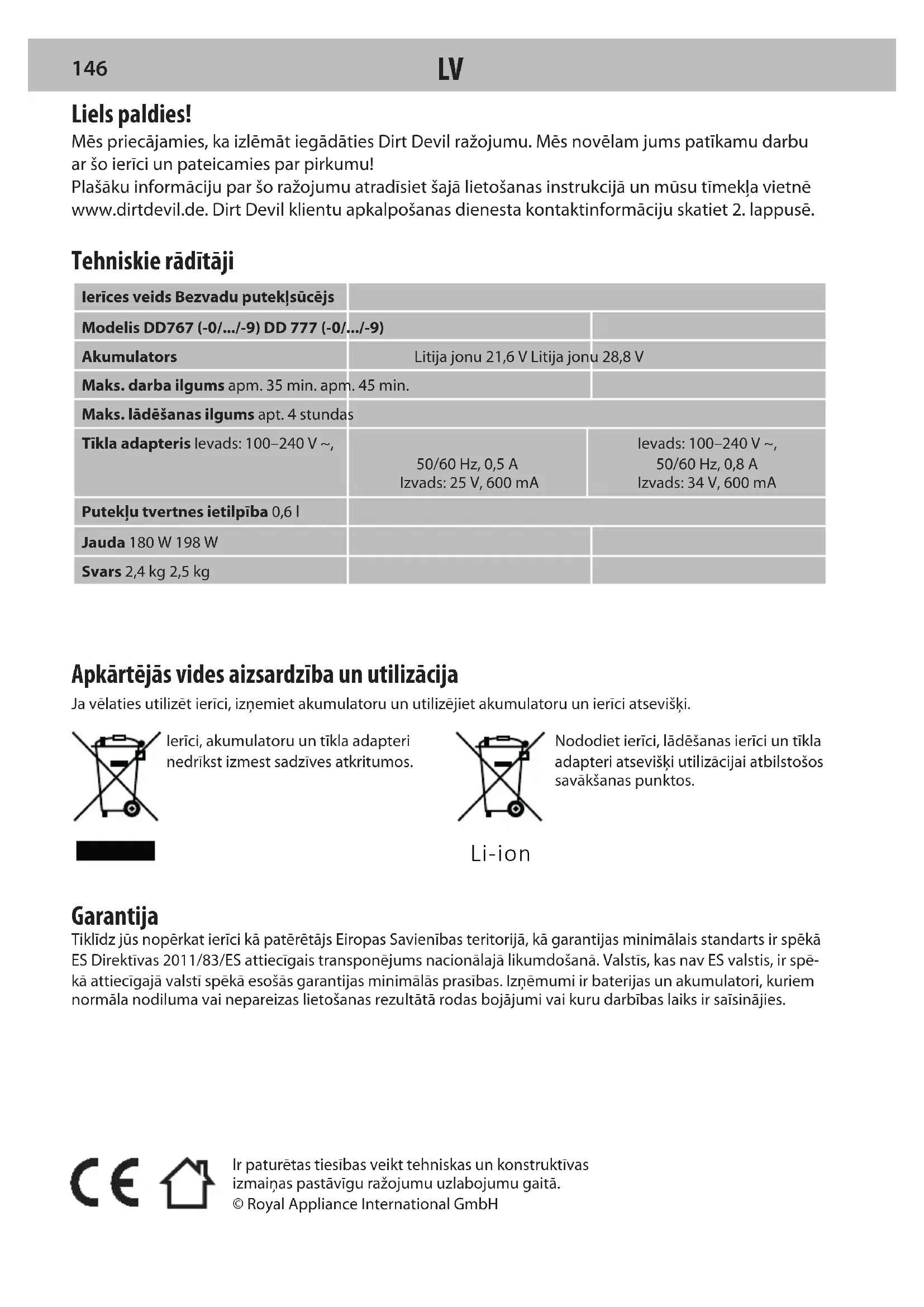 145Ir paturētas tiesības veikt tehniskas un konstruktīvas izmaiņas pastāvīgu ražojumu uzlabojumu gaitā.© Royal Appliance International GmbH Liels paldies! Mēs priecājamies, ka izlēmāt iegādāties Dirt Devil ražojumu. Mēs novēlam jums patīkamu darbu ar šo ierīci un pateicamies par pirkumu! Plašāku informāciju par šo ražojumu atradīsiet šajā lietošanas instrukcijā un mūsu tīmekļa vietnē www.dirtdevil.de. Dirt Devil klientu apkalpošanas dienesta kontaktinformāciju skatiet 2.lappusē. Tehniskie rādītāji Ierīces veids Bezvadu putekļsūcējsModelis DD767 (-0/.../-9) DD 777 (-0/.../-9)AkumulatorsLitija jonu 21,6 V Litija jonu 28,8 VMaks. darba ilgums apm. 35 min. apm. 45 min.Maks. lādēšanas ilgums apt. 4 stundasTīkla adapteris Ievads: 100–240 V ~, 50/60 Hz, 0,5 A Izvads: 25 V, 600 mAIevads: 100–240 V ~, 50/60 Hz, 0,8 A Izvads: 34 V, 600 mAPutekļu tvertnes ietilpība 0,6 lJauda 180 W 198 WSvars 2,4 kg 2,5 kg Apkārtējās vides aizsardzība un utilizācija Ja vēlaties utilizēt ierīci, izņemiet akumulatoru un utilizējiet akumulatoru un ierīci atsevišķi.Ierīci, akumulatoru un tīkla adapteri nedrīkst izmest sadzīves atkritumos.Nododiet ierīci, lādēšanas ierīci un tīkla adapteri atsevišķi utilizācijai atbilstošos savākšanas punktos. Garantija Tiklīdz jūs nopērkat ierīci kā patērētājs Eiropas Savienības teritorijā, kā garantijas minimālais standarts ir spēkā ES Direktīvas 2011/83/ES attiecīgais transponējums nacionālajā likumdošanā. Valstīs, kas nav ES valstis, ir spē-kā attiecīgajā valstī spēkā esošās garantijas minimālās prasības. Izņēmumi ir baterijas un akumulatori, kuriem normāla nodiluma vai nepareizas lietošanas rezultātā rodas bojājumi vai kuru darbības laiks ir saīsinājies. Li-ion